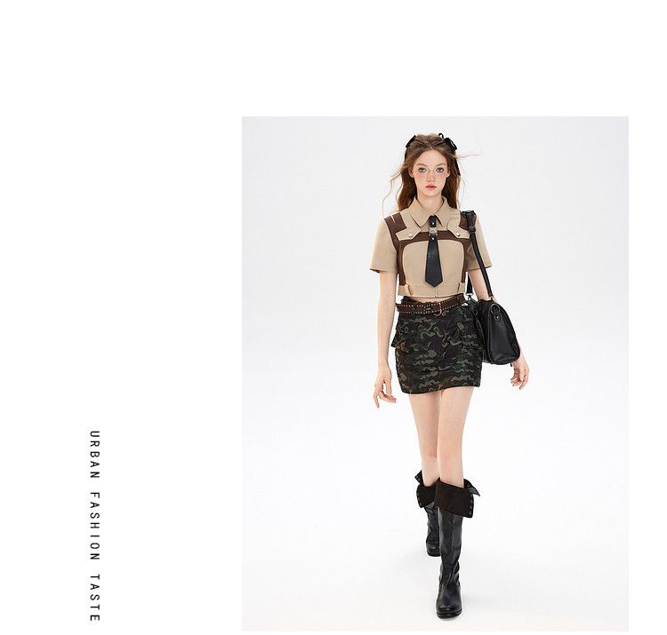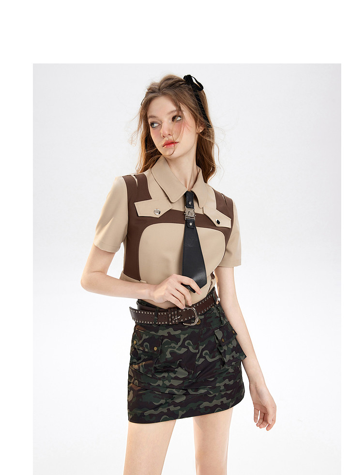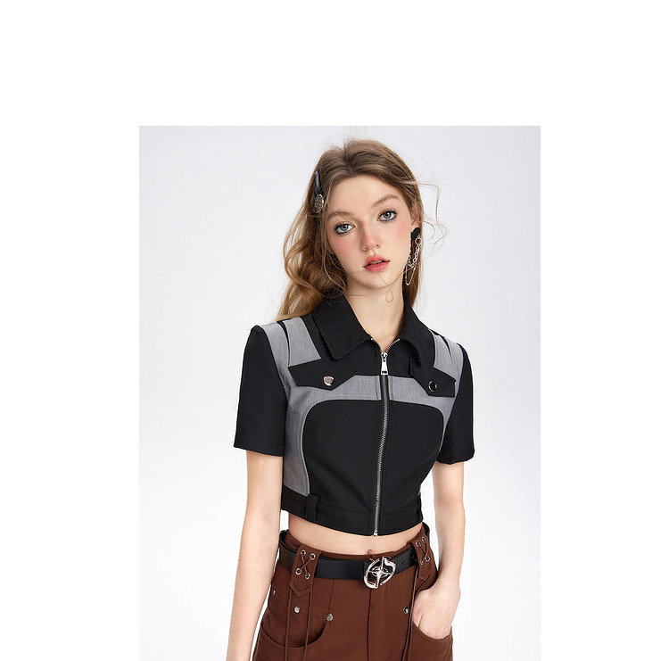夏装美式复古学院风衬衫女撞色拼接正肩露脐短上衣 686804