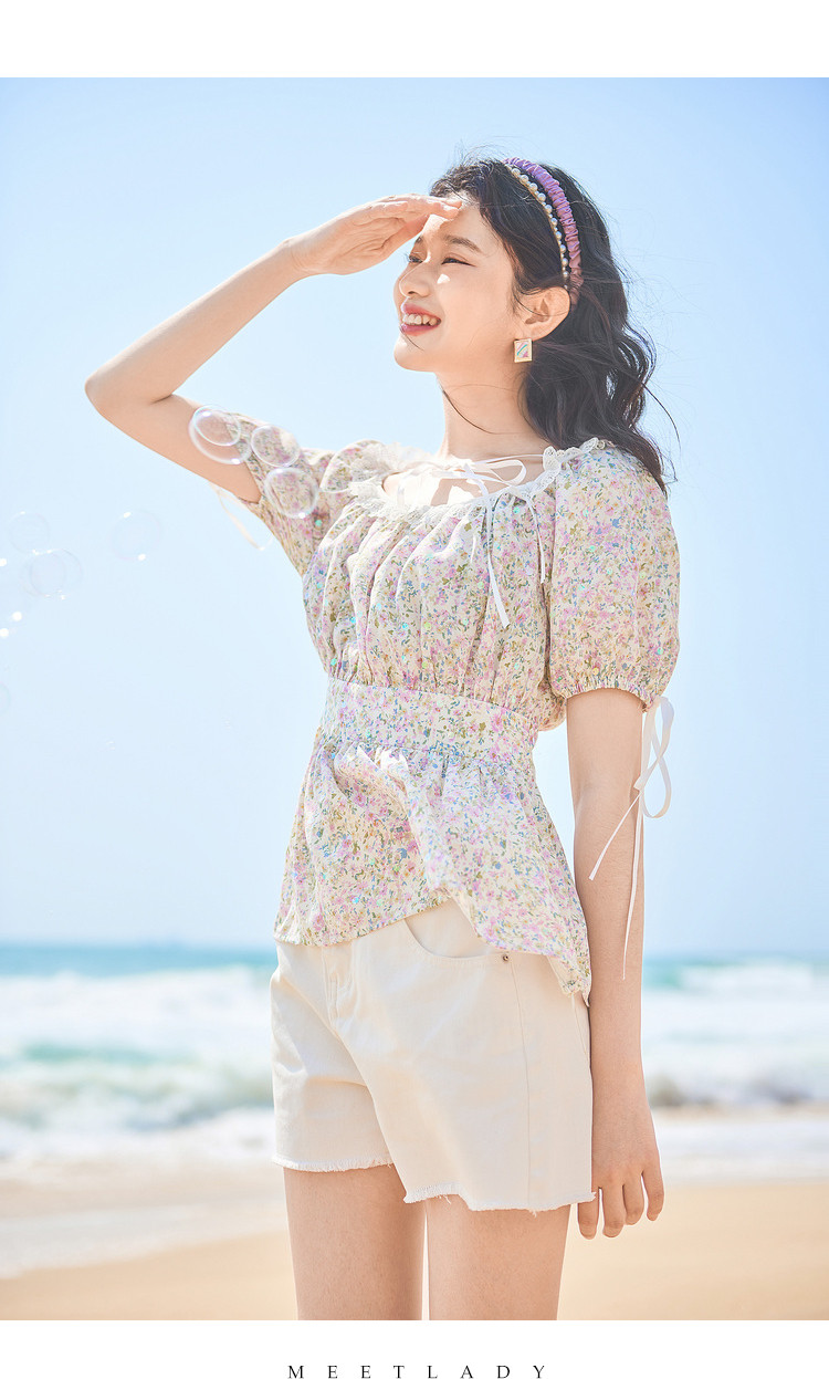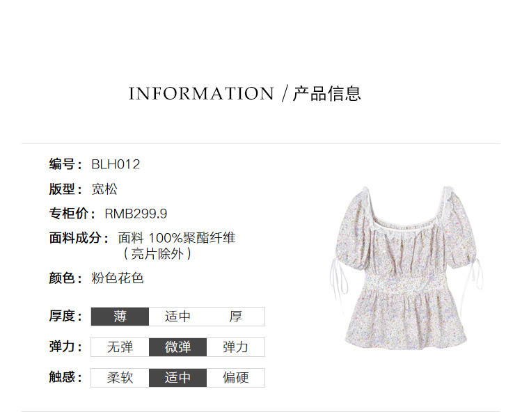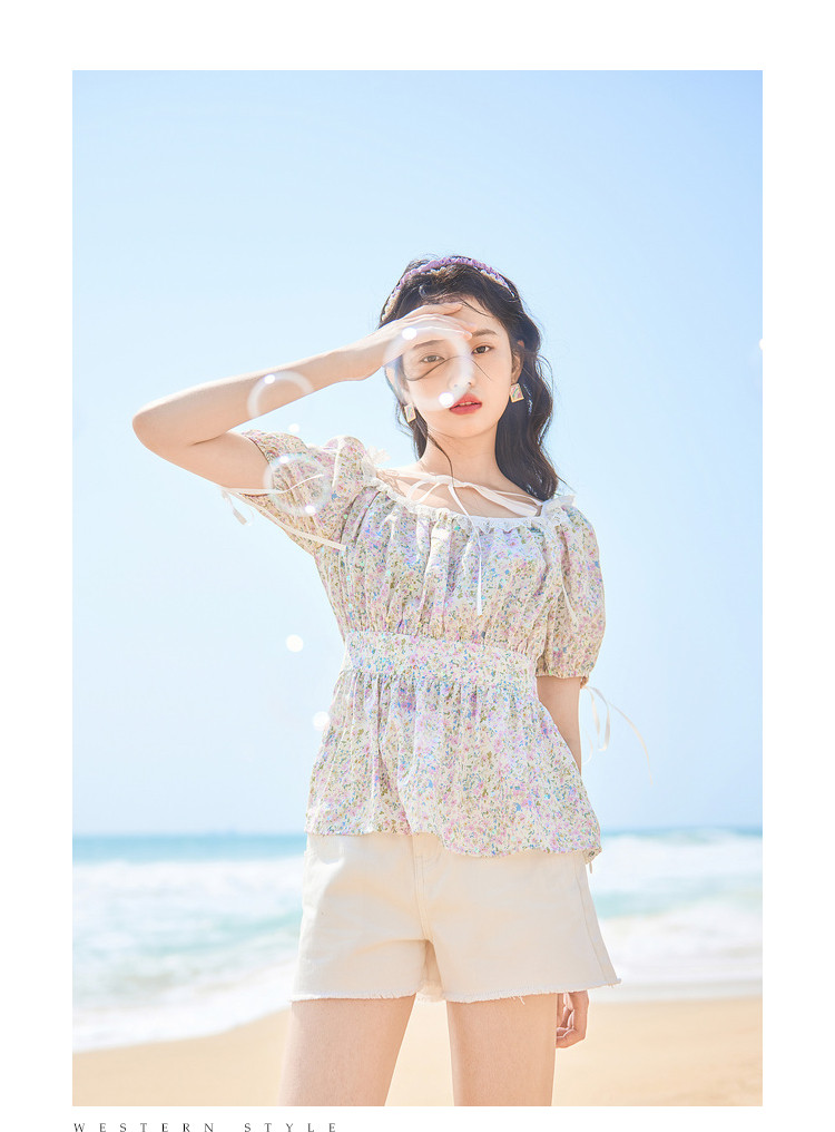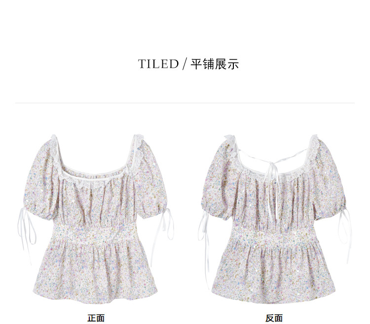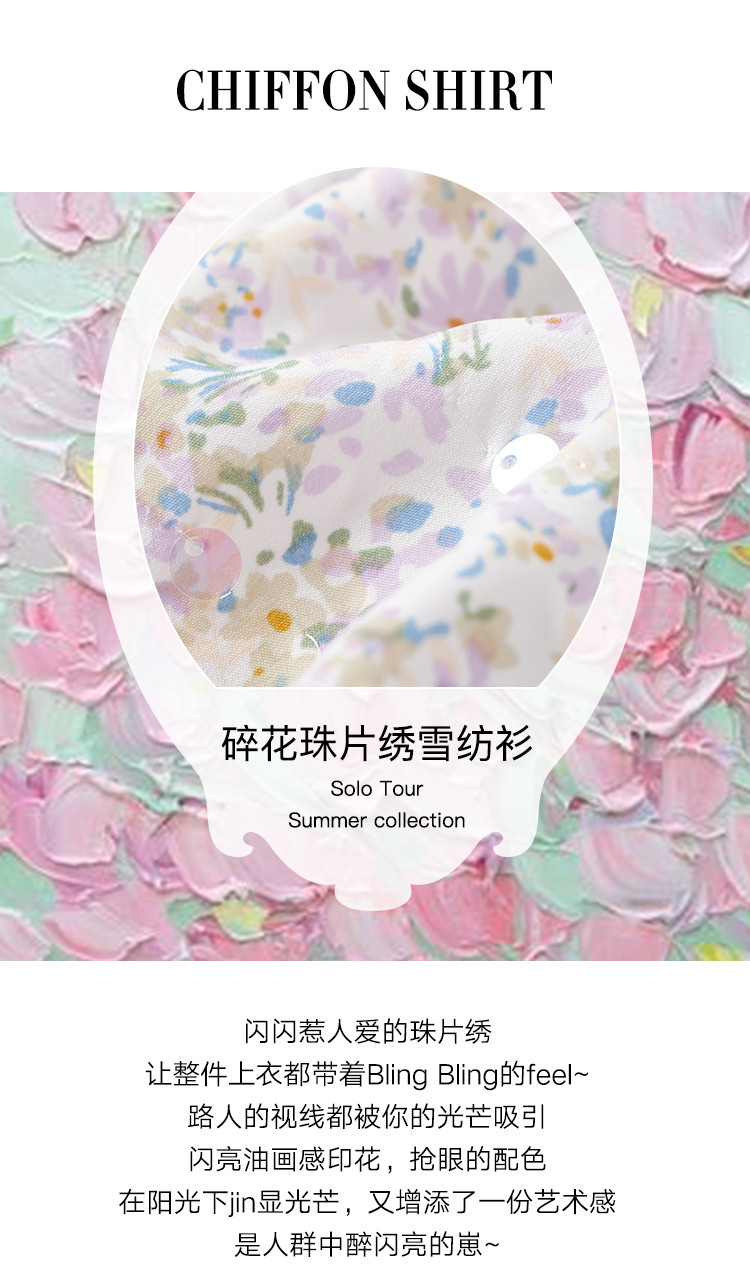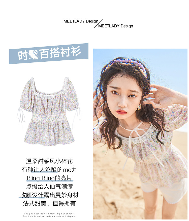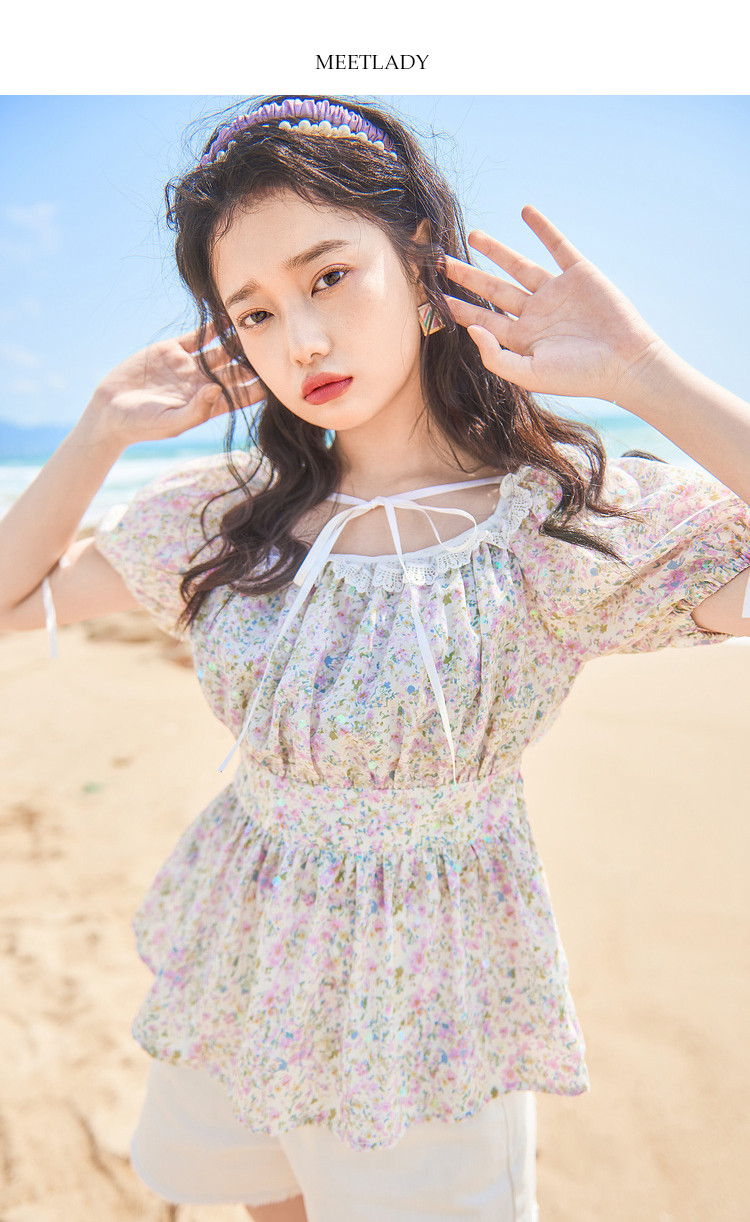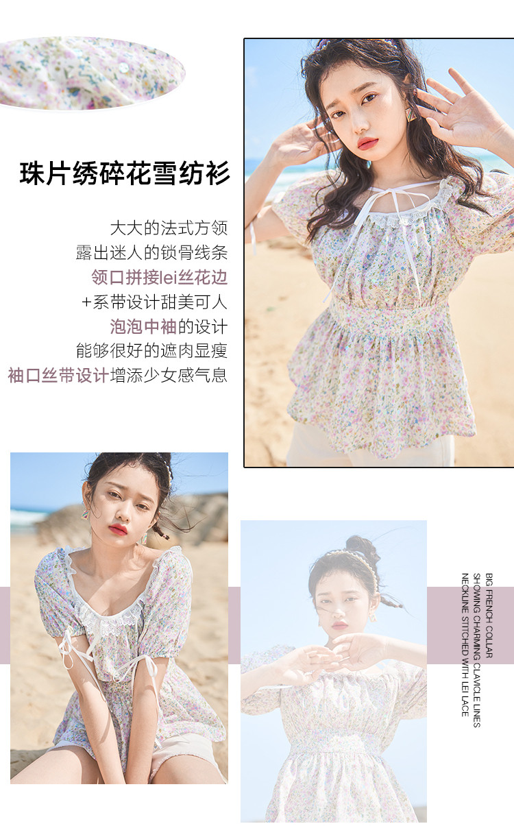 商品名称:夏装方领绑带泡泡袖雪纺衫女收腰时尚亮片印花衬衫 678868
