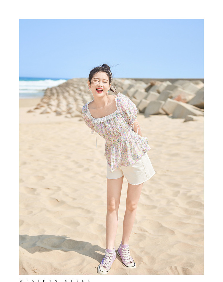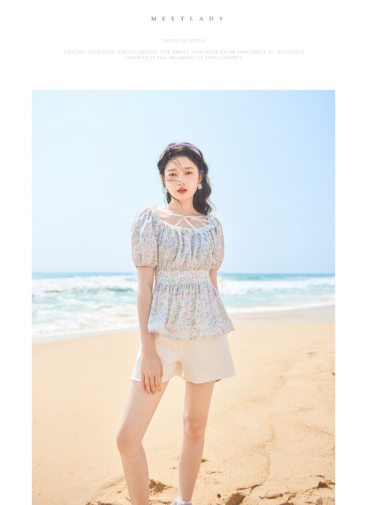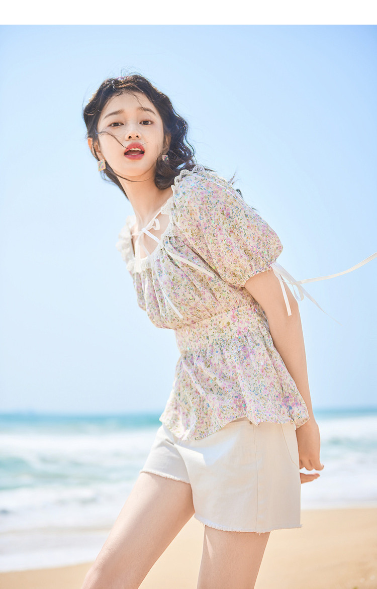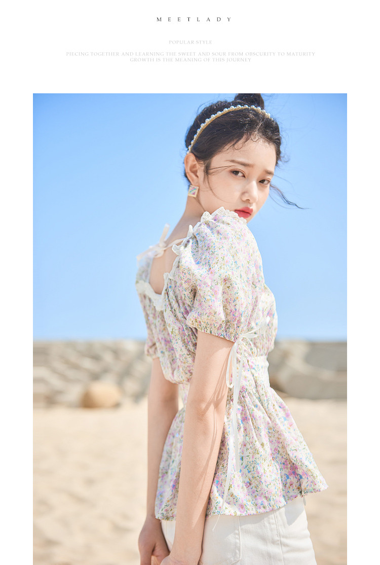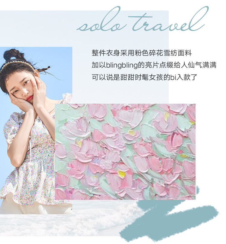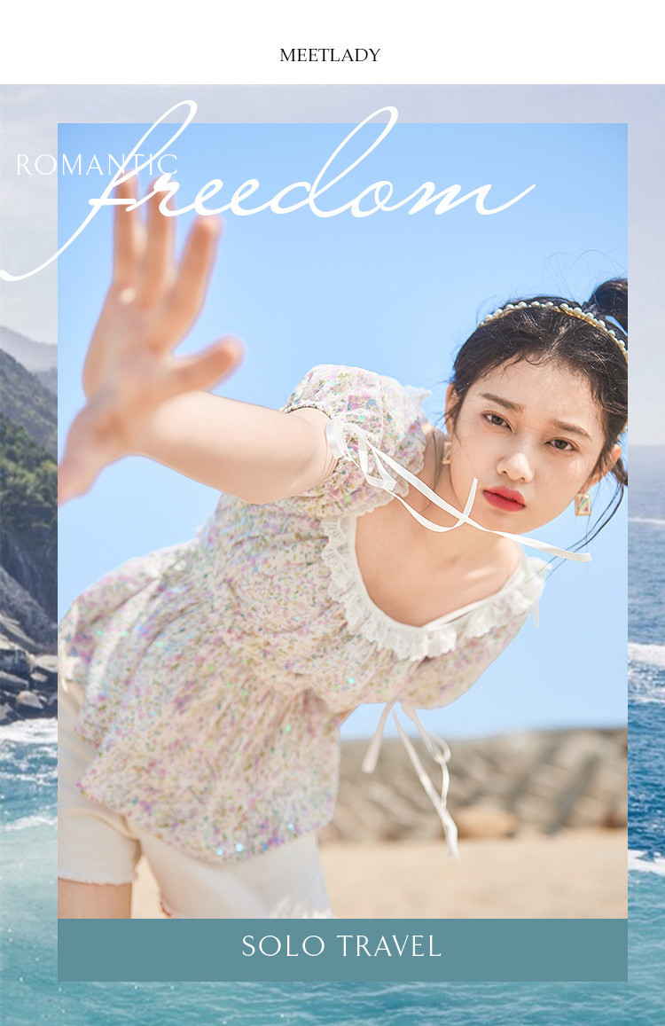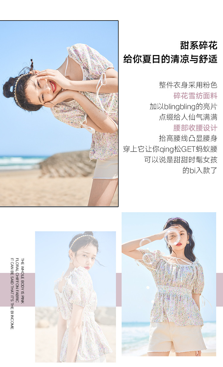 商品名称:夏装方领绑带泡泡袖雪纺衫女收腰时尚亮片印花衬衫 678868