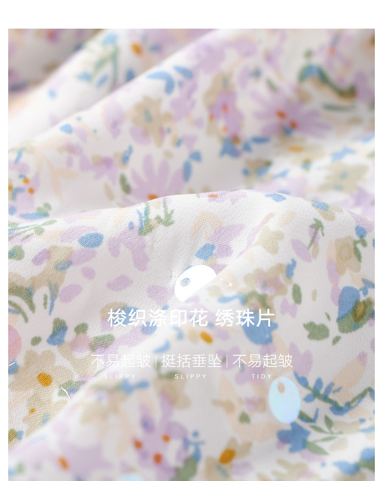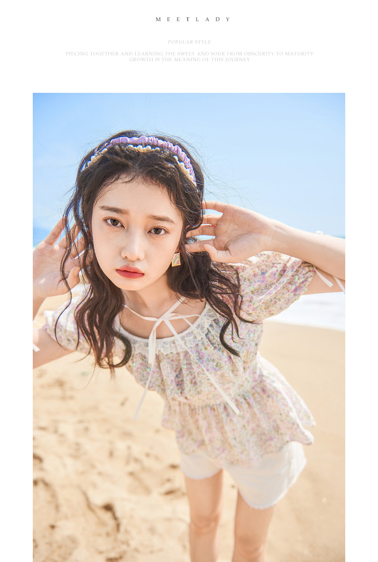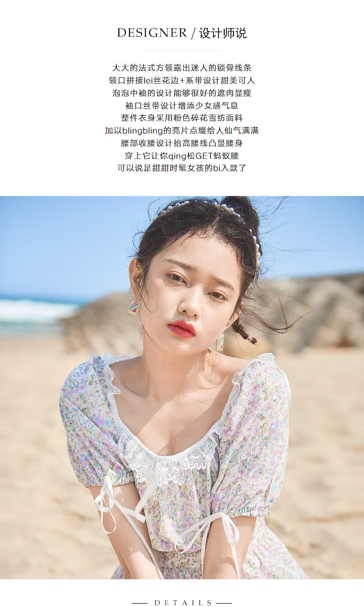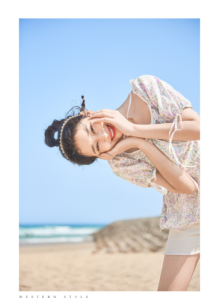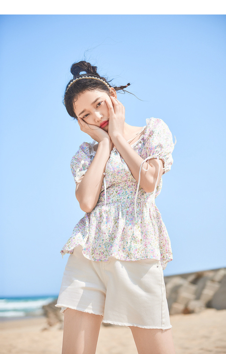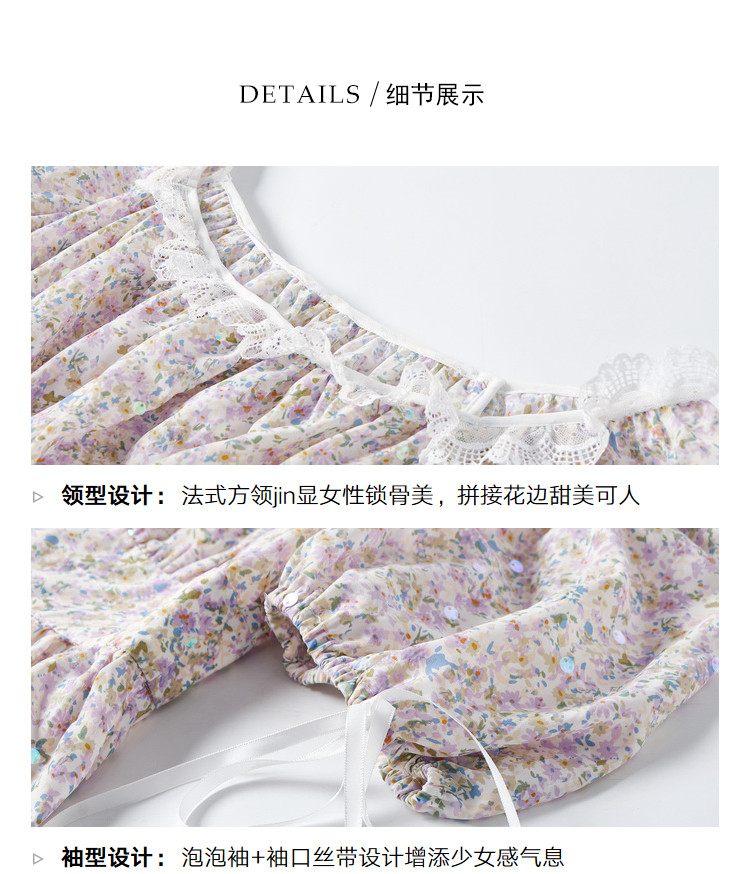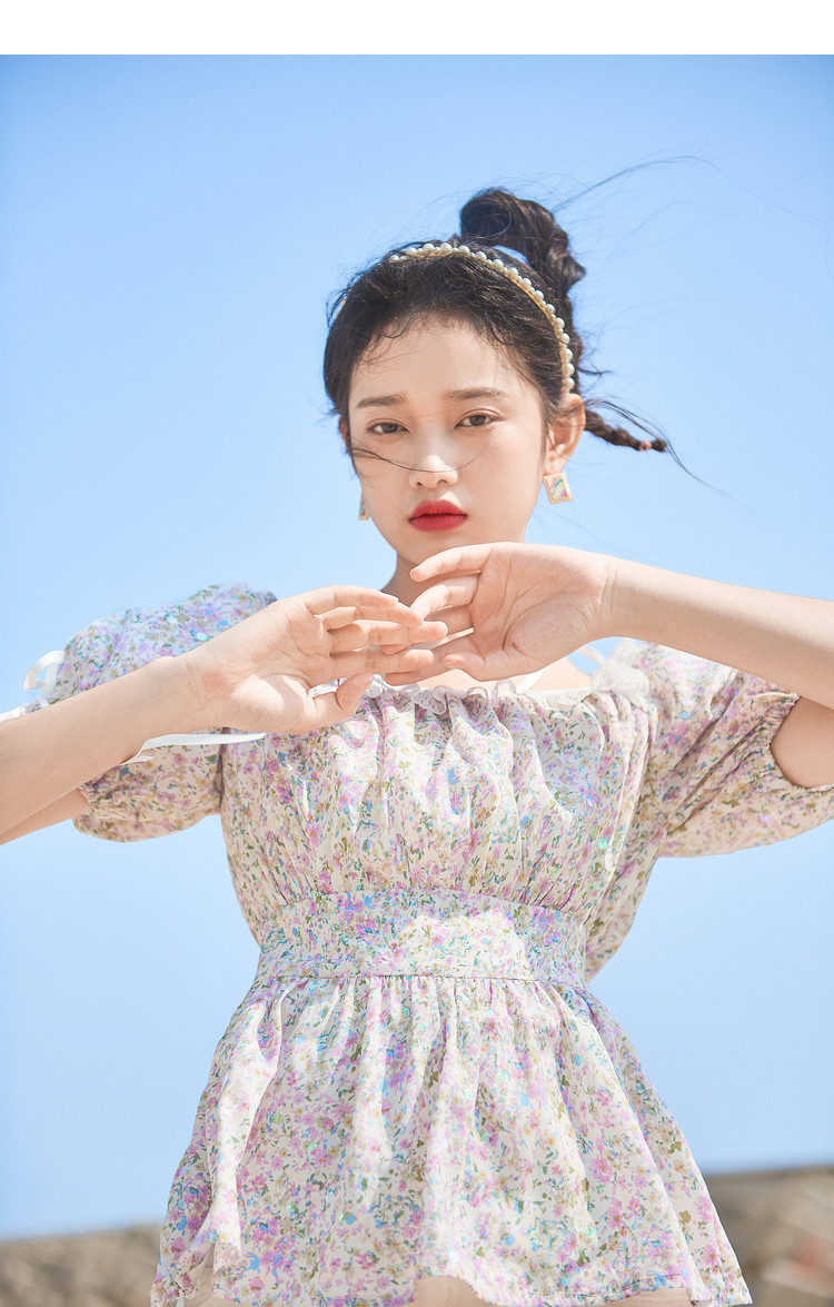 商品名称:夏装方领绑带泡泡袖雪纺衫女收腰时尚亮片印花衬衫 678868