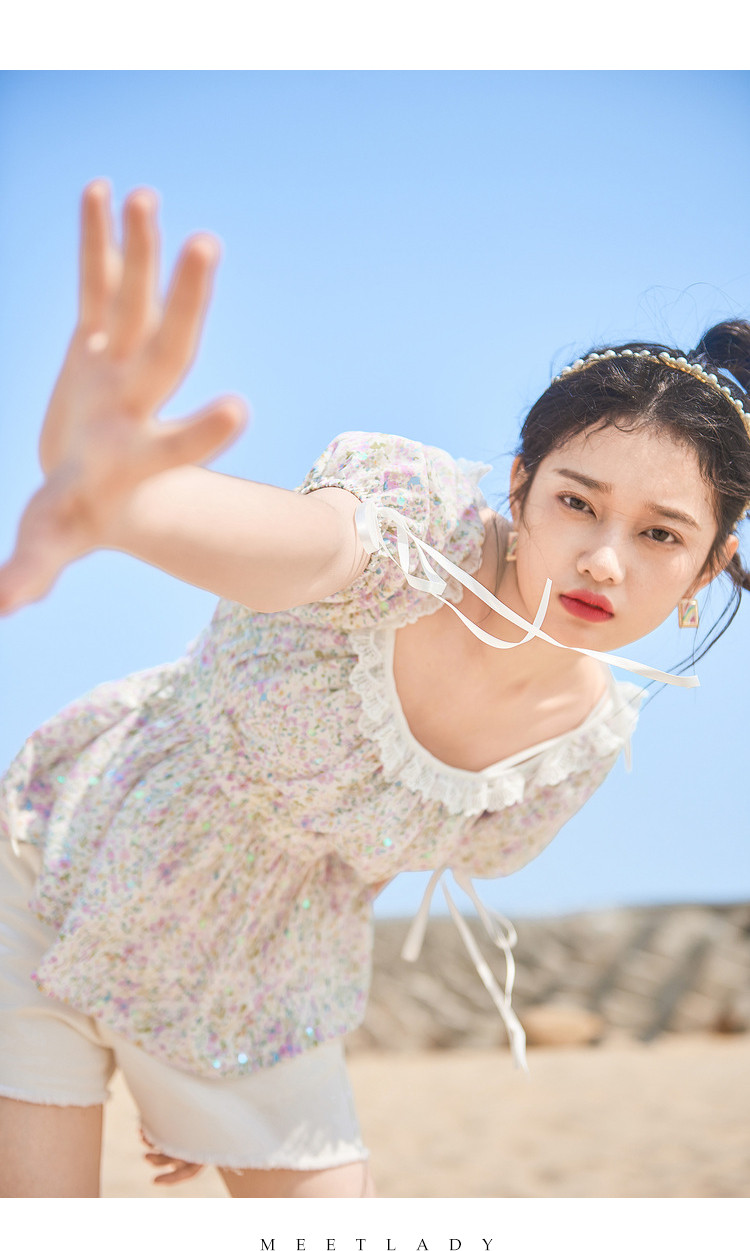 夏装方领绑带泡泡袖雪纺衫女收腰时尚亮片印花衬衫 678868