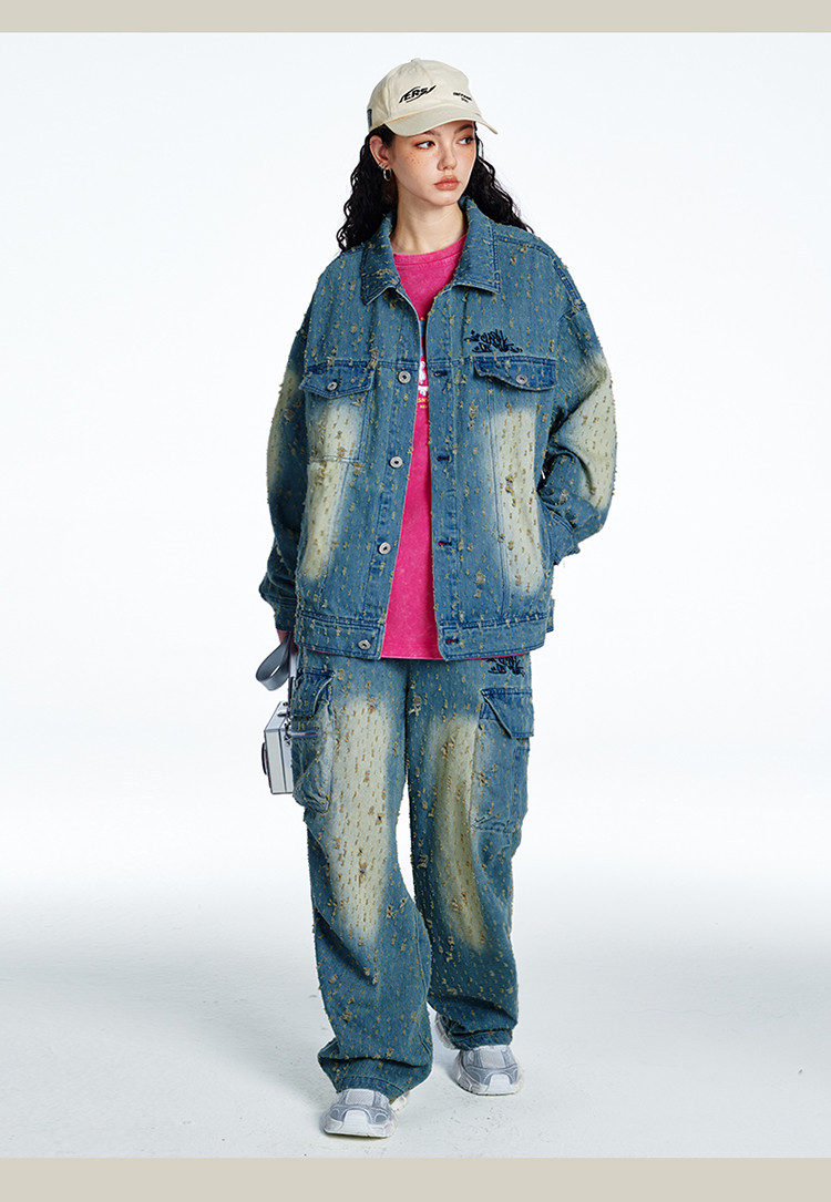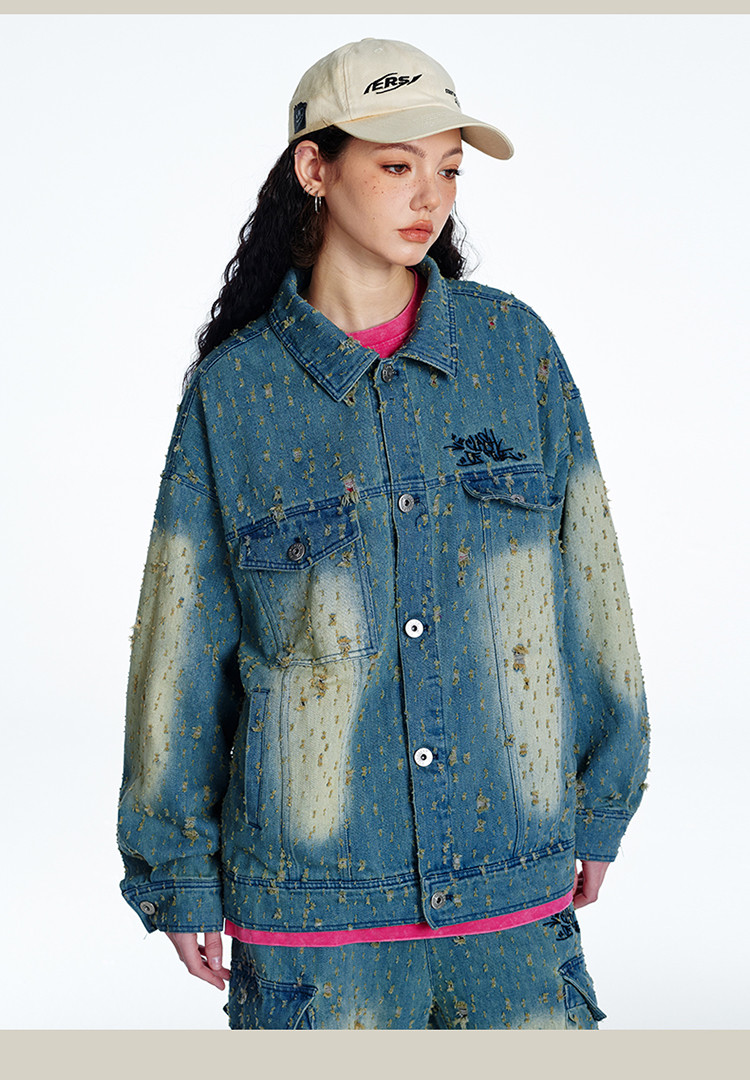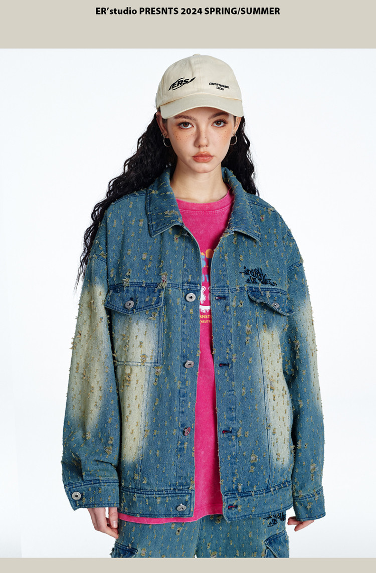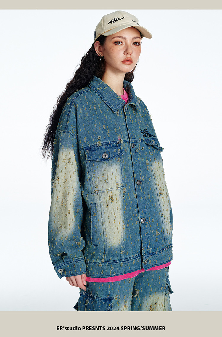 做旧破洞水洗牛仔夹克2024春季新款高街潮牌情侣外套男女同款 344279