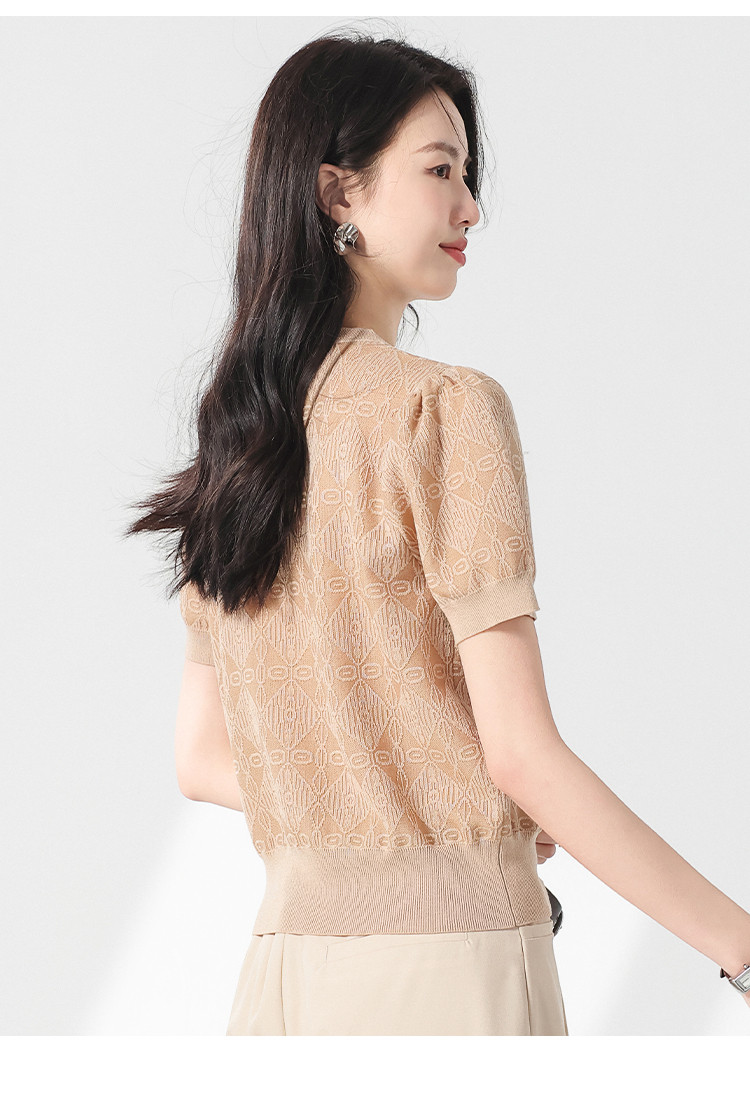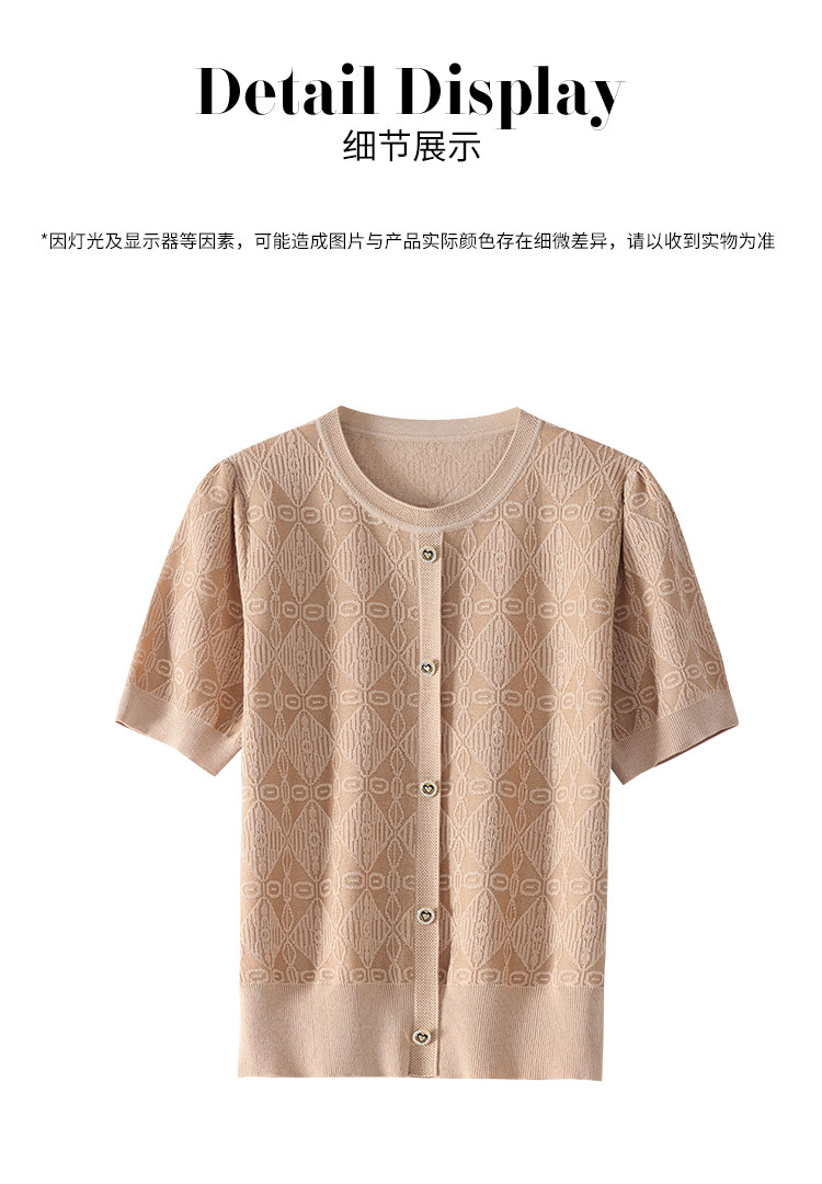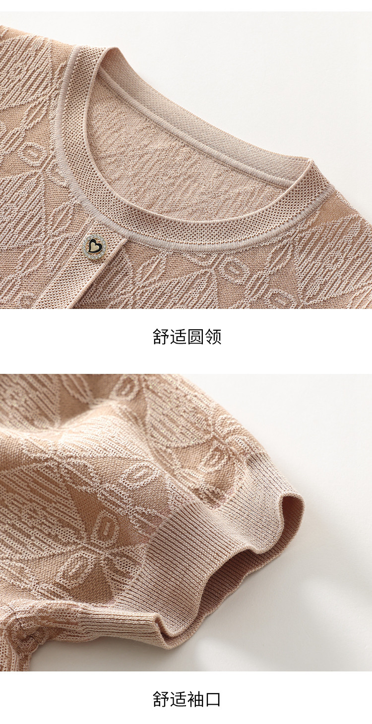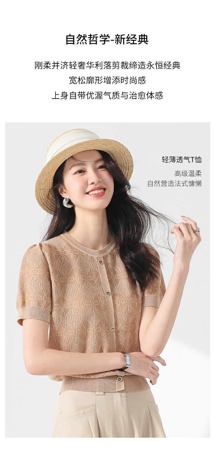 商品名称:夏款轻薄纯色提花含桑蚕丝针织衫女开衫打底假开衫短袖T恤 079059
