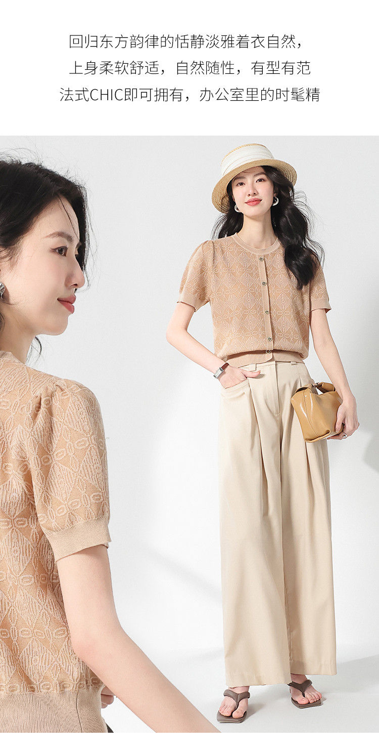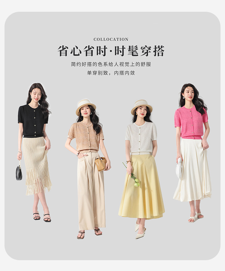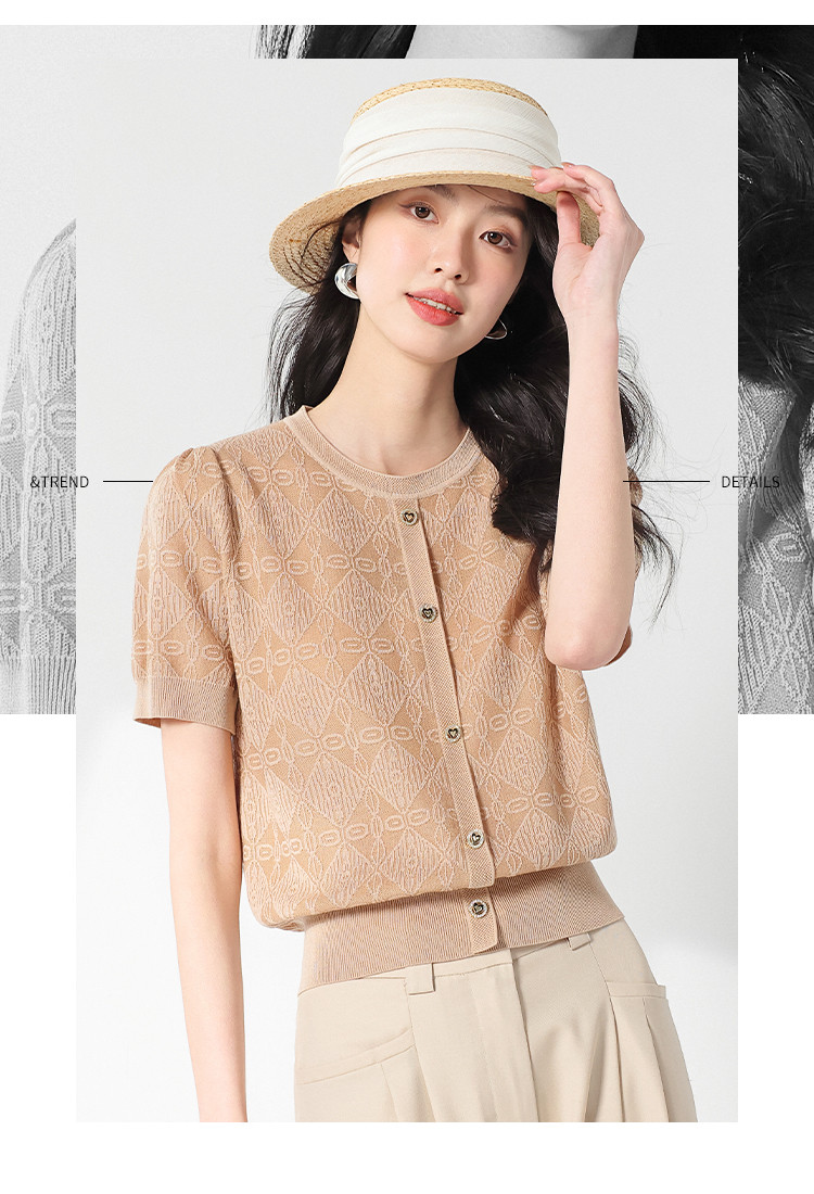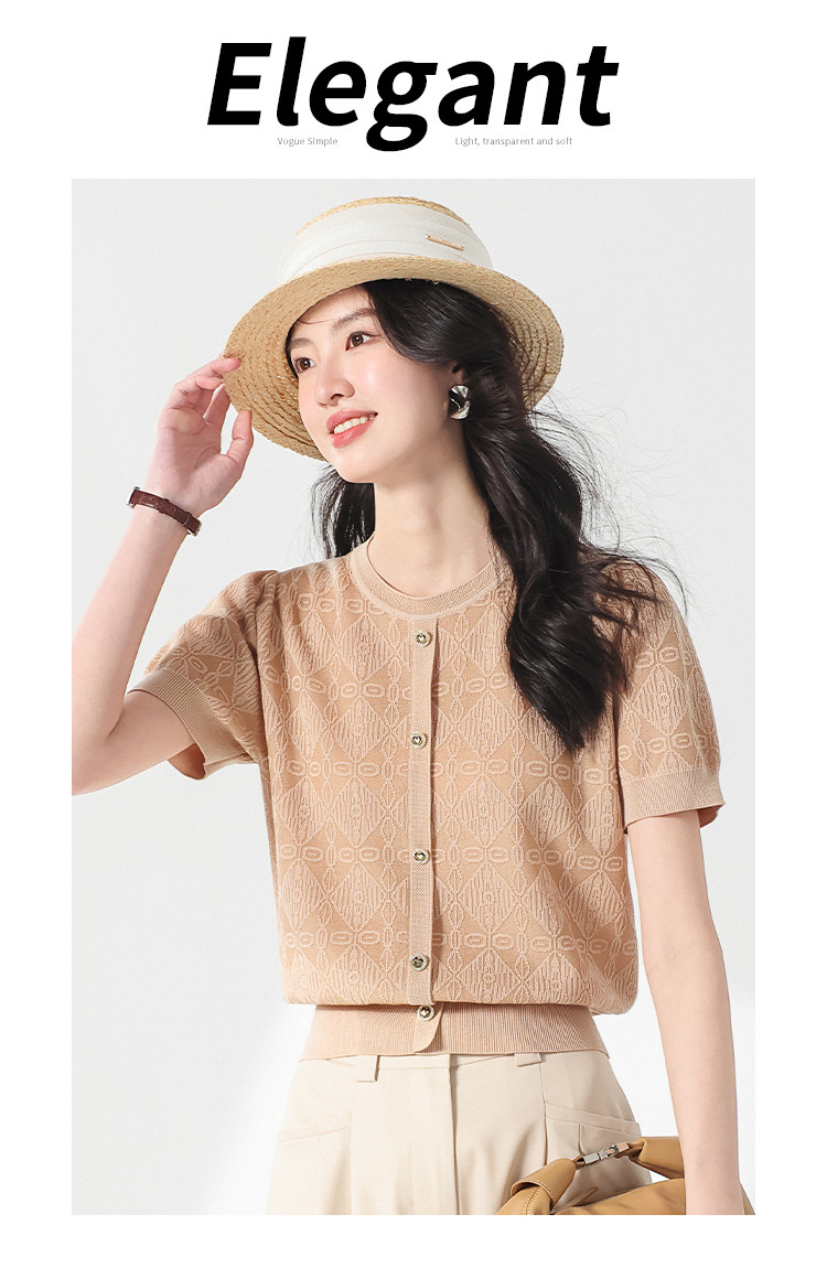 商品名称:夏款轻薄纯色提花含桑蚕丝针织衫女开衫打底假开衫短袖T恤 079059
