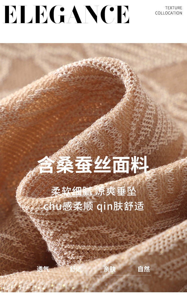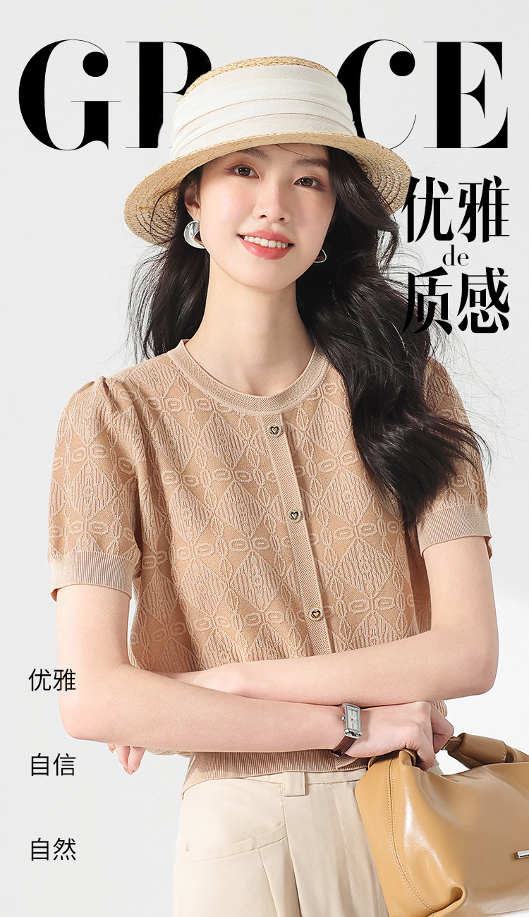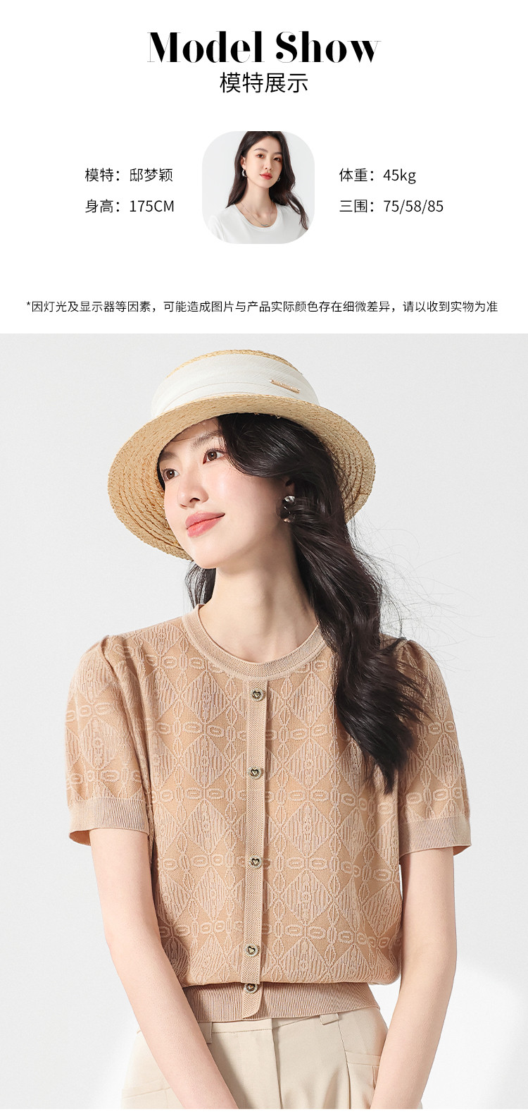 夏款轻薄纯色提花含桑蚕丝针织衫女开衫打底假开衫短袖T恤 079059