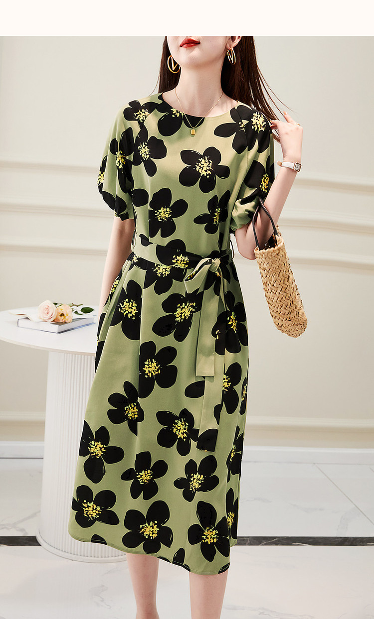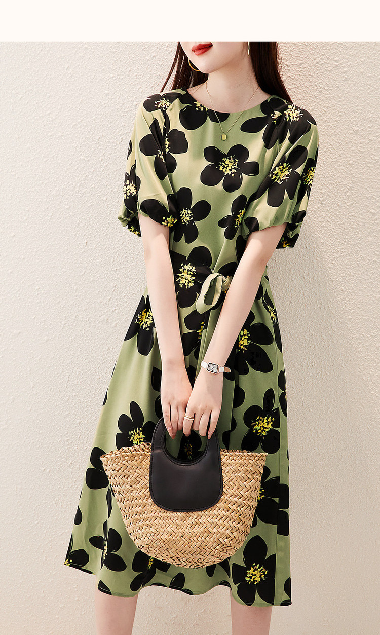 【浪漫印花淑女裙】夏圆领灯笼袖系带连衣裙女中长款 278849