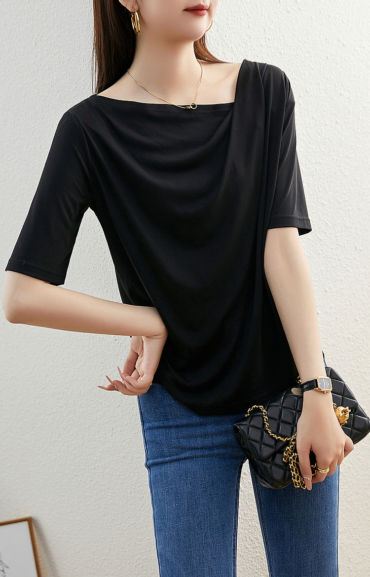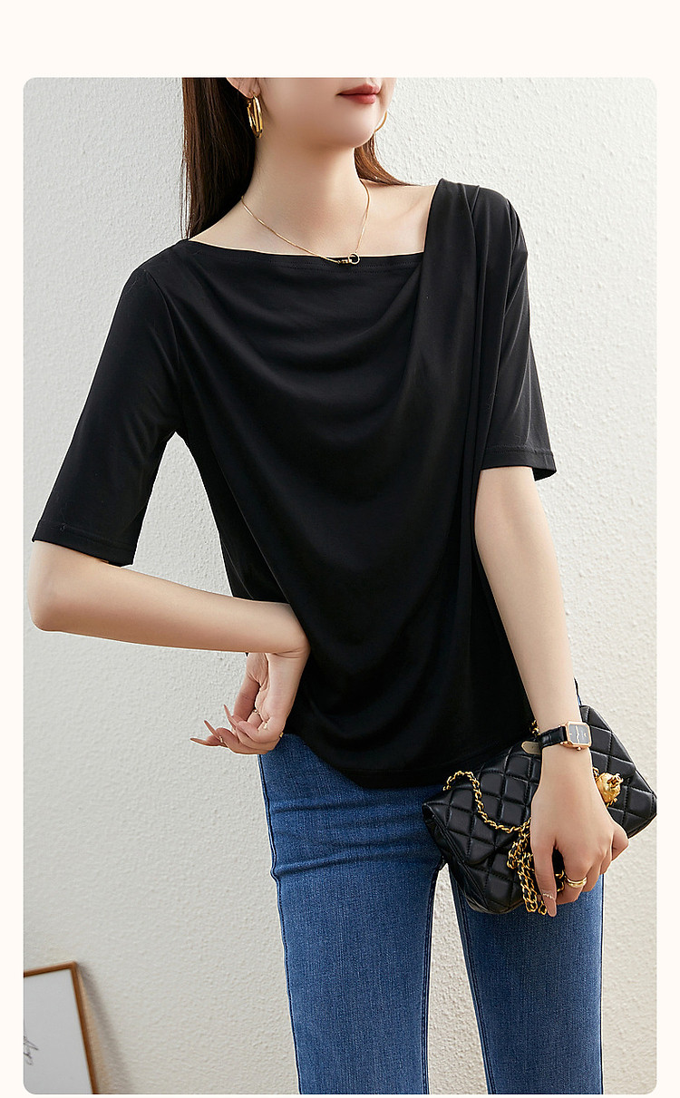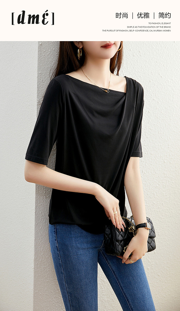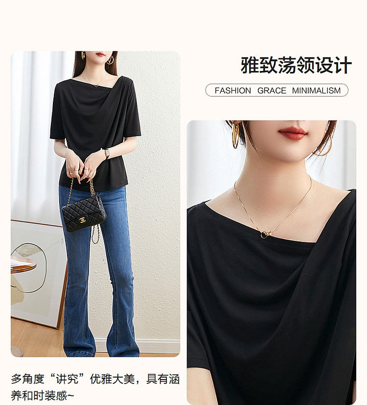 商品名称:【简约风荡领女式t恤】春秋微弹气质连肩中袖t恤女 010113