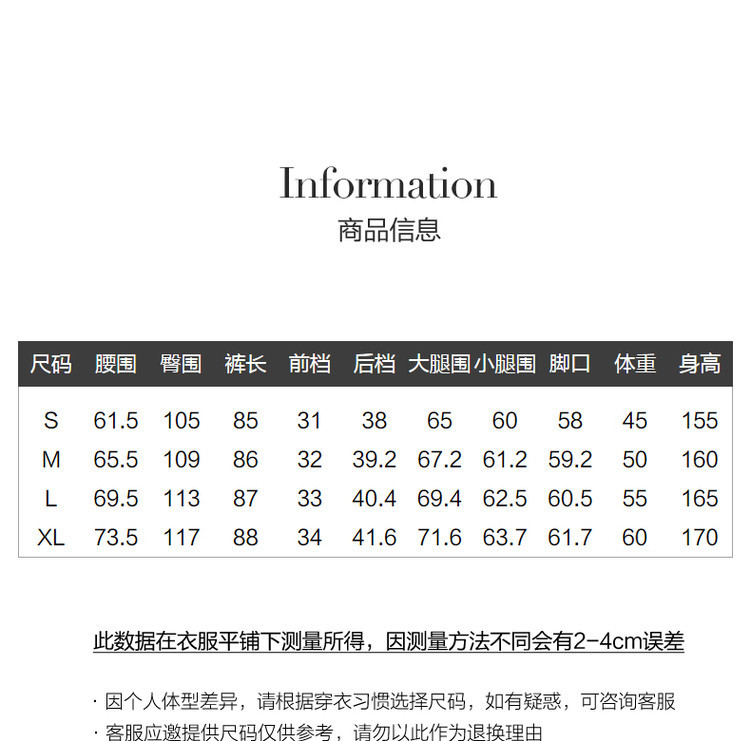 | 尺码 | 大腿围(cm) | 裤脚围(cm) | 前浪(cm) | 后浪(cm) | 腰围(cm) | 裤长(cm) | 膝围(cm) | 臀围(cm) | 号型 |