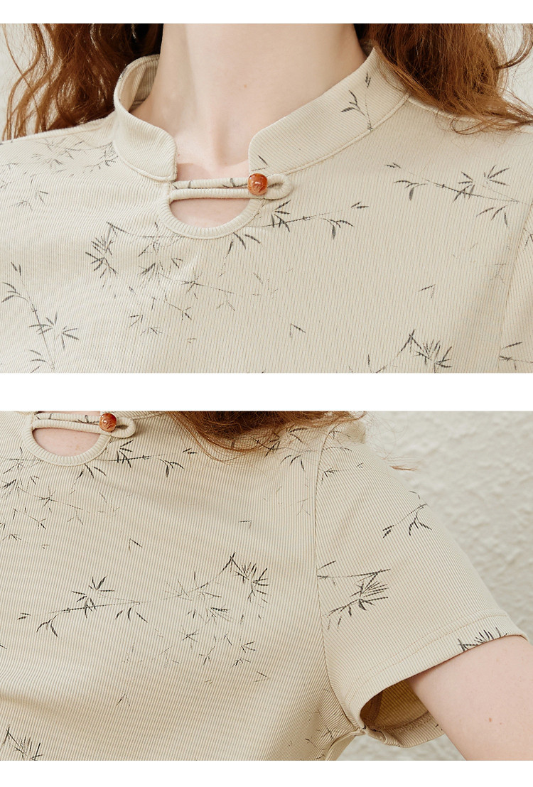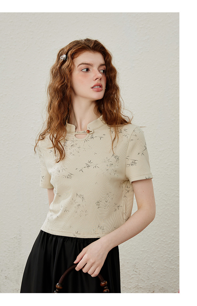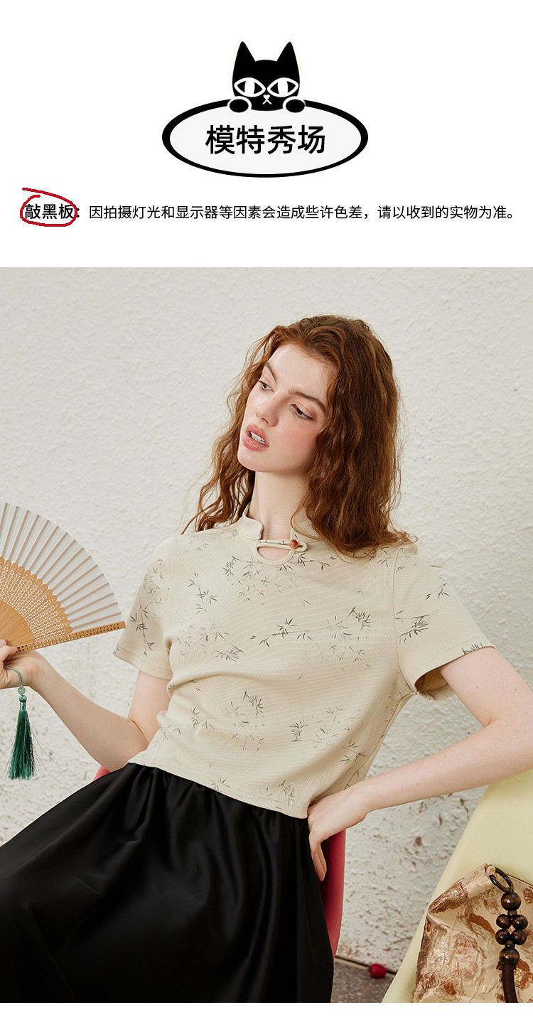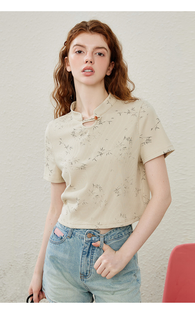 商品名称:国风印花气质设计感盘扣短款女式T恤夏季休闲短袖上衣 601309