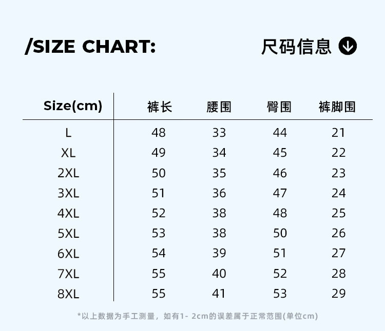 | 尺码 | 后浪(cm) | 裤脚围(cm) | 腰围(cm) | 裤长(cm) | 前浪(cm) | 臀围(cm) | 号型 |