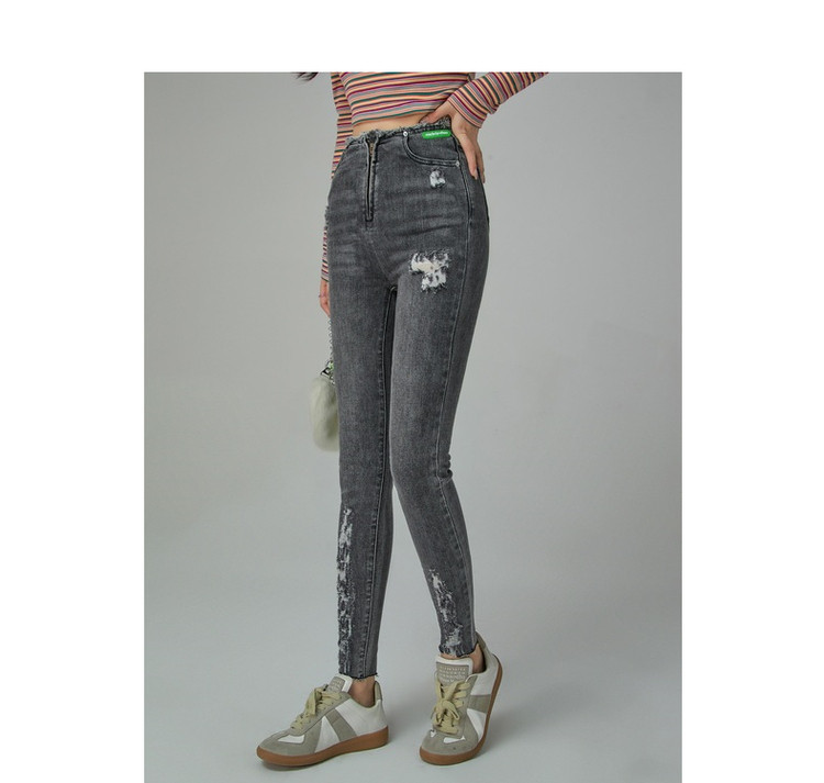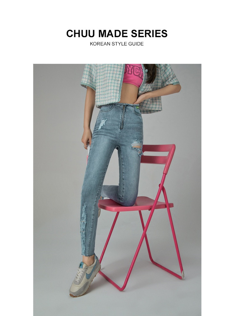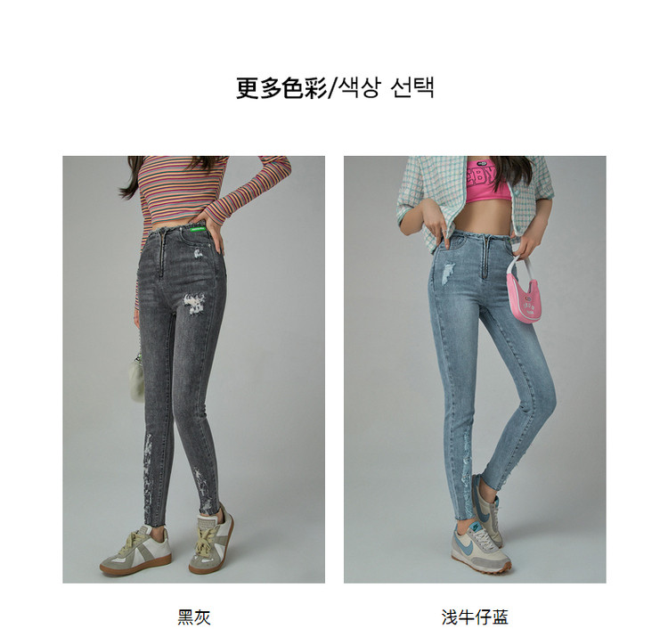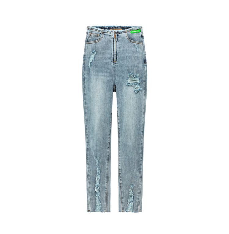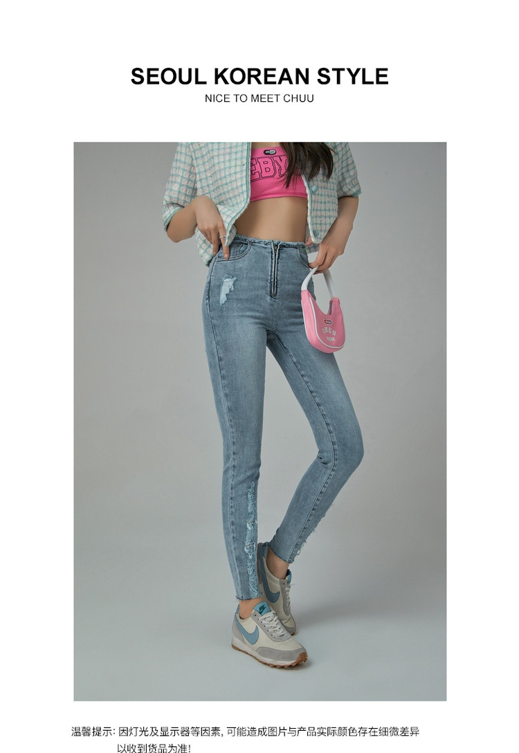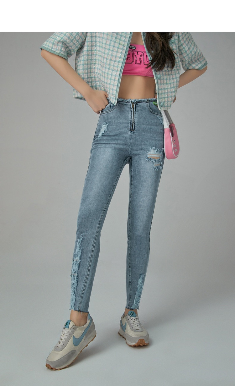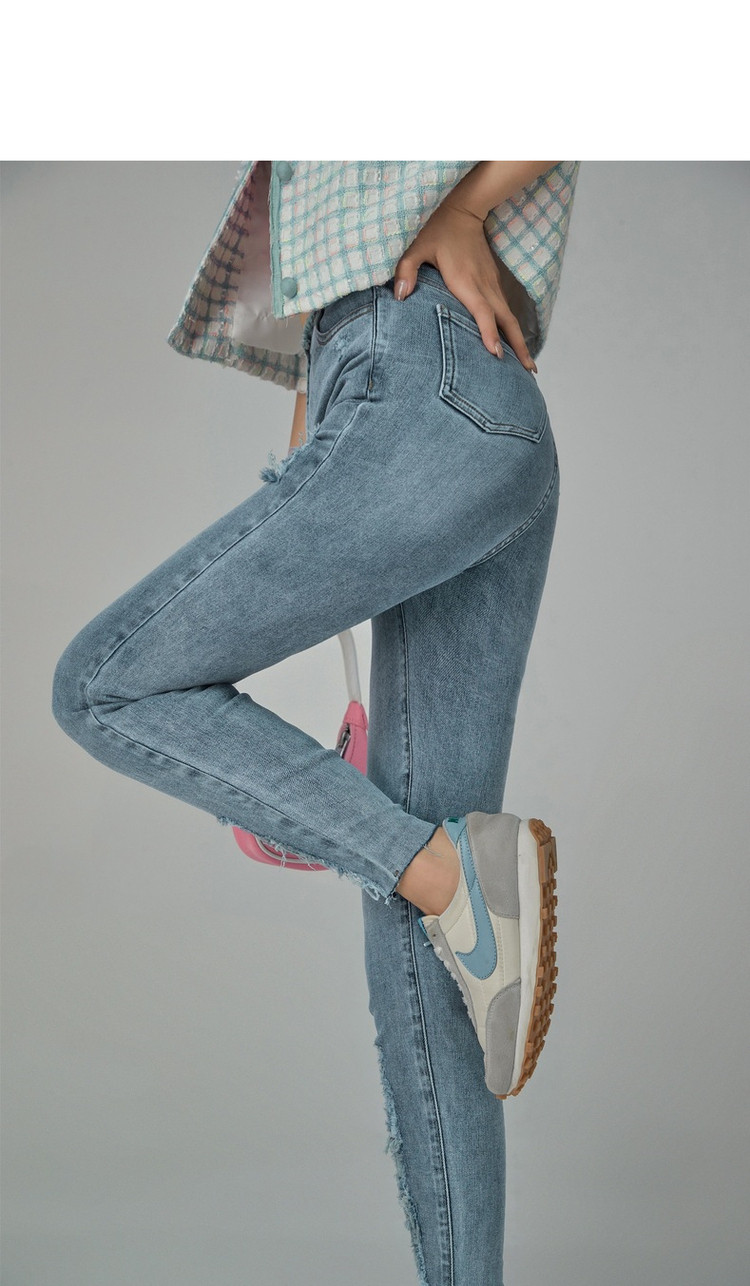 商品名称:破洞铅笔牛仔裤女春秋高腰修身小脚九分裤子 277011