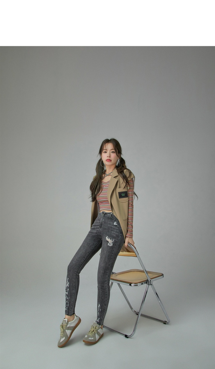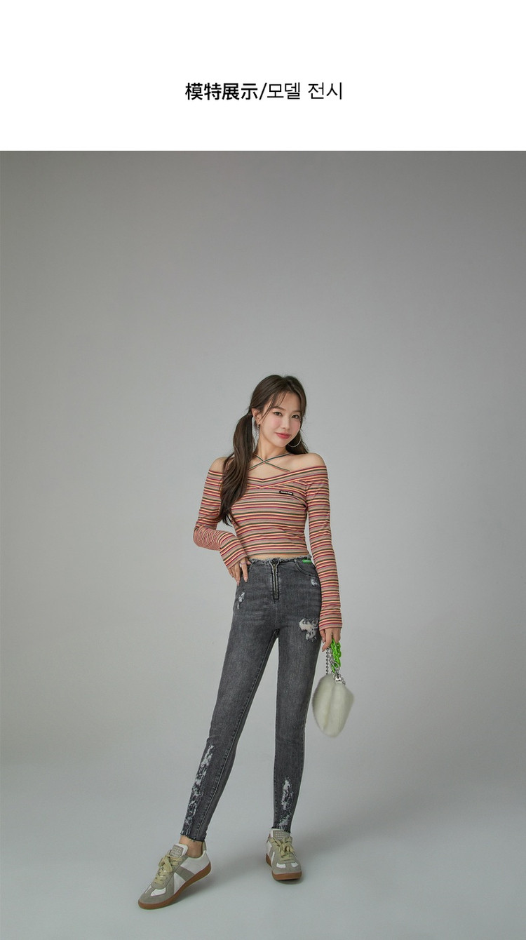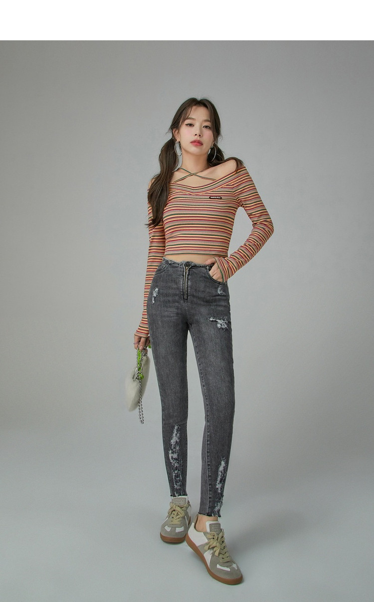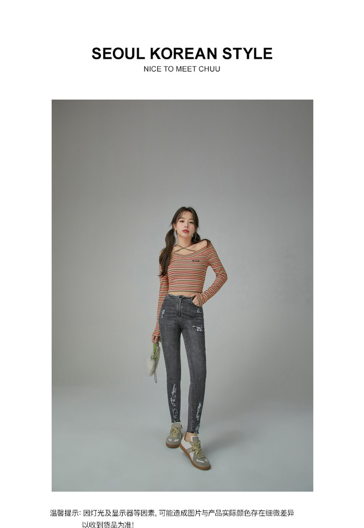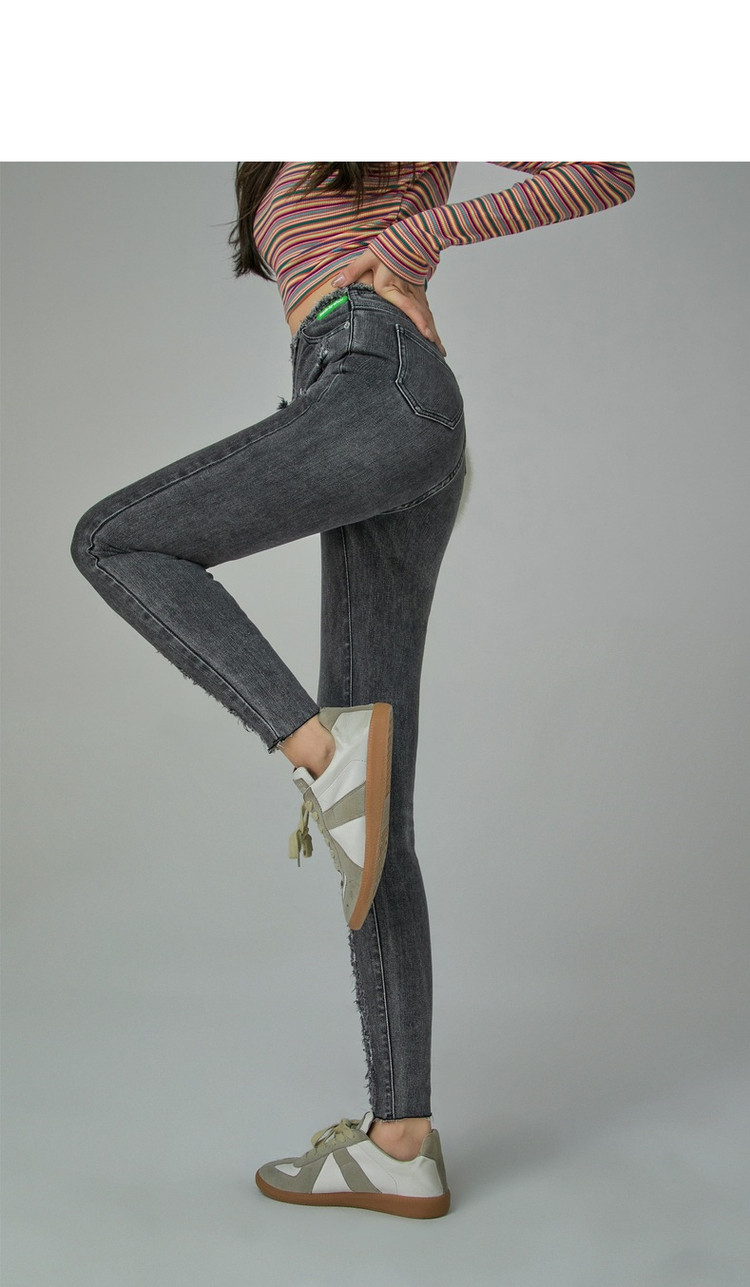 商品名称:破洞铅笔牛仔裤女春秋高腰修身小脚九分裤子 277011