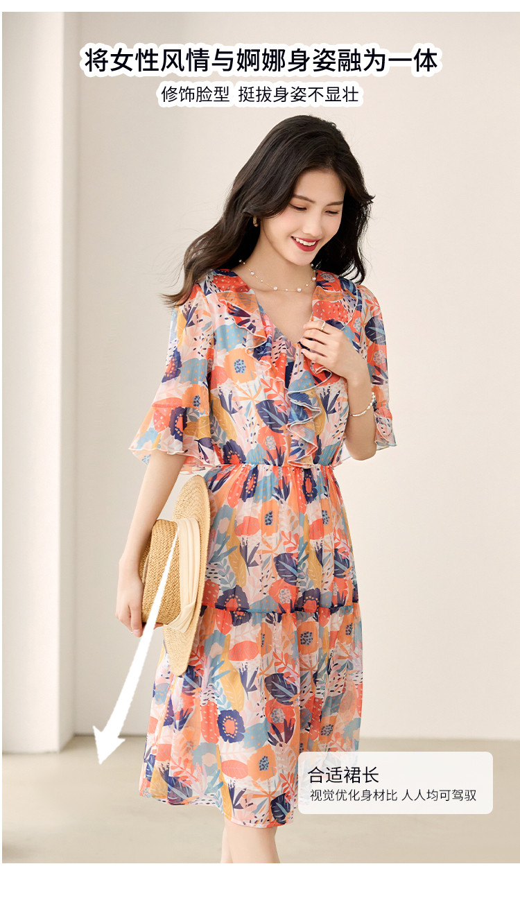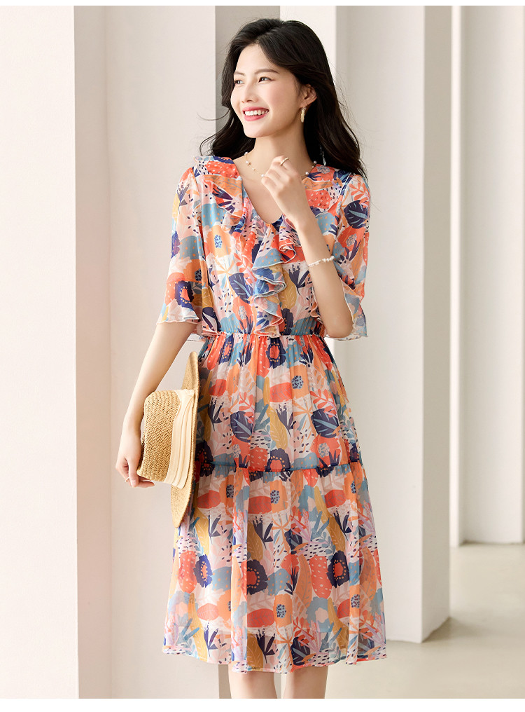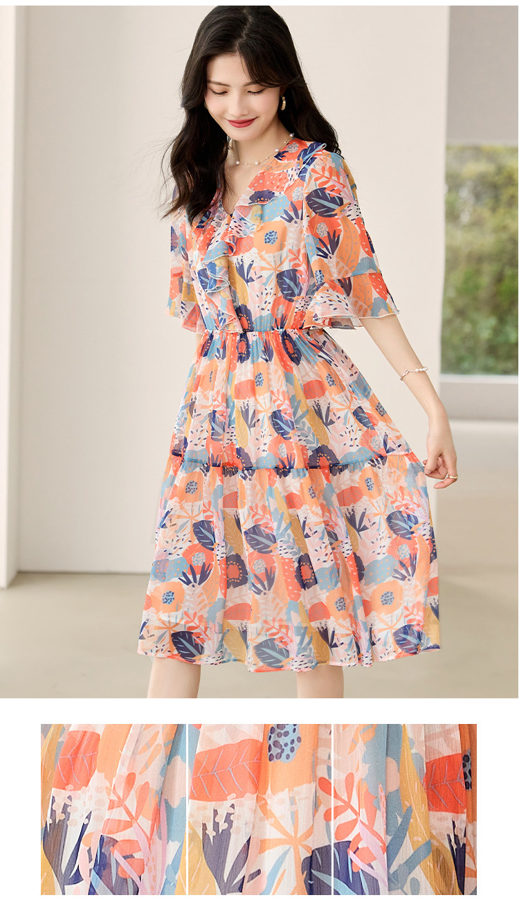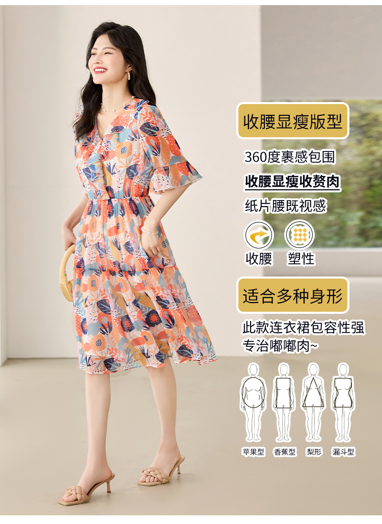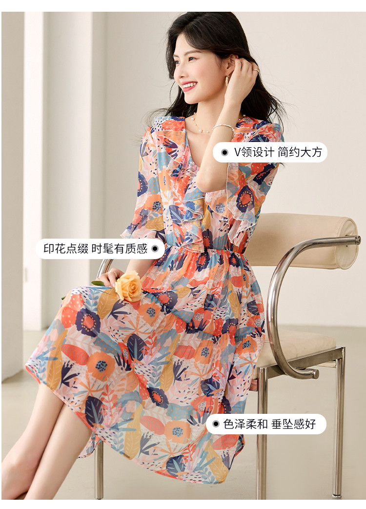 商品名称:淑女气质2025夏装女装时尚花边袖显瘦雪纺优雅轻奢连衣裙 454168