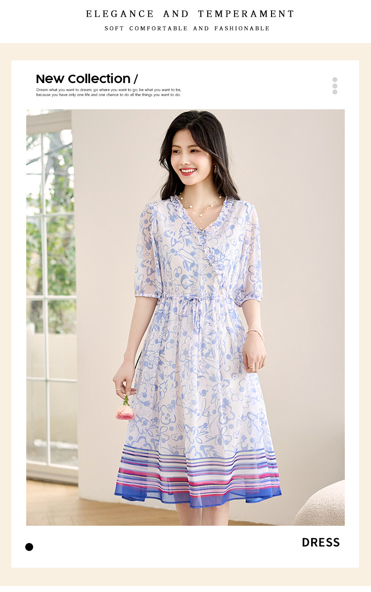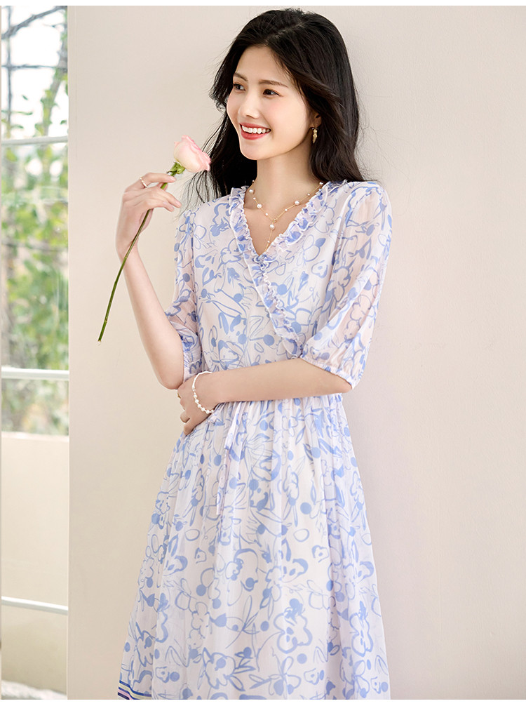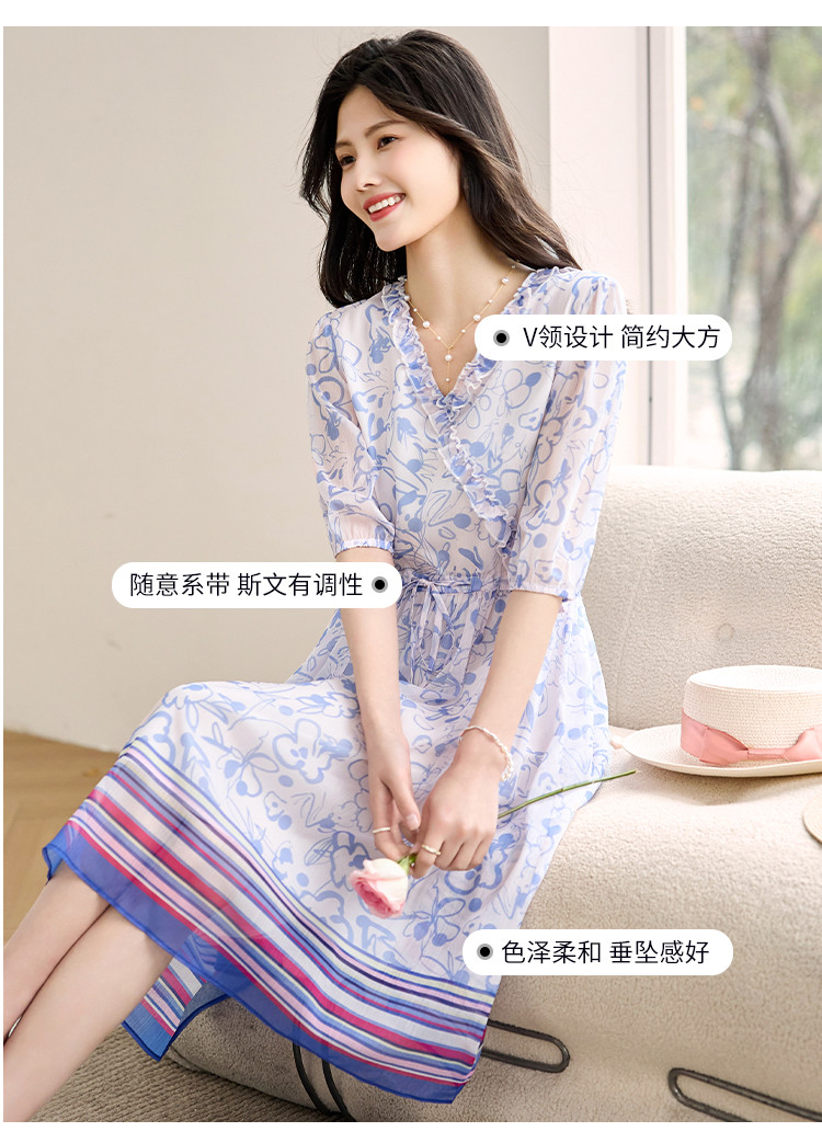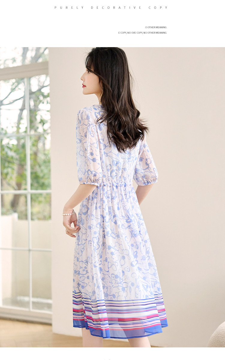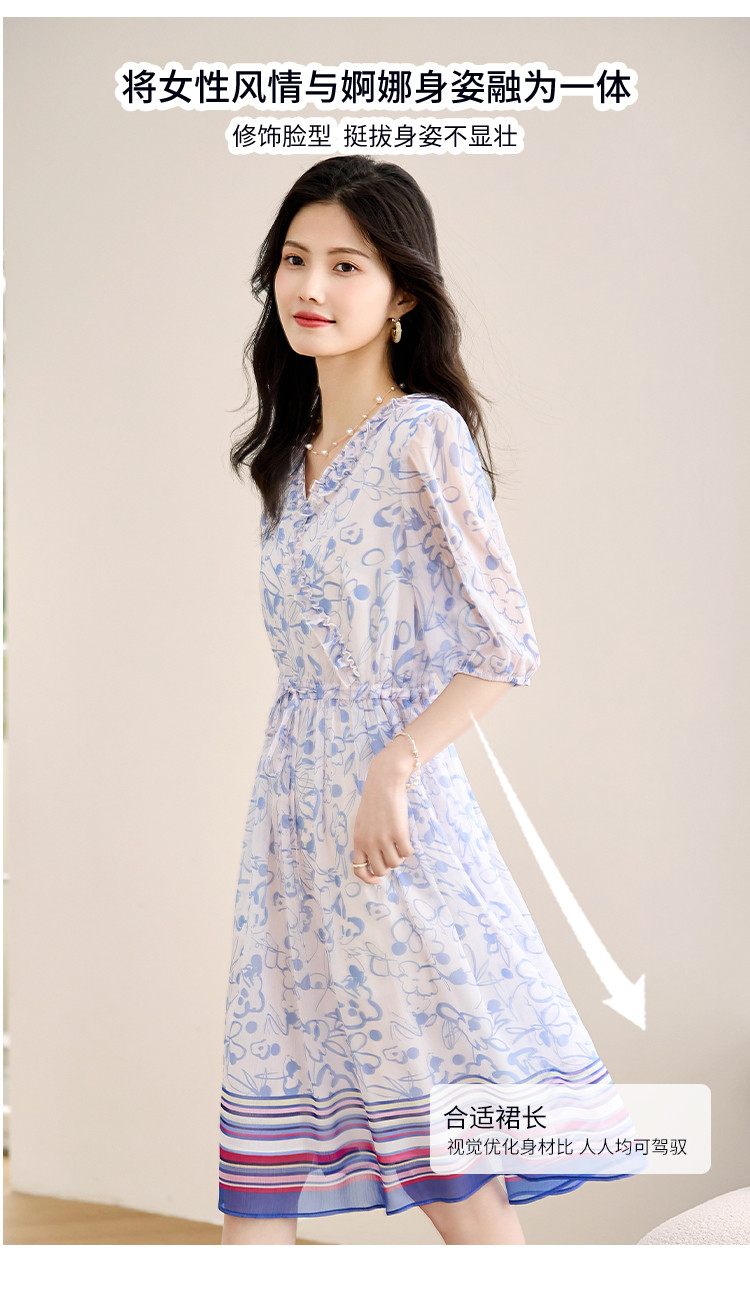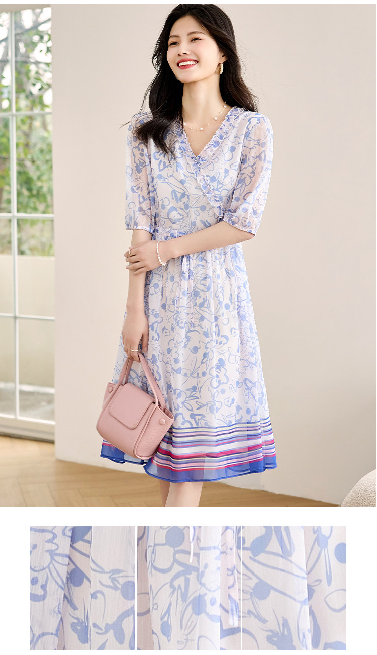 商品名称:2025春夏女装时尚原创印花花边领五分袖雪纺连衣裙 495128