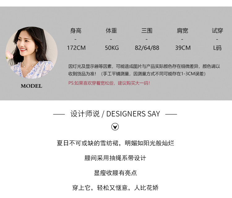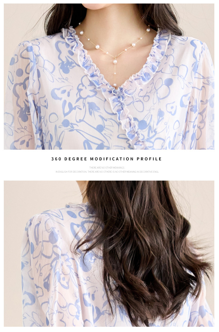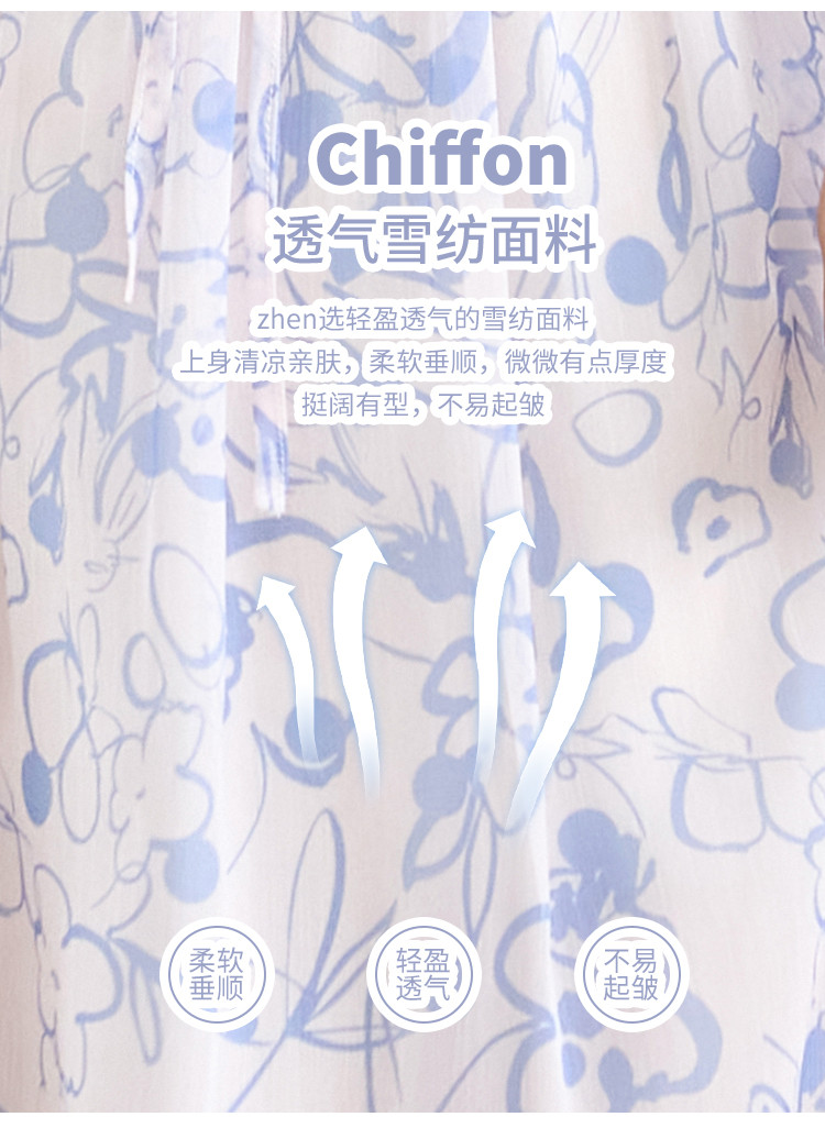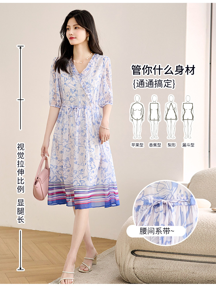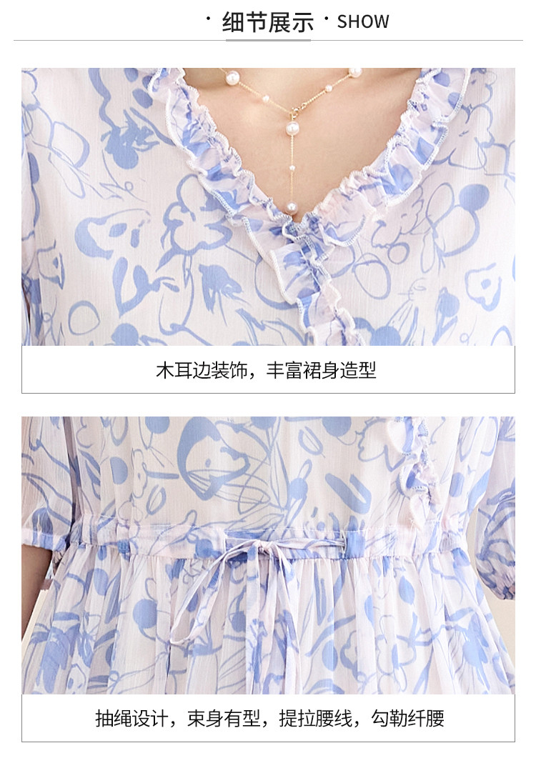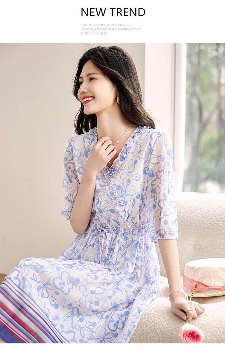 商品名称:2025春夏女装时尚原创印花花边领五分袖雪纺连衣裙 495128