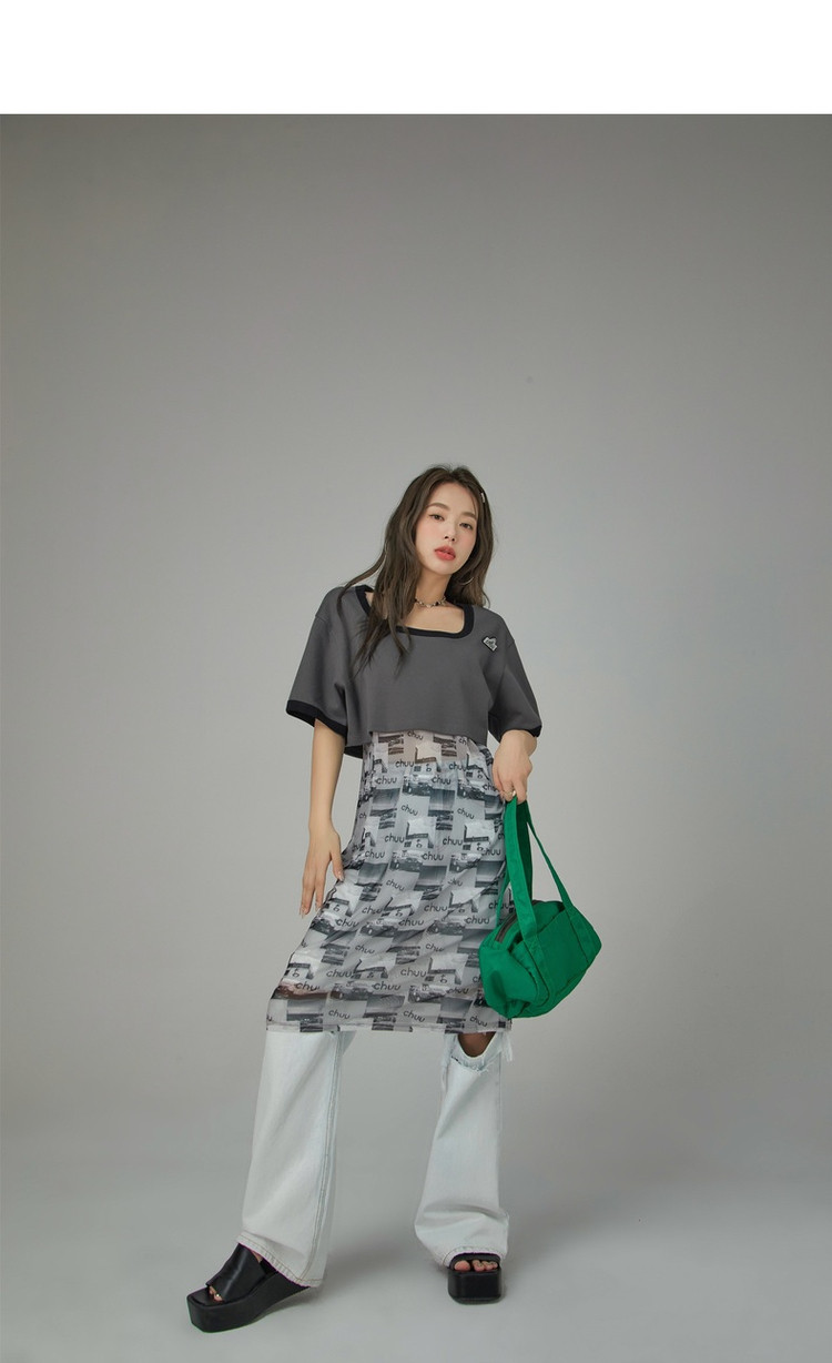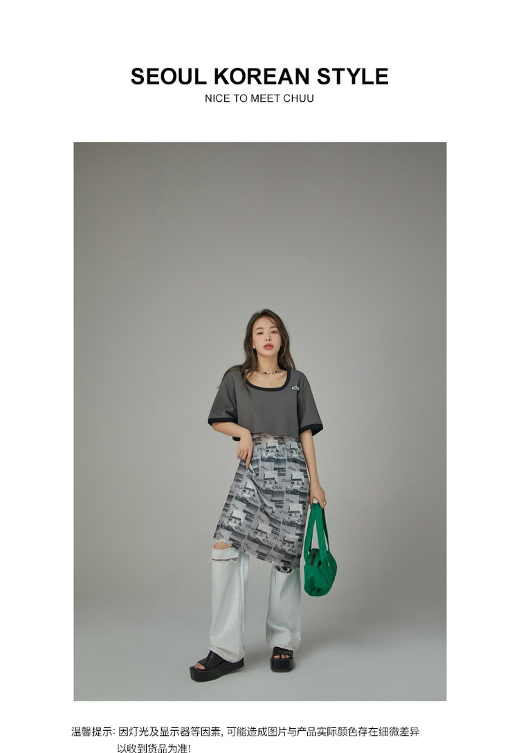 字母刺绣开叉半身裙女春秋松紧腰磨破撞色拼接长裙 807443