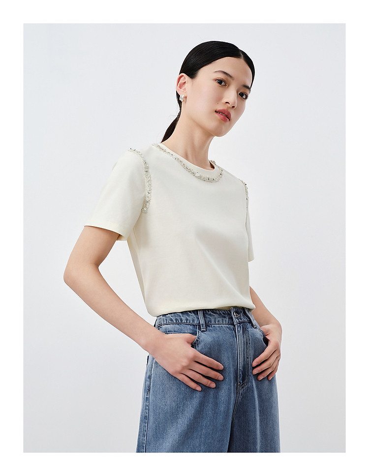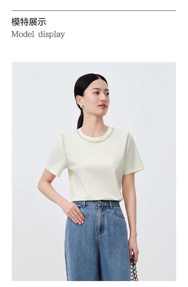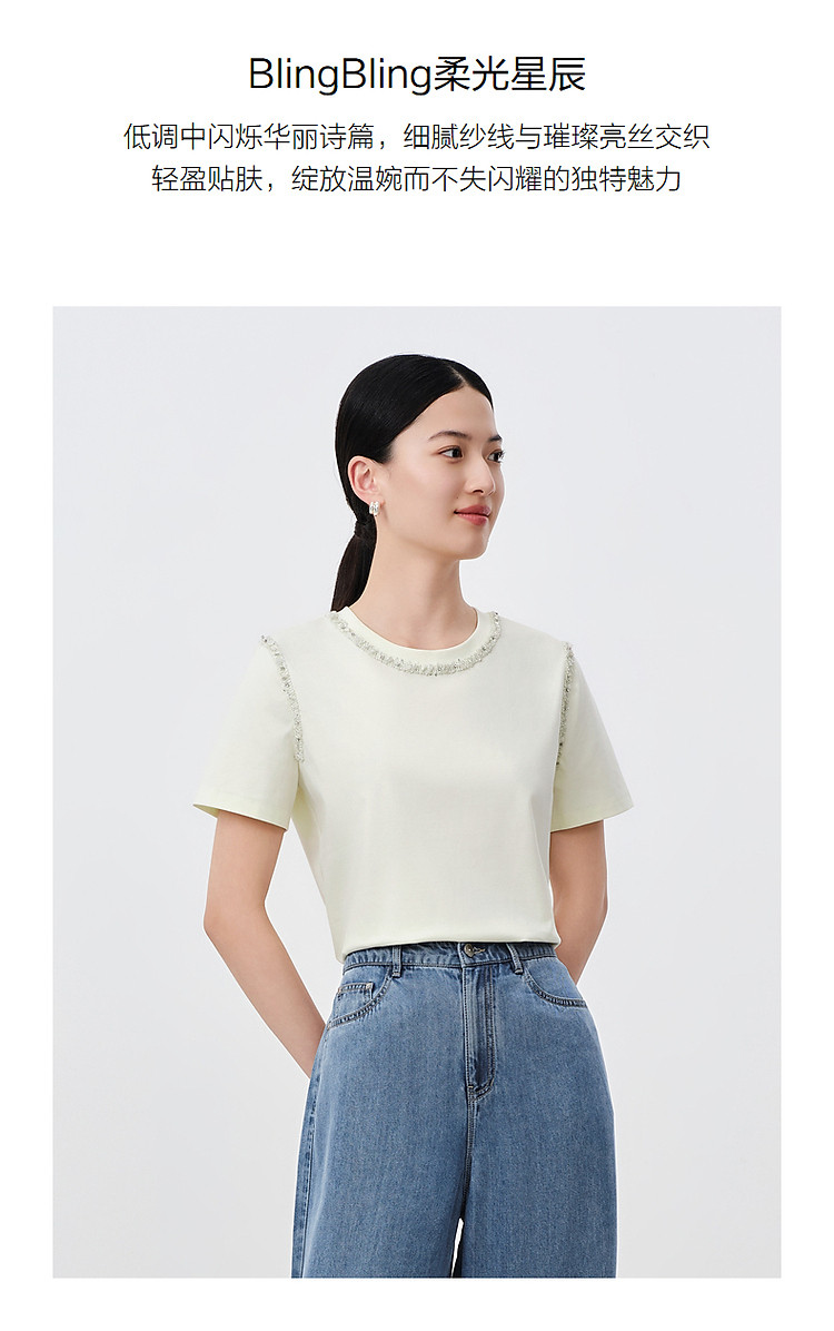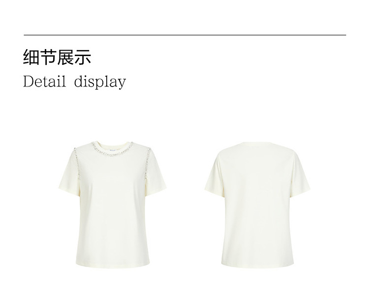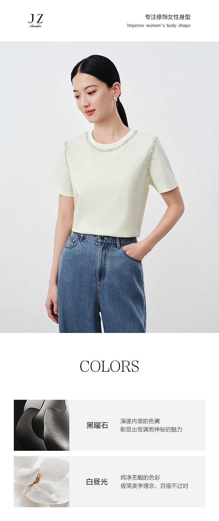 商品名称:玖姿旗下安娜蔻系列优雅淑女钉珠纯棉圆领薄T恤女夏季 420172