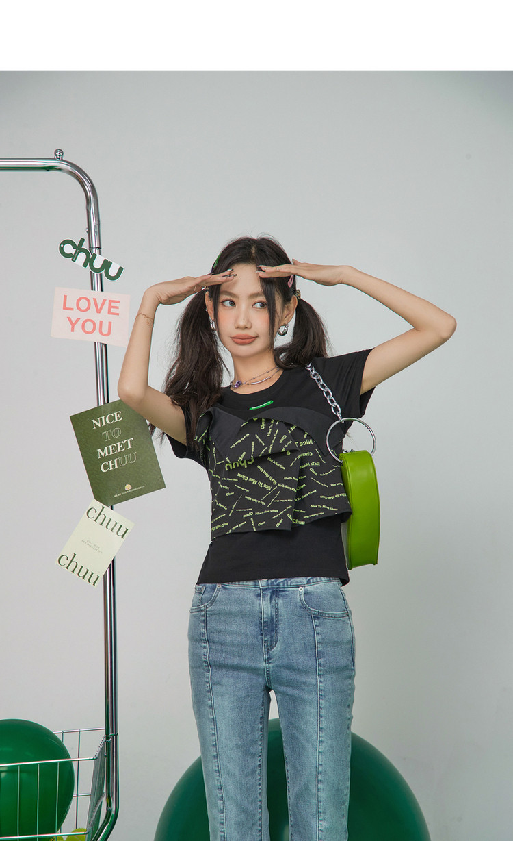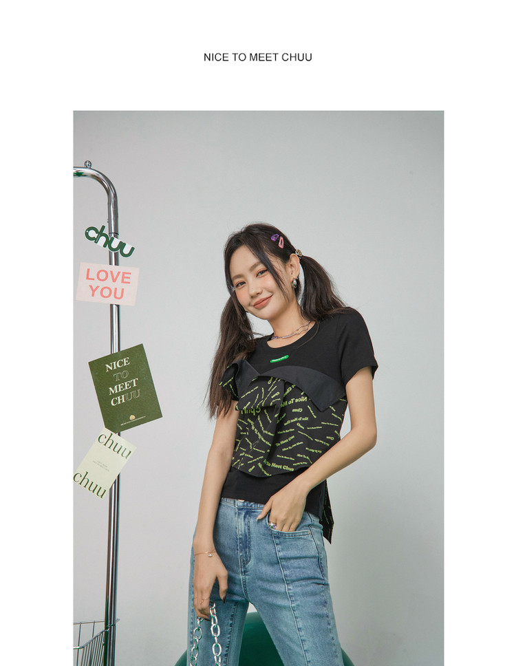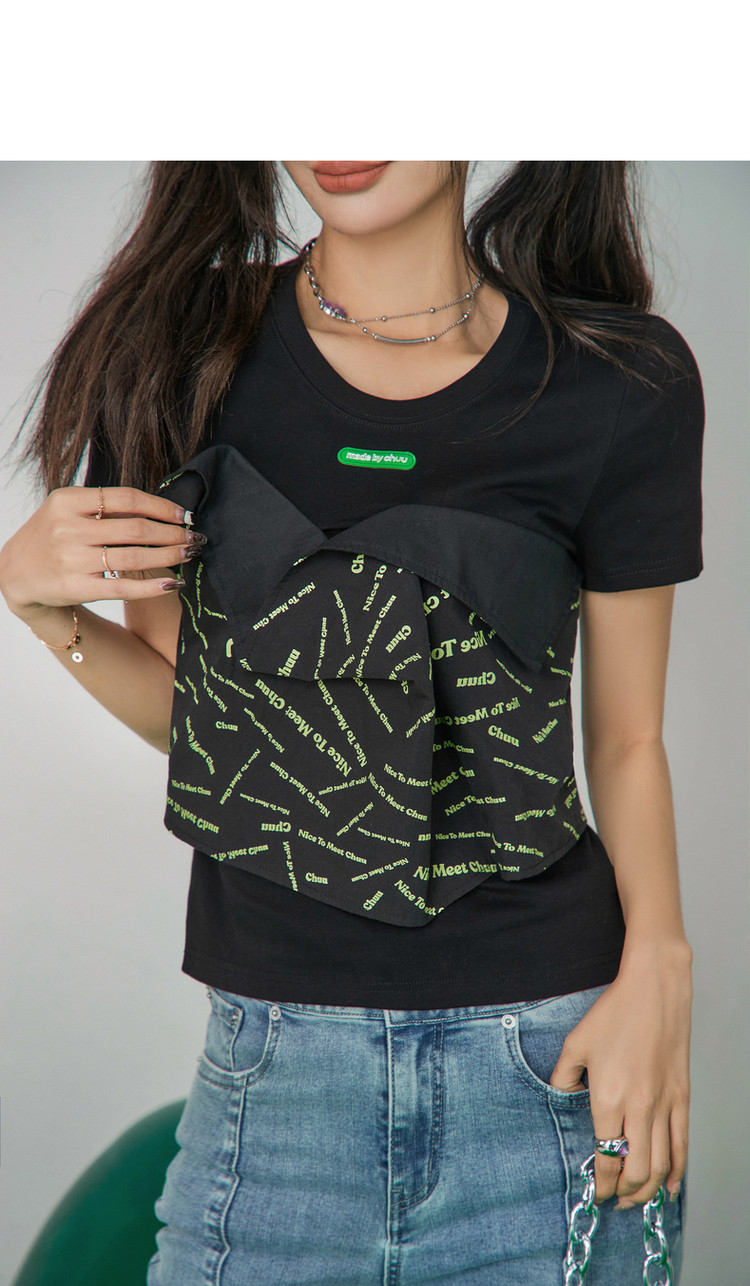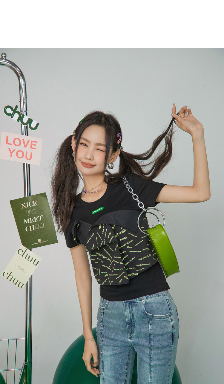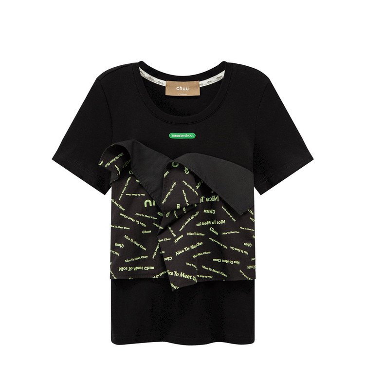 CHUU假两件撞色拼接短袖T恤女士夏韩版甜辣上衣 222227