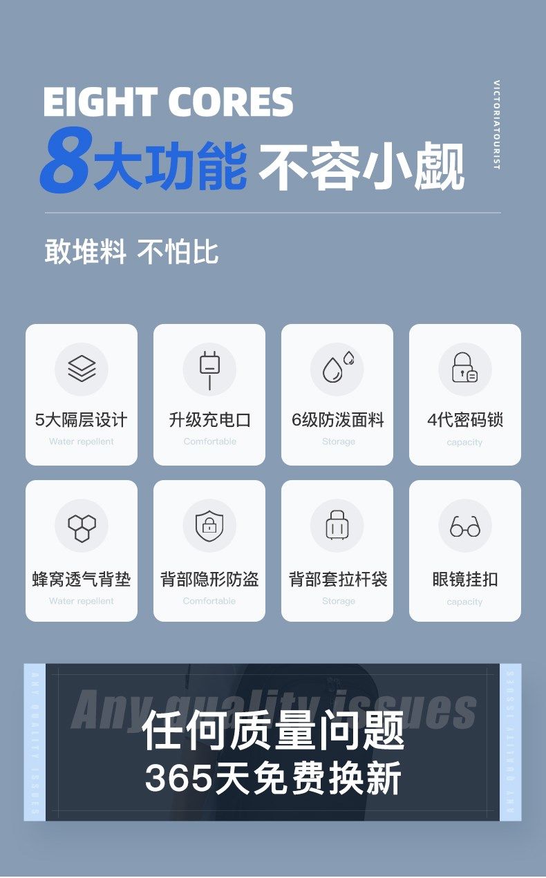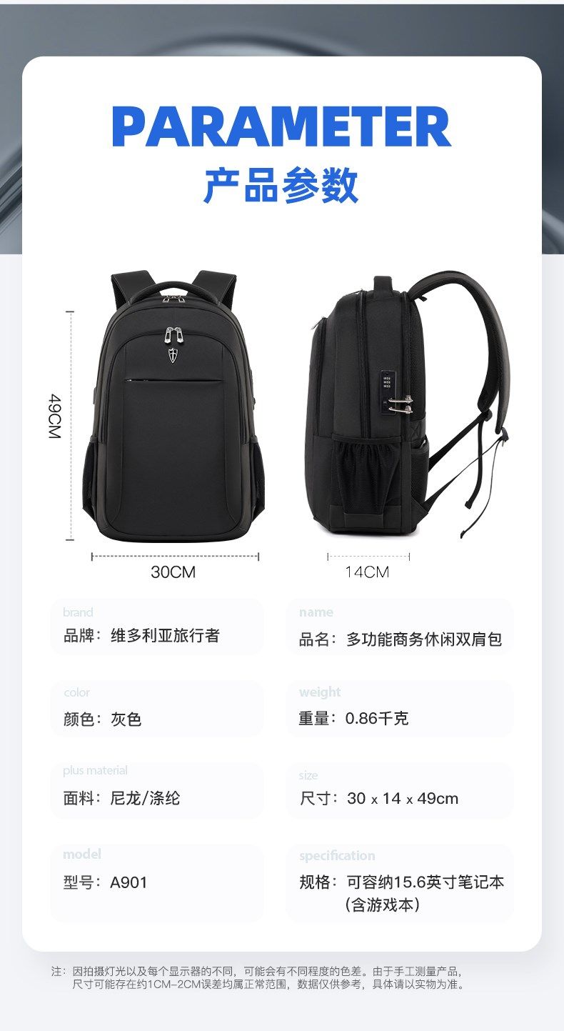 商品名称:维多利亚旅行者 商务休闲防盗双肩包笔记本电脑包USB充电口背包901