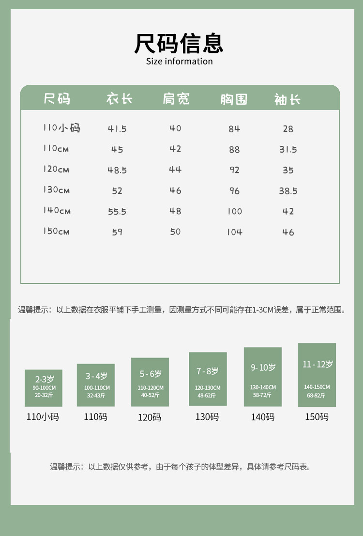 | 尺码 | 衣长(cm) | 肩宽(cm) | 身高(cm) | 袖长(cm) | 适合年龄 | 胸围(cm) | 号型 |