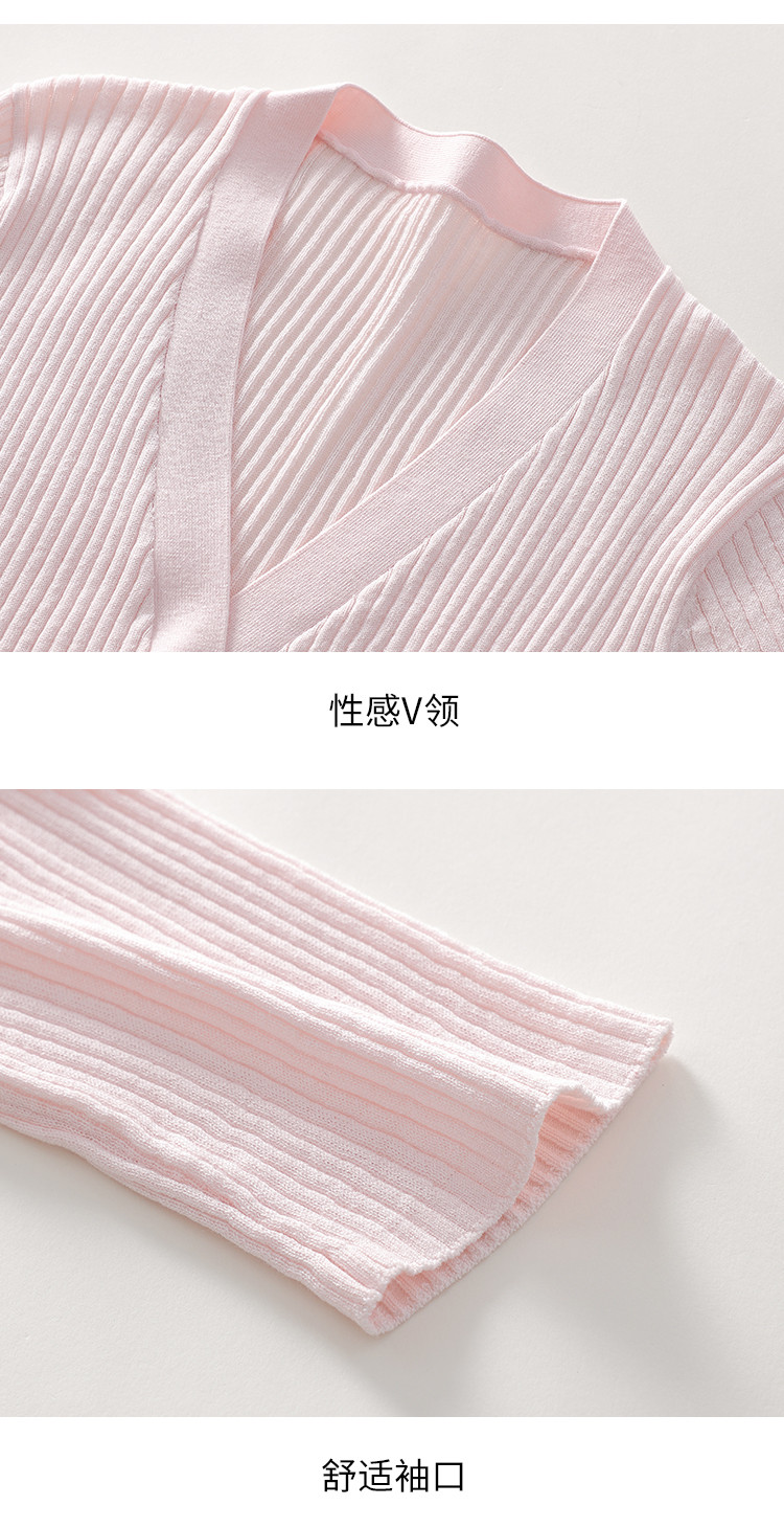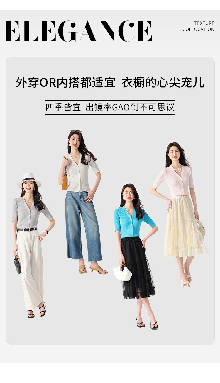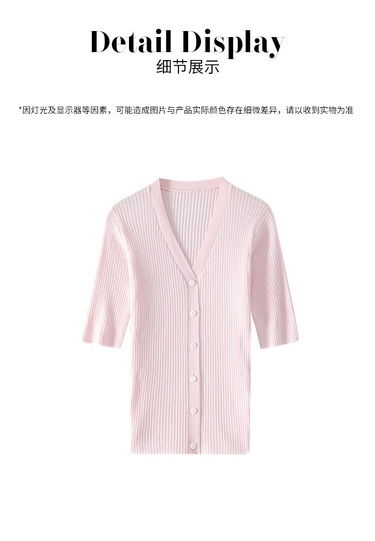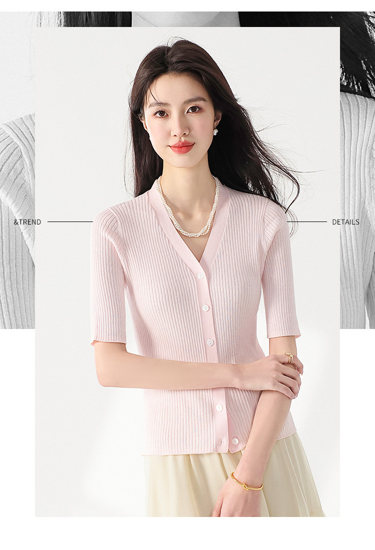 商品名称:夏款透气纯色坑条V领短袖桑蚕丝针织杉女开衫修身T恤外套空调衫 206739