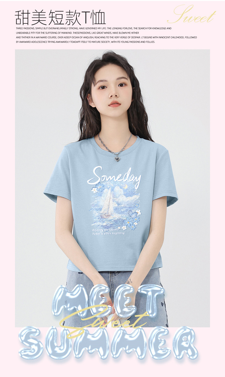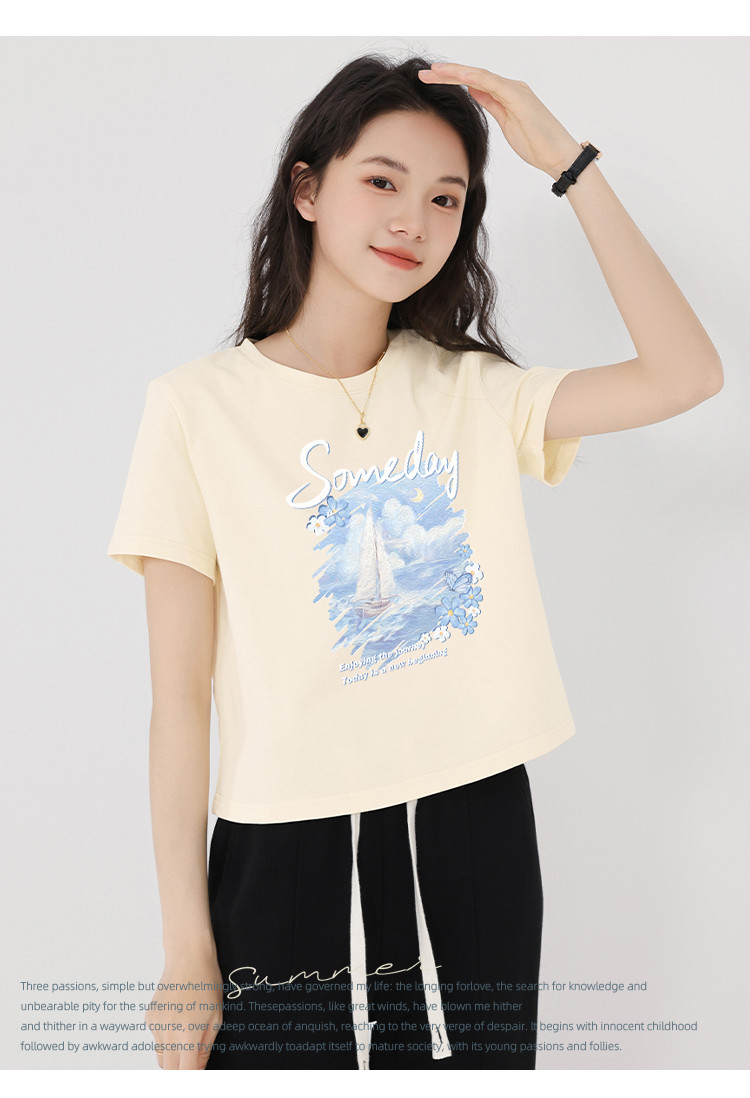 【女装100%棉】正肩短袖T恤女夏设计感显高辣妹露脐短款上衣 517779