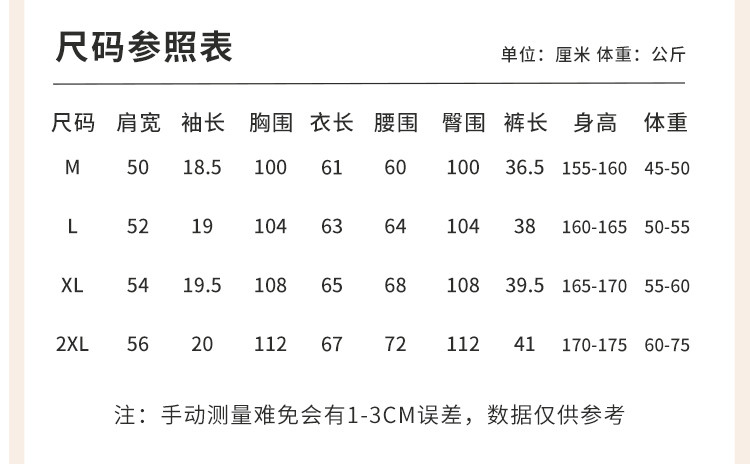 | 尺码 | 肩宽(cm) | 袖长(cm) | 衣长(cm) | 身高(cm) | 腰围(cm) | 裤长(cm) | 体重(kg) | 臀围(cm) | 胸围(cm) | 号型 |
