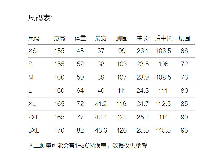 | 尺码 | 裙长(cm) | 肩宽(cm) | 腰围(cm) | 袖长(cm) | 胸围(cm) | 号型 |