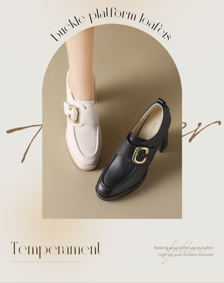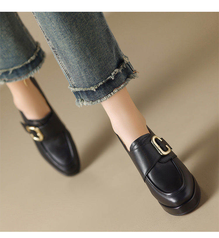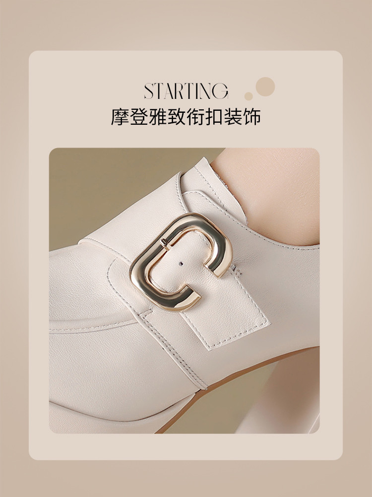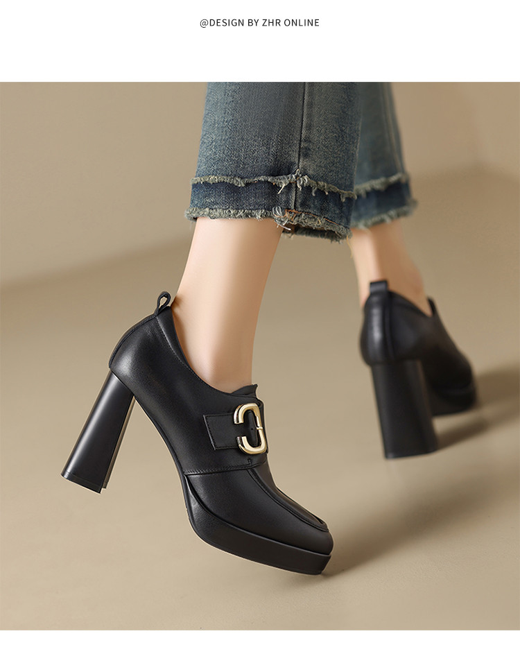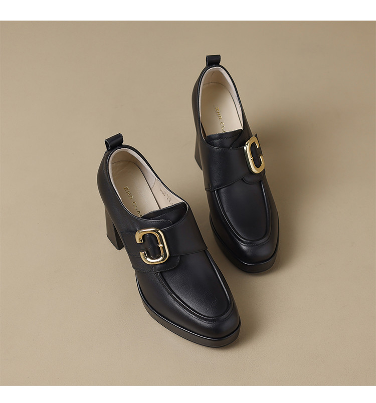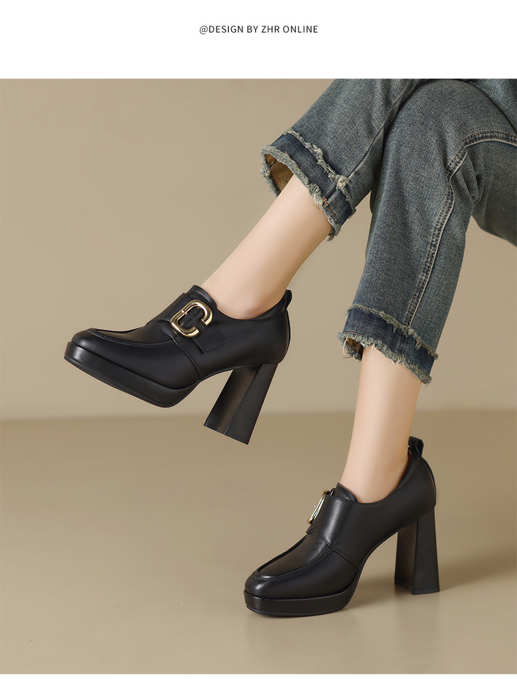 【头层牛皮】金属饰扣深口单鞋小个子增高粗跟高跟鞋春秋女士单鞋 495744