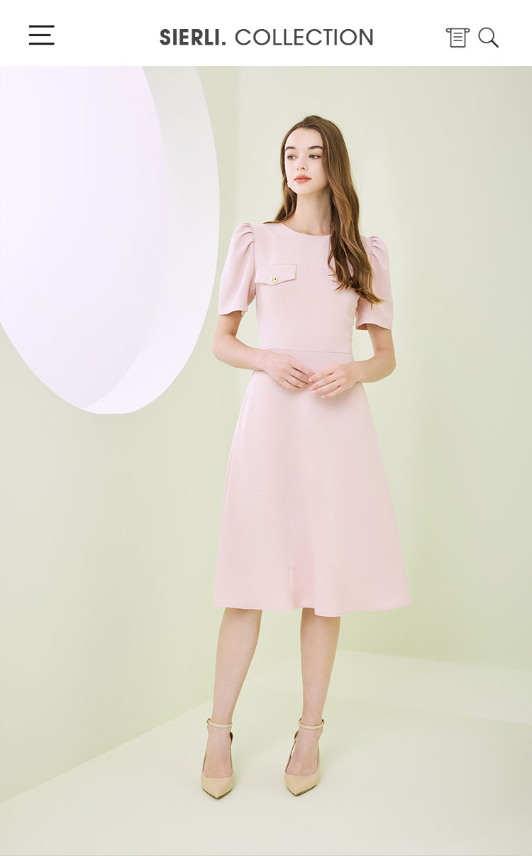 圆领装饰口袋收腰大摆中长裙OL风春夏连衣裙 609695