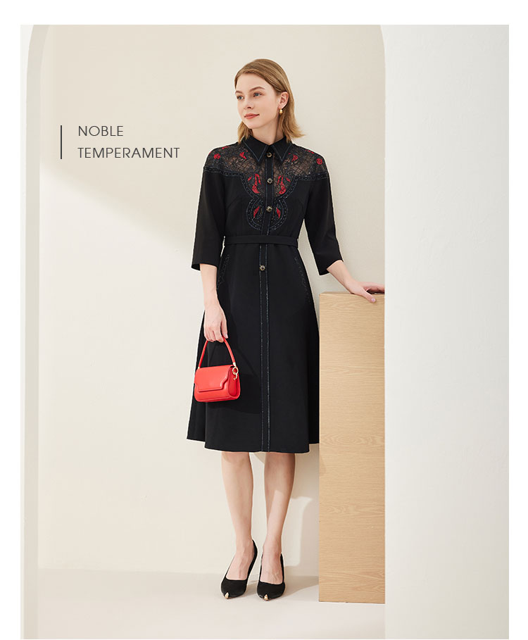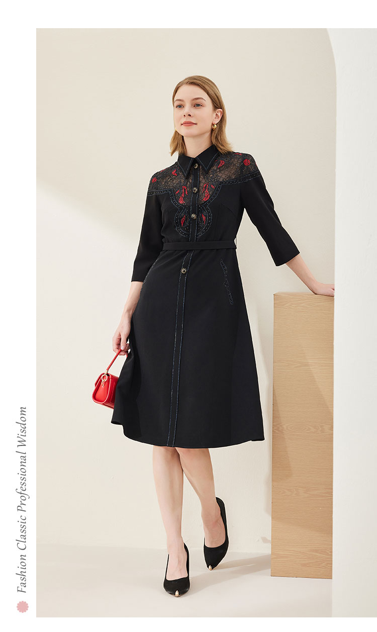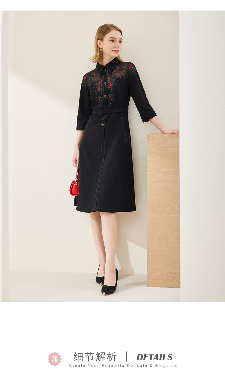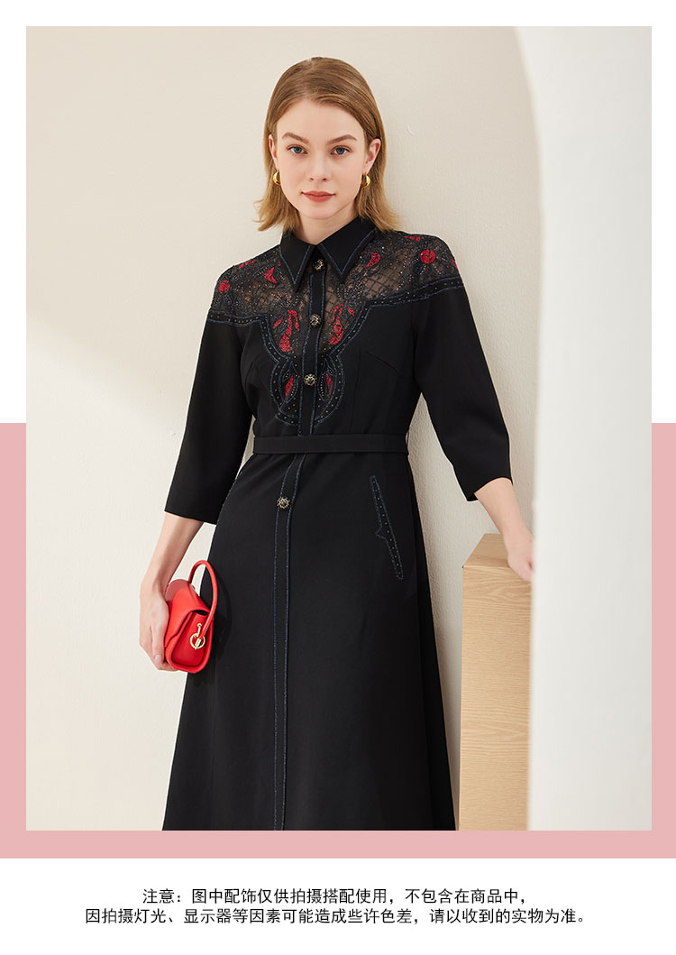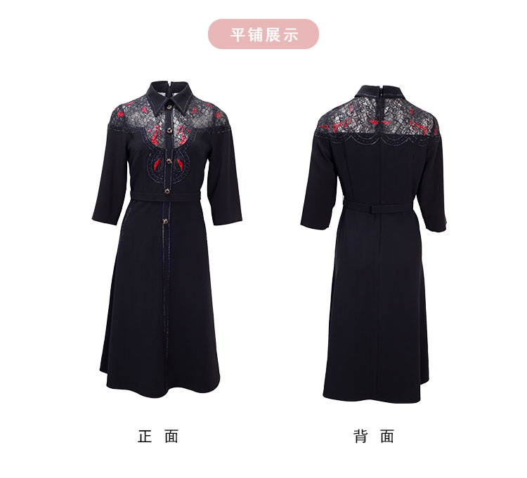 商品名称:春季衬衫领拼蕾丝烫钻收腰显瘦七分袖连衣裙 134111