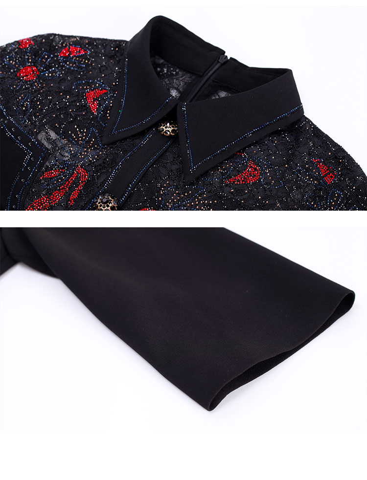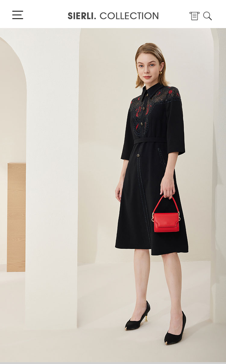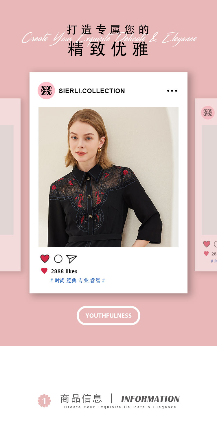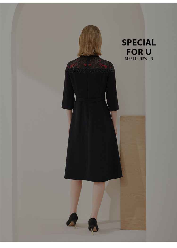 商品名称:春季衬衫领拼蕾丝烫钻收腰显瘦七分袖连衣裙 134111