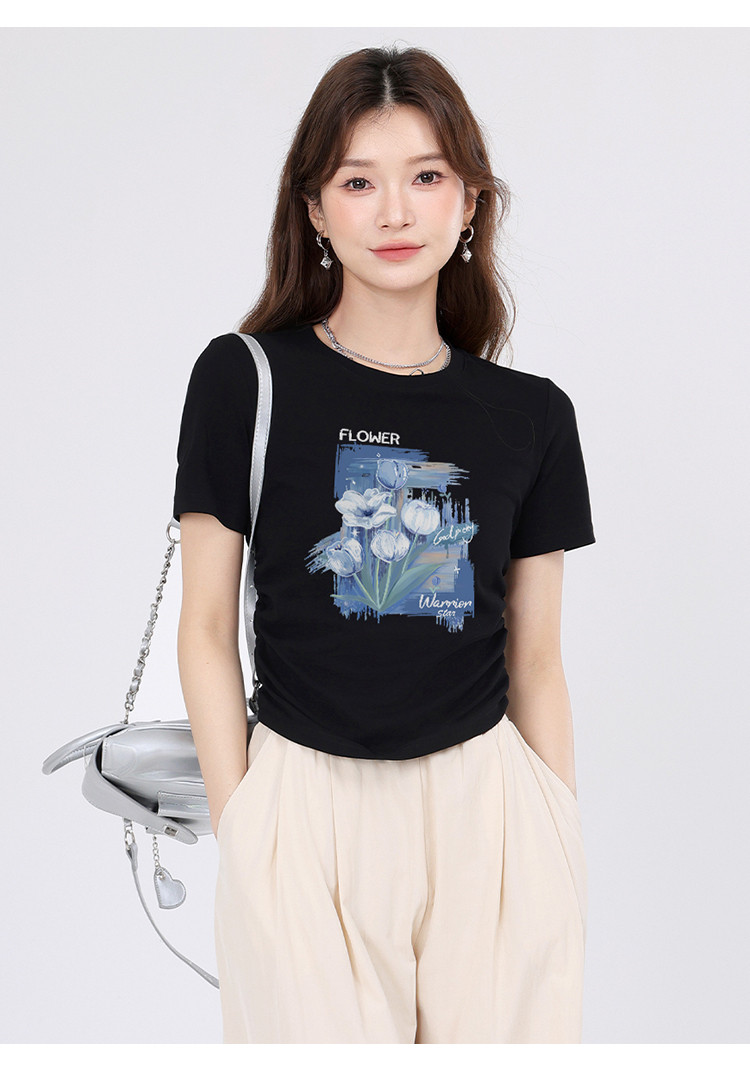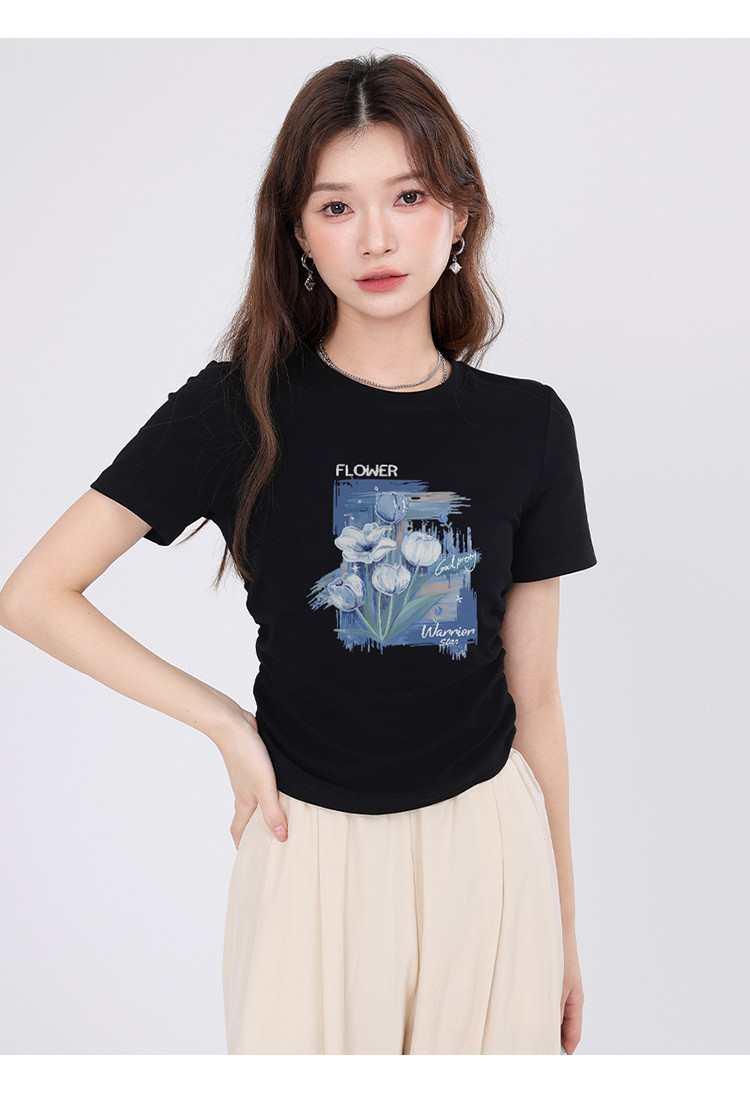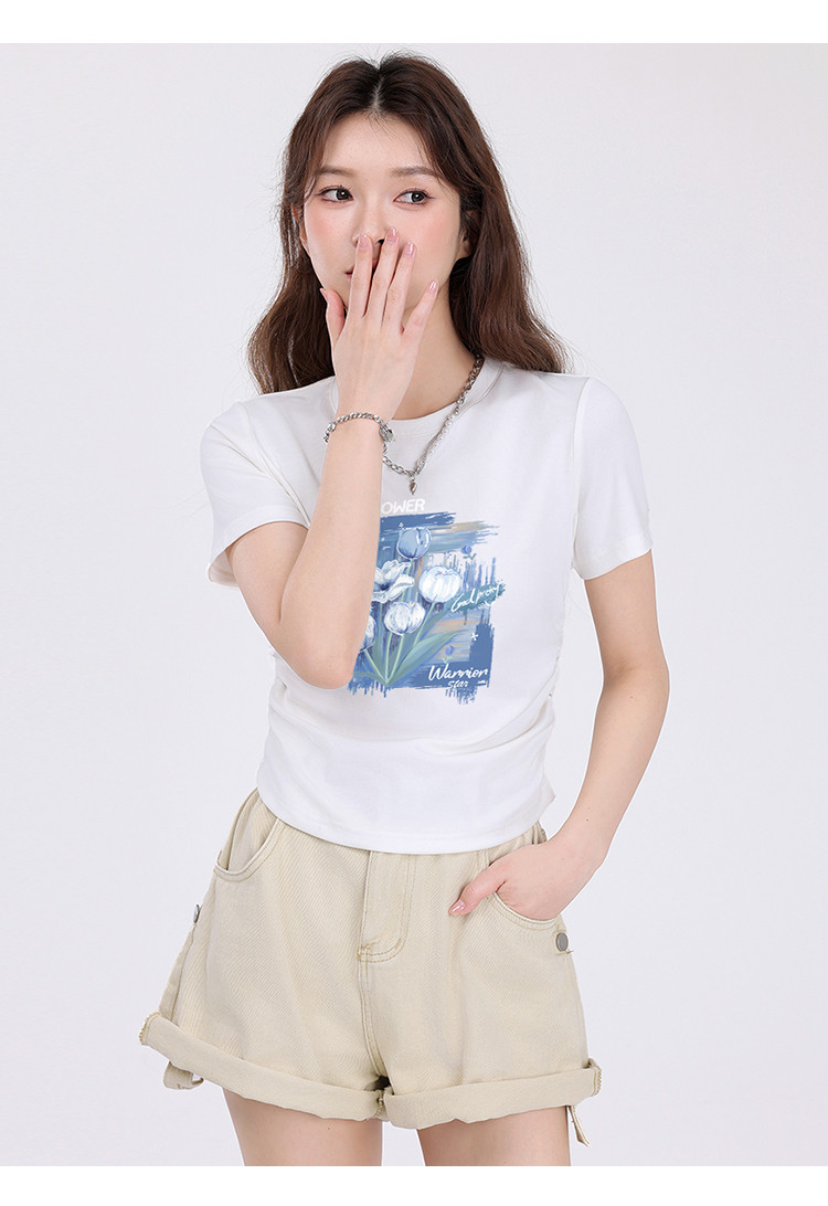【女装正肩】女式短款小个子T恤紧身显瘦夏季小众抽褶设计感短袖 175955