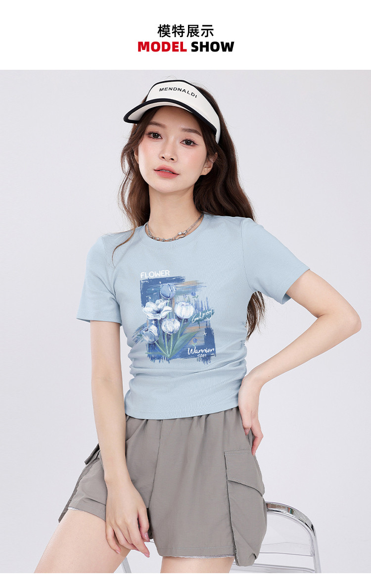 【女装100%棉】夏季女式短袖T短款显瘦设计感甜辣风上衣 073235