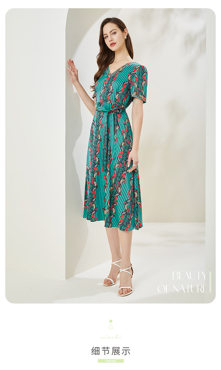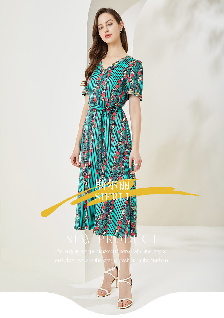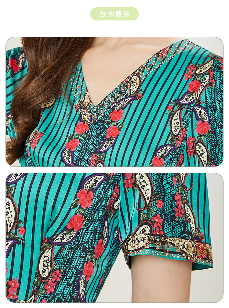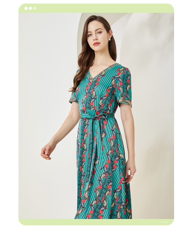 商品名称:商场同款秋季烂漫波西米亚印花撞色小v领烫钻短袖长款连衣裙 380255