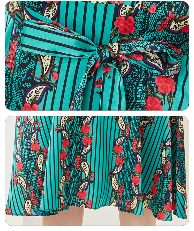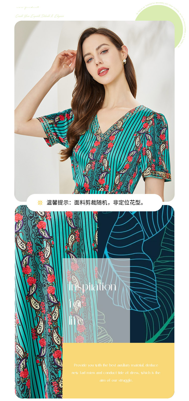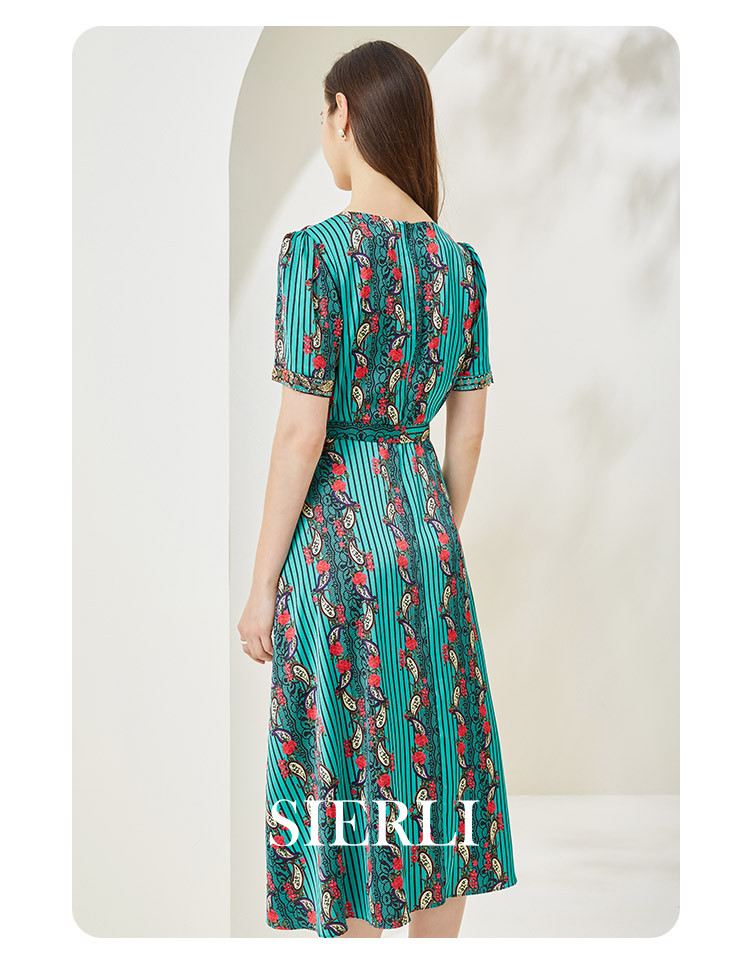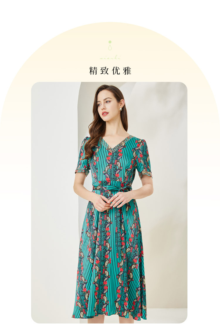 商品名称:商场同款秋季烂漫波西米亚印花撞色小v领烫钻短袖长款连衣裙 380255