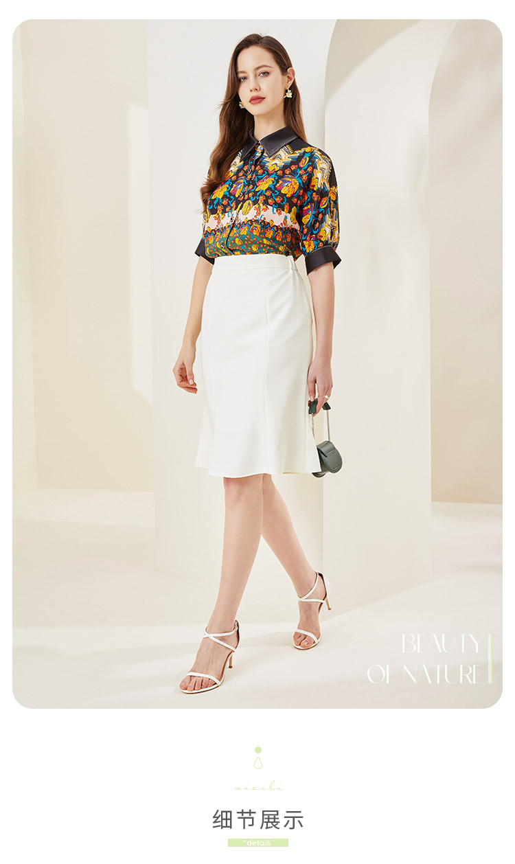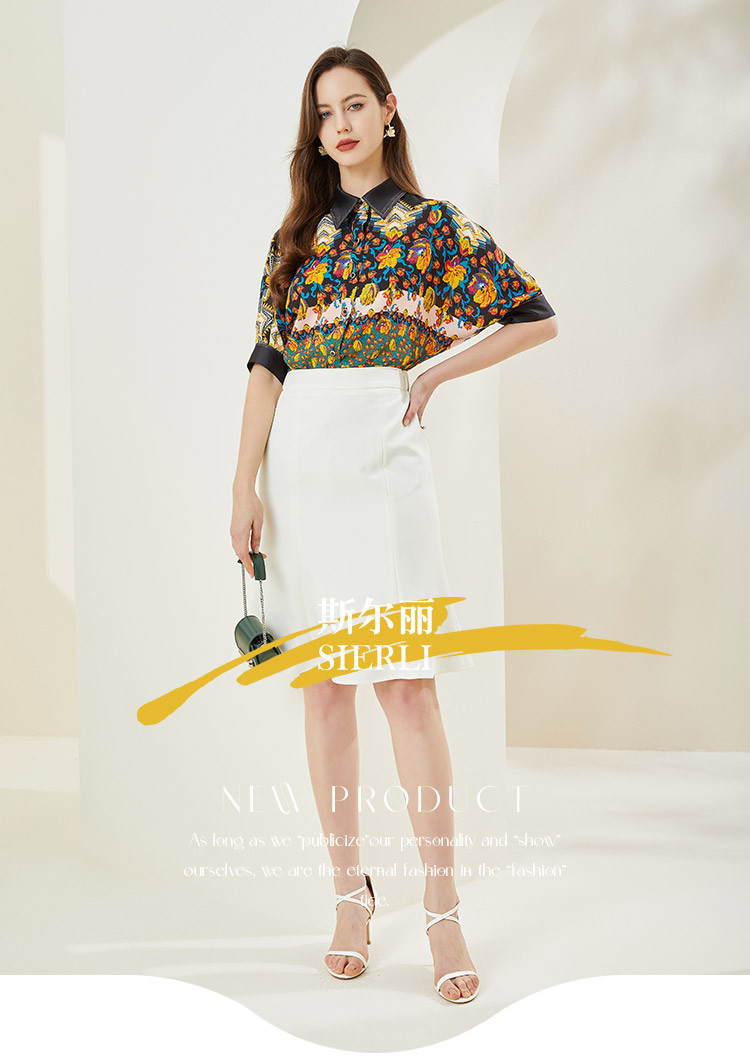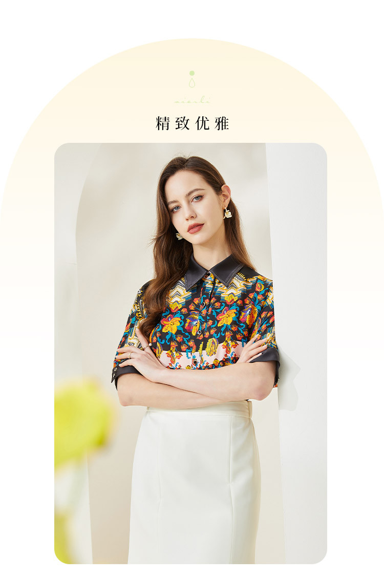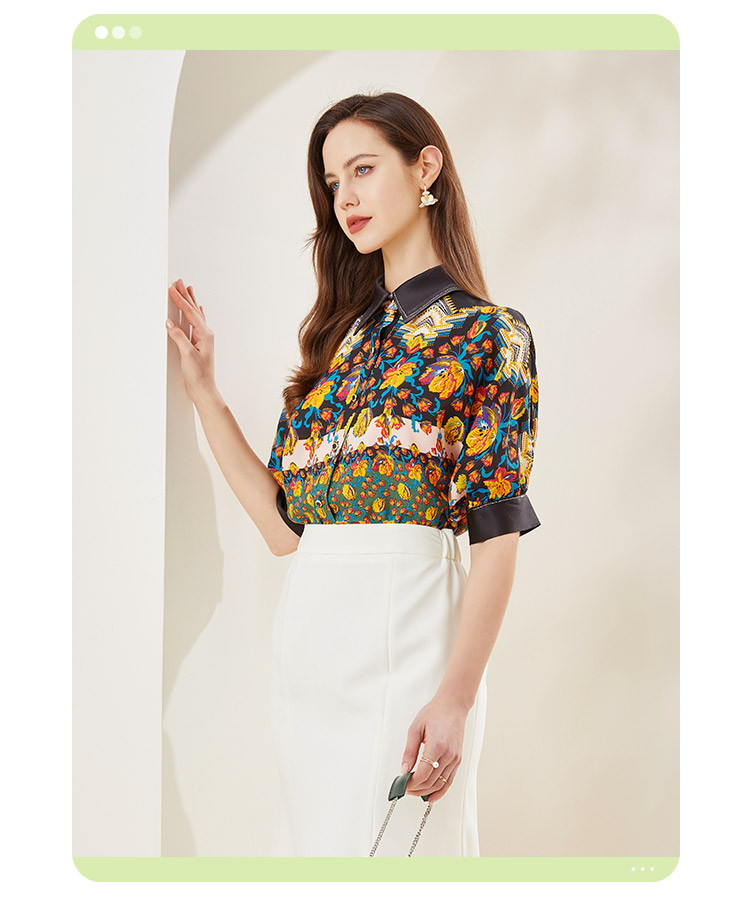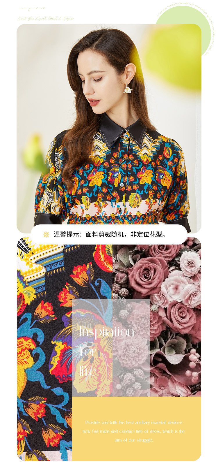 商品名称:商场同款秋季复古烂漫碎花宽松五分袖撞色领烫钻衬衫 266335
