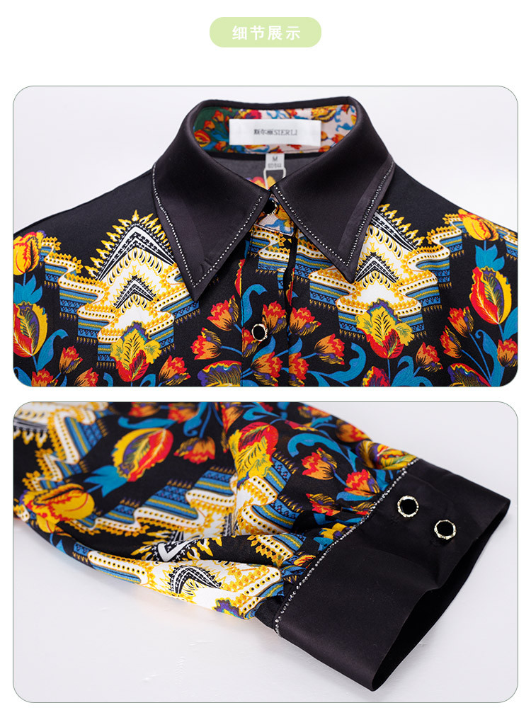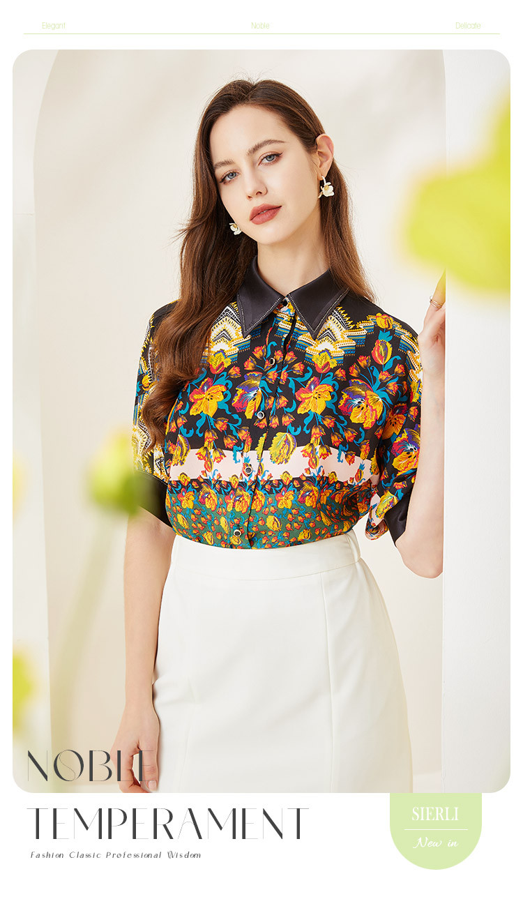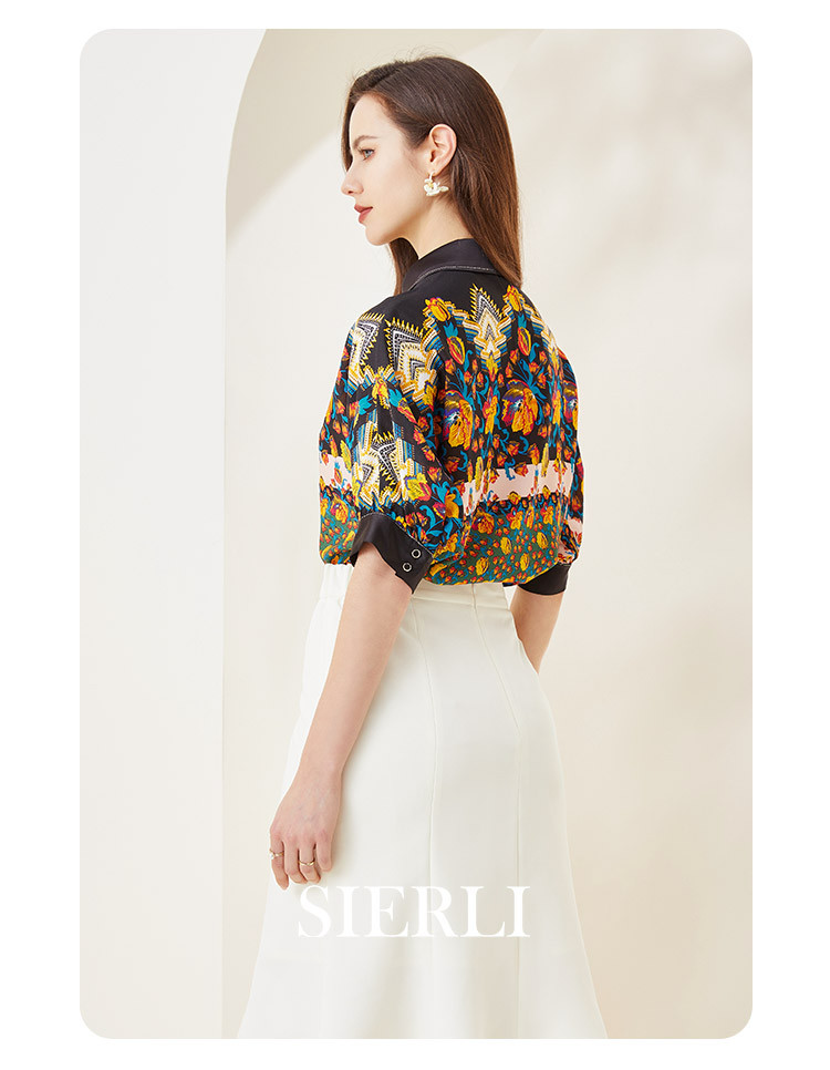 商场同款秋季复古烂漫碎花宽松五分袖撞色领烫钻衬衫 266335
