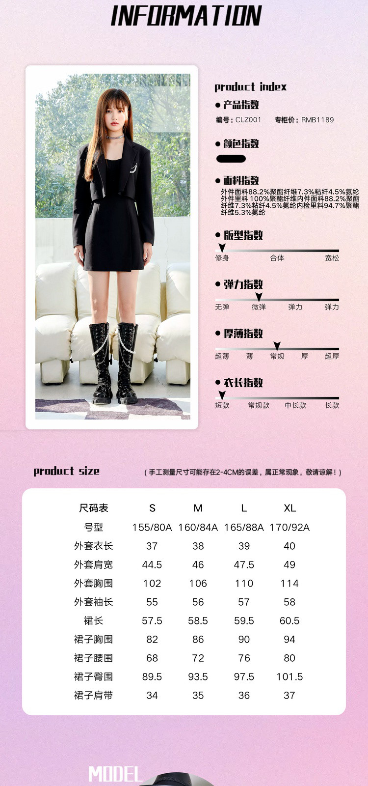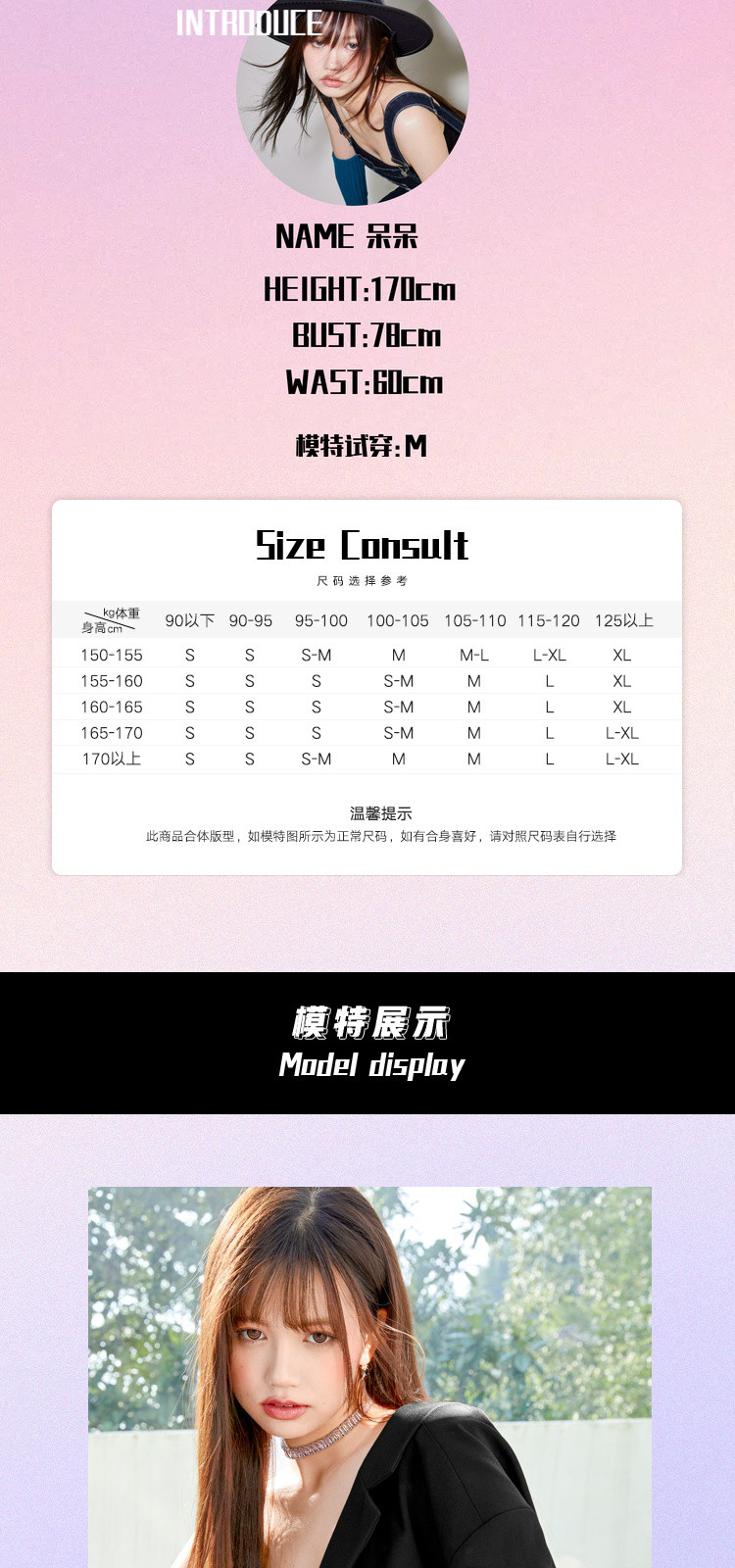 | 尺码 | 肩宽(cm) | 袖长(cm) | 上装号型 | 下装号型 | 衣长(cm) | 腰围(cm) | 臀围(cm) | 胸围(cm) | 号型 |