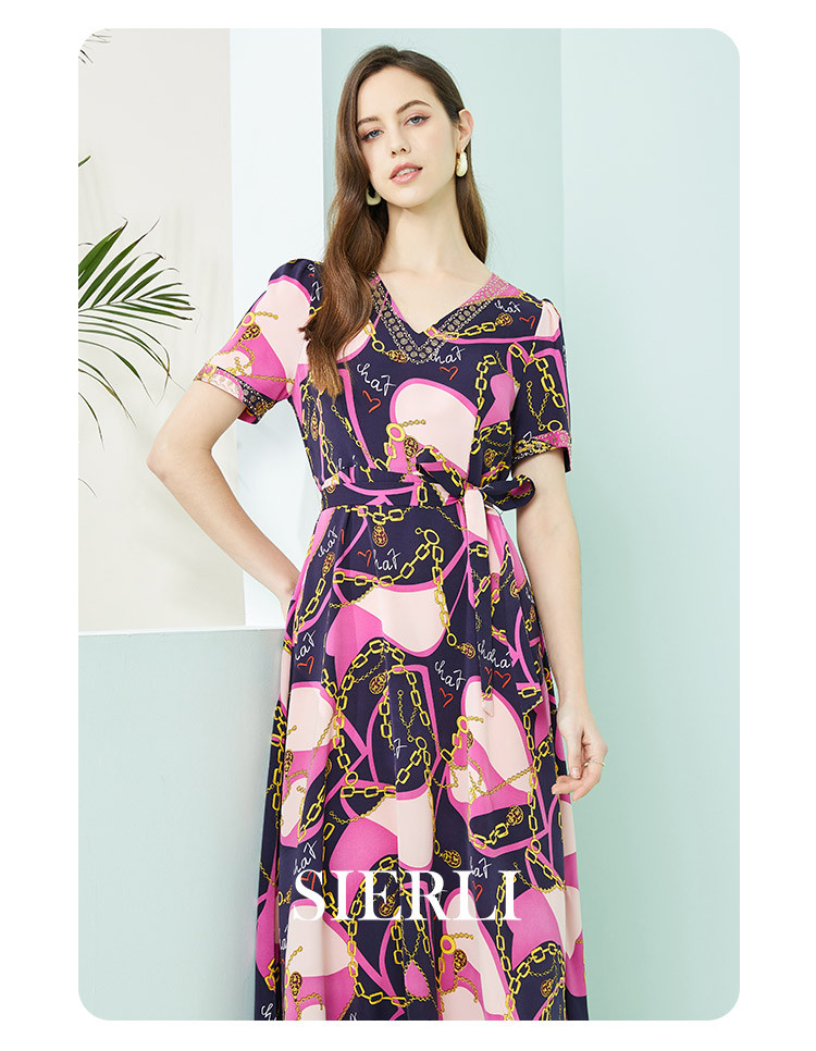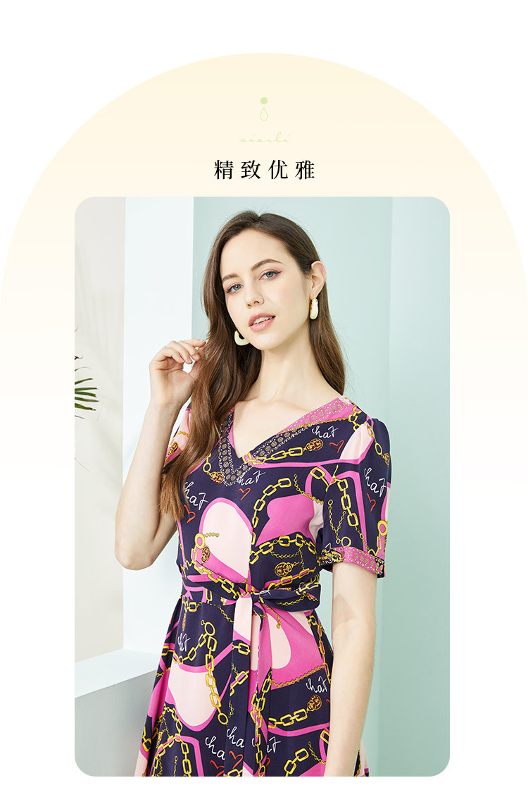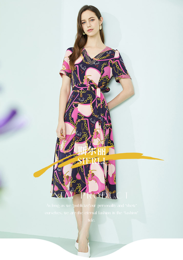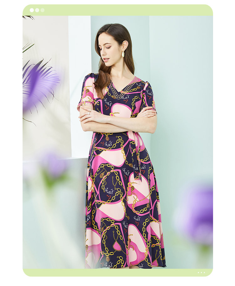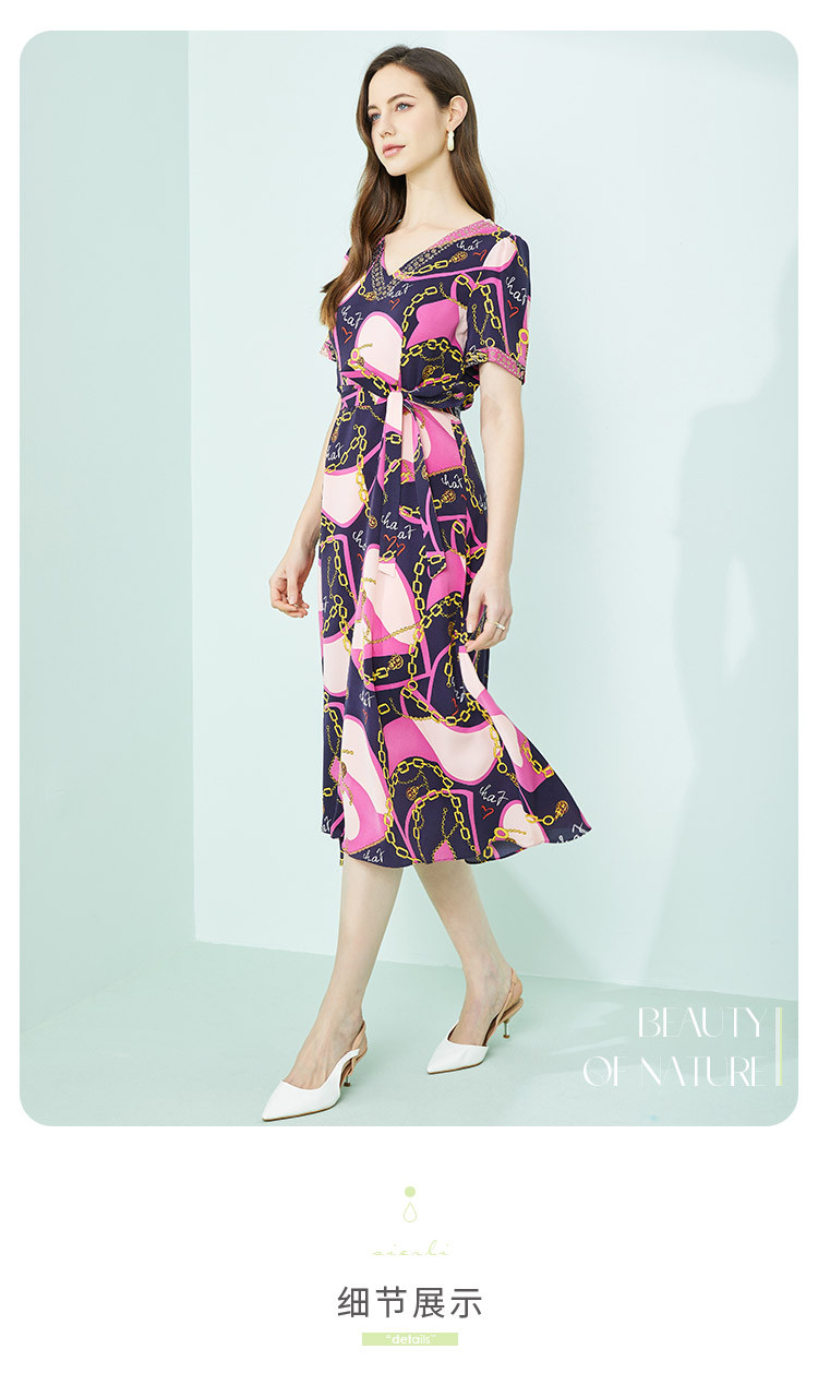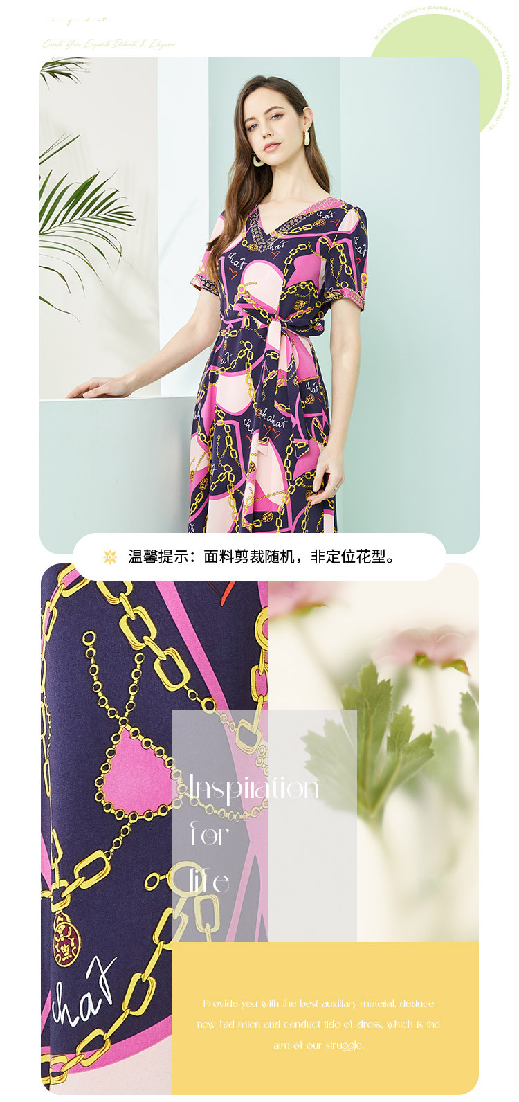 商品名称:商场同款秋季名媛风优雅印花链条撞色v领烫钻收腰式连衣裙 156703