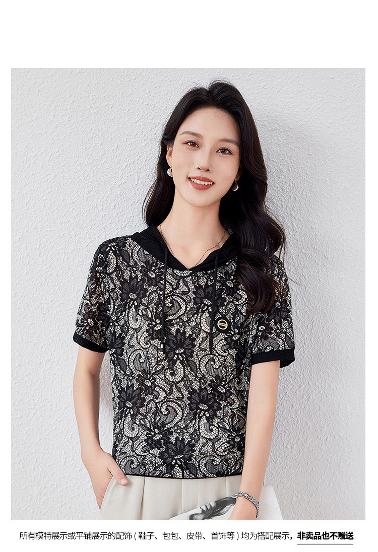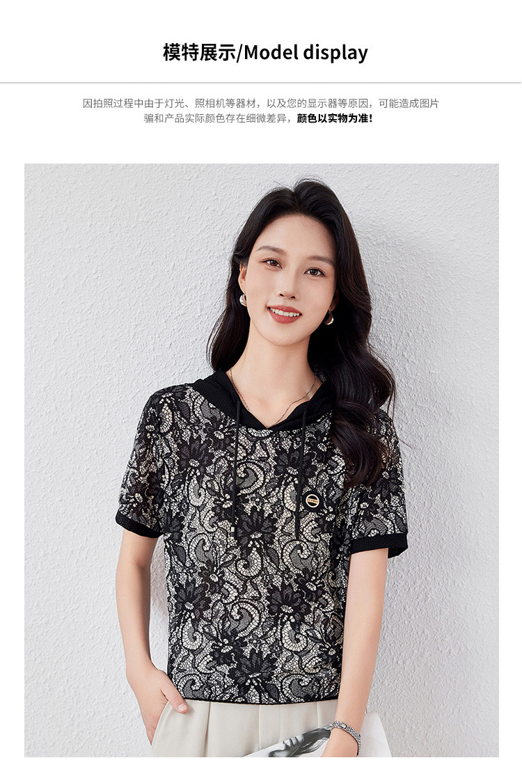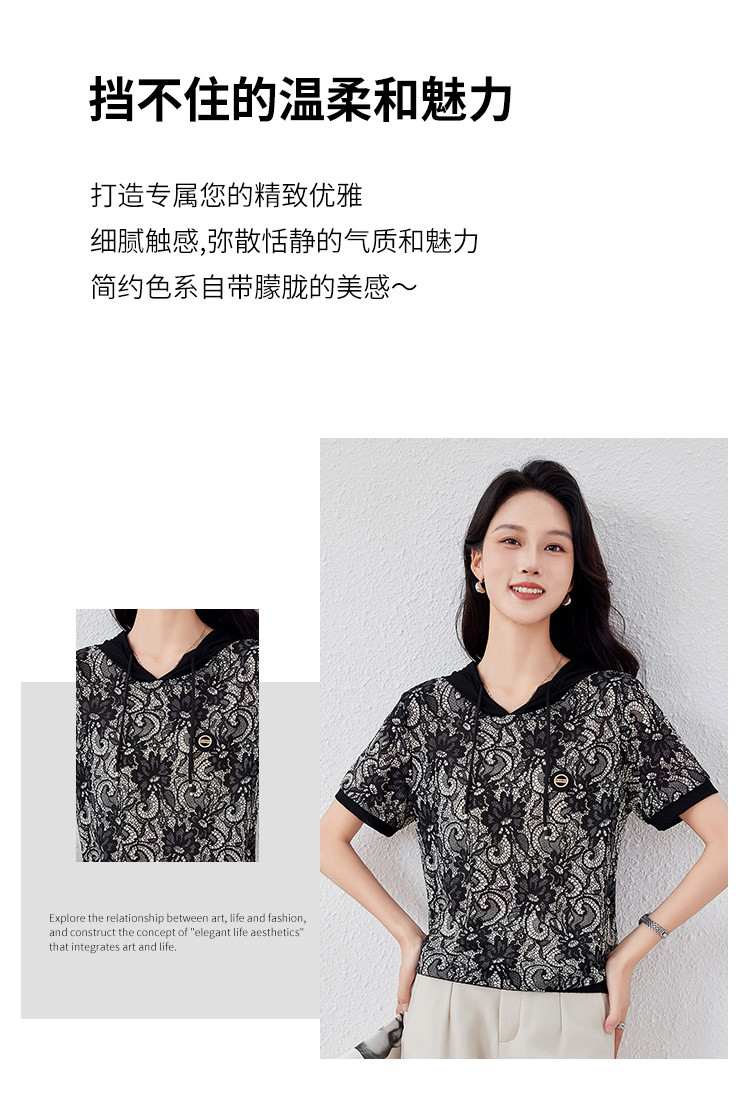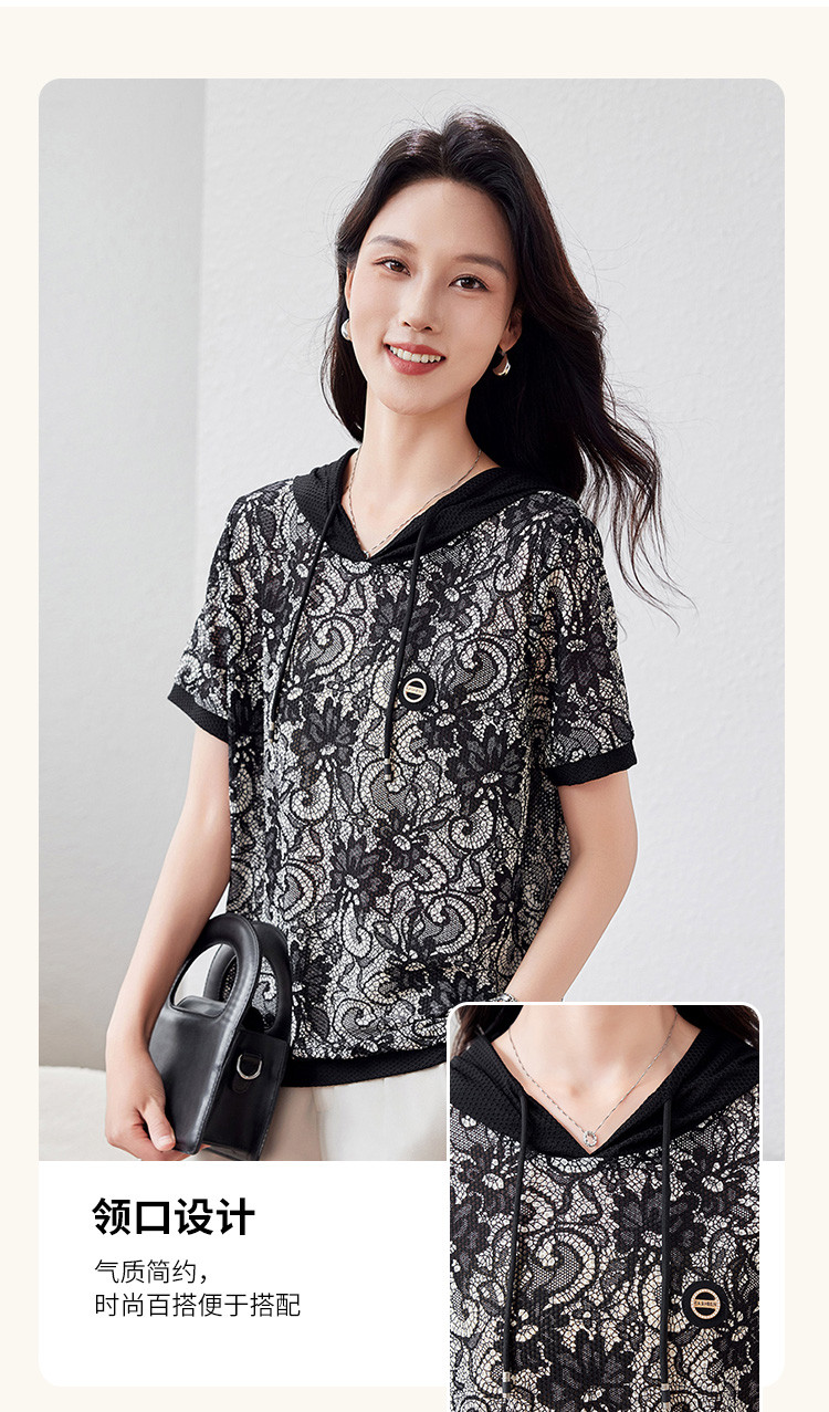 商品名称:夏季气质高级感时尚撞色正肩连帽短袖女透气休闲针织T恤 644767