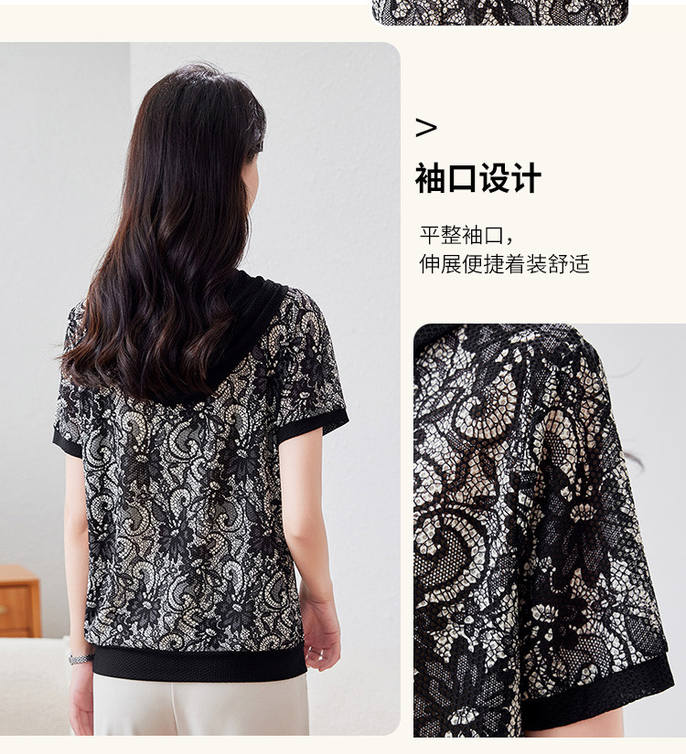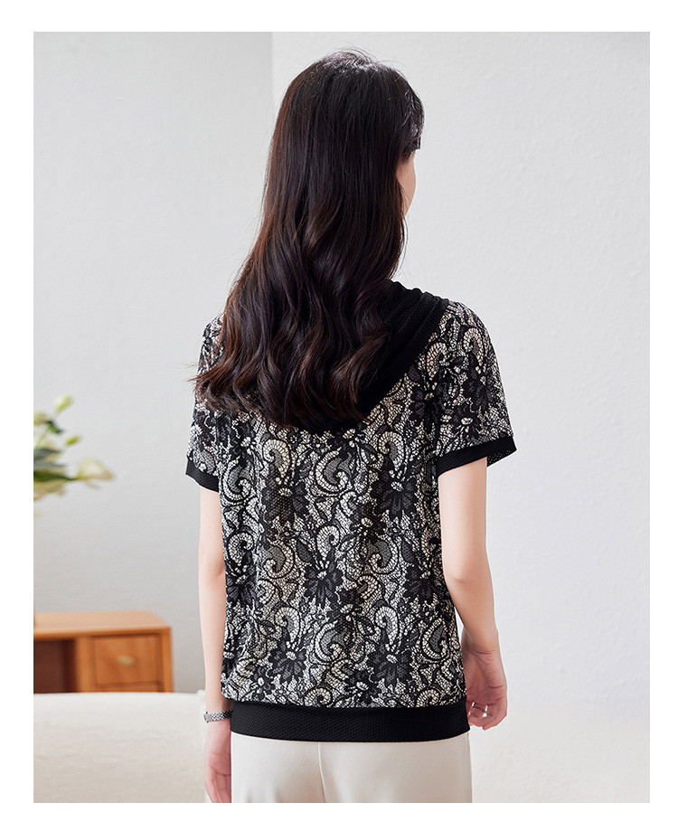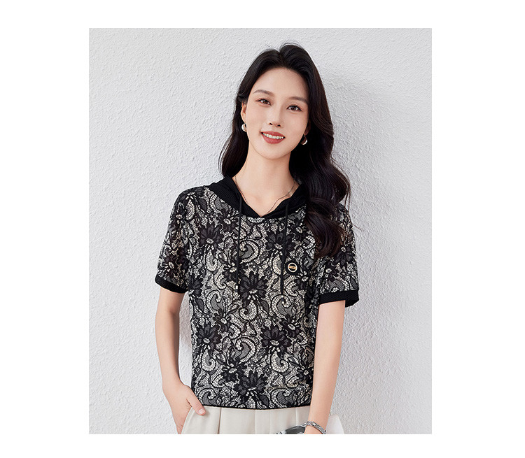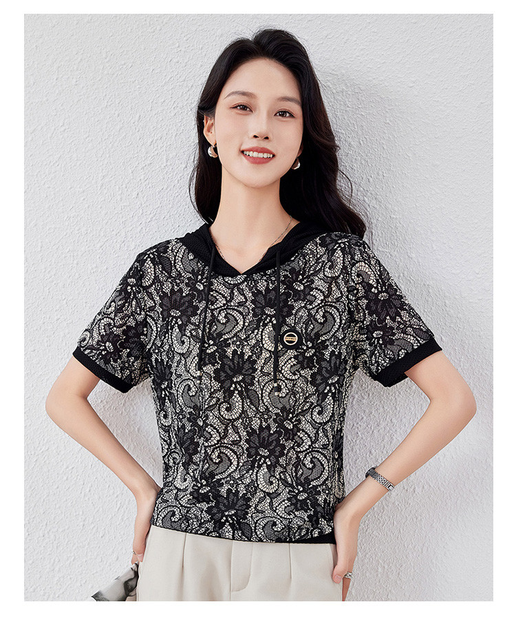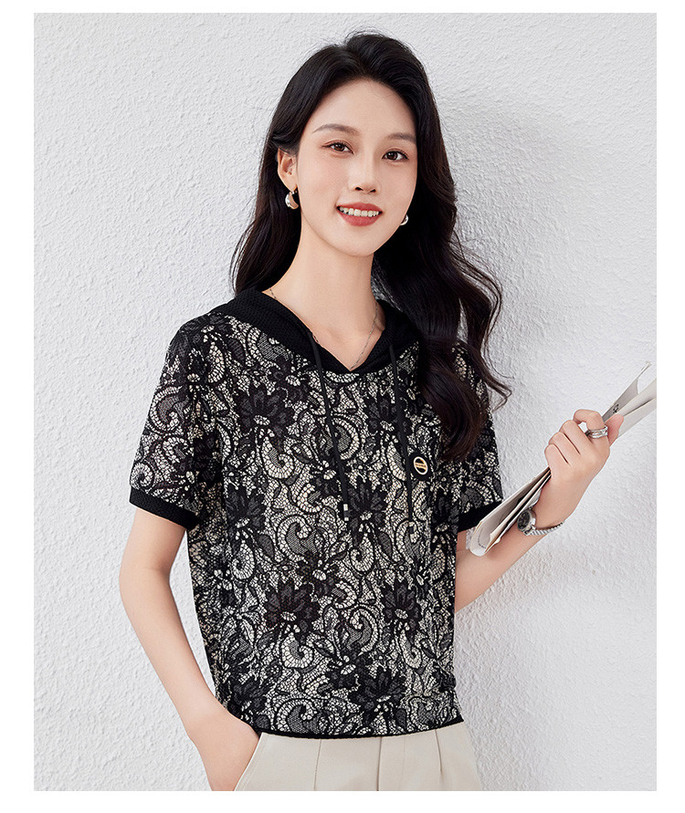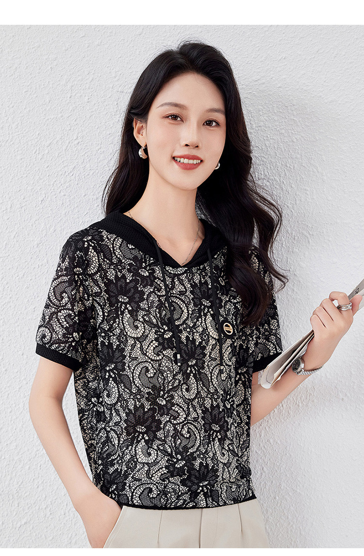 商品名称:夏季气质高级感时尚撞色正肩连帽短袖女透气休闲针织T恤 644767