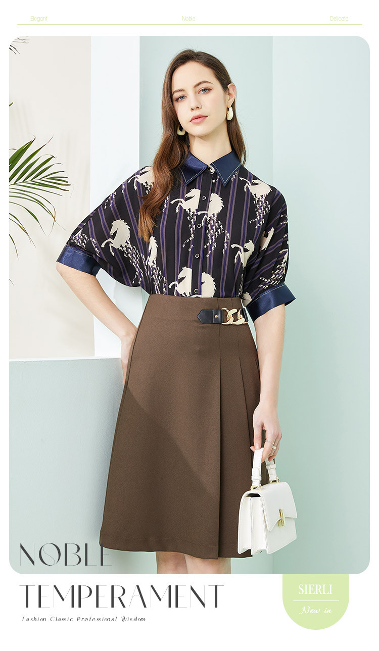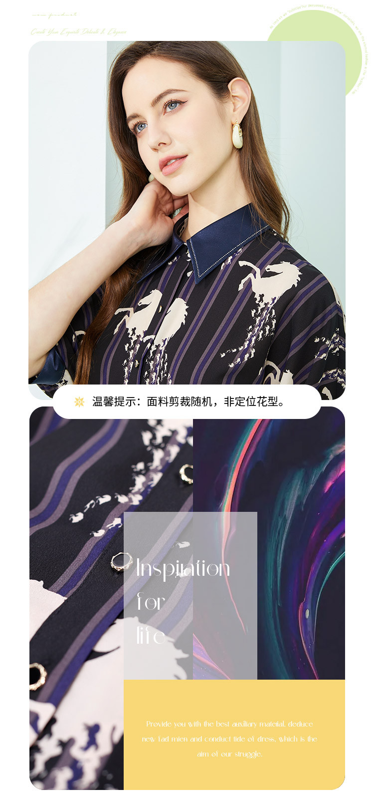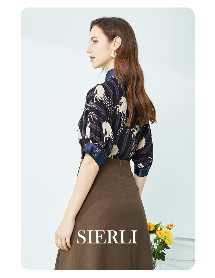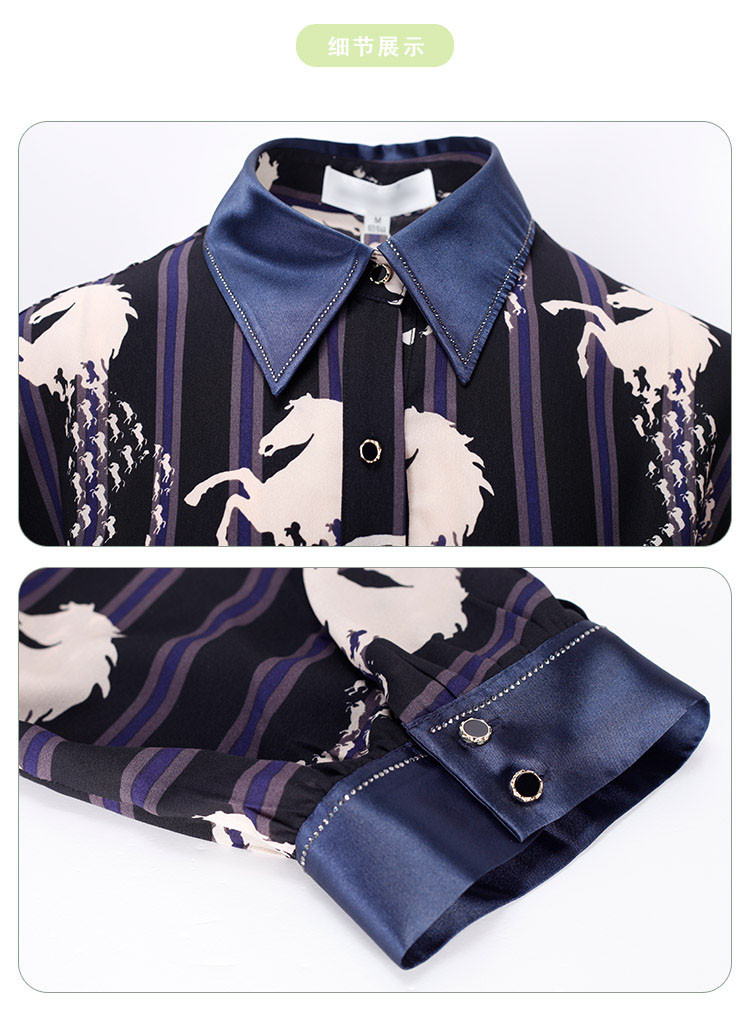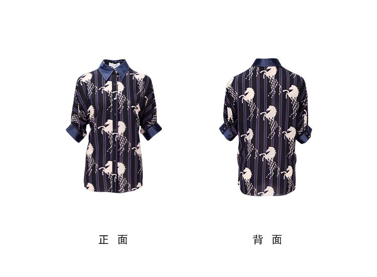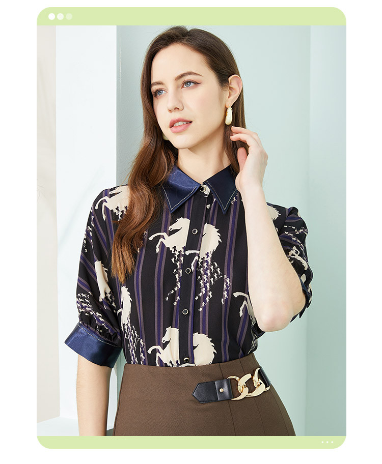 商品名称:商场同款秋季优雅飞马撞色印花气质翻领烫钻5分袖衬衣 213599