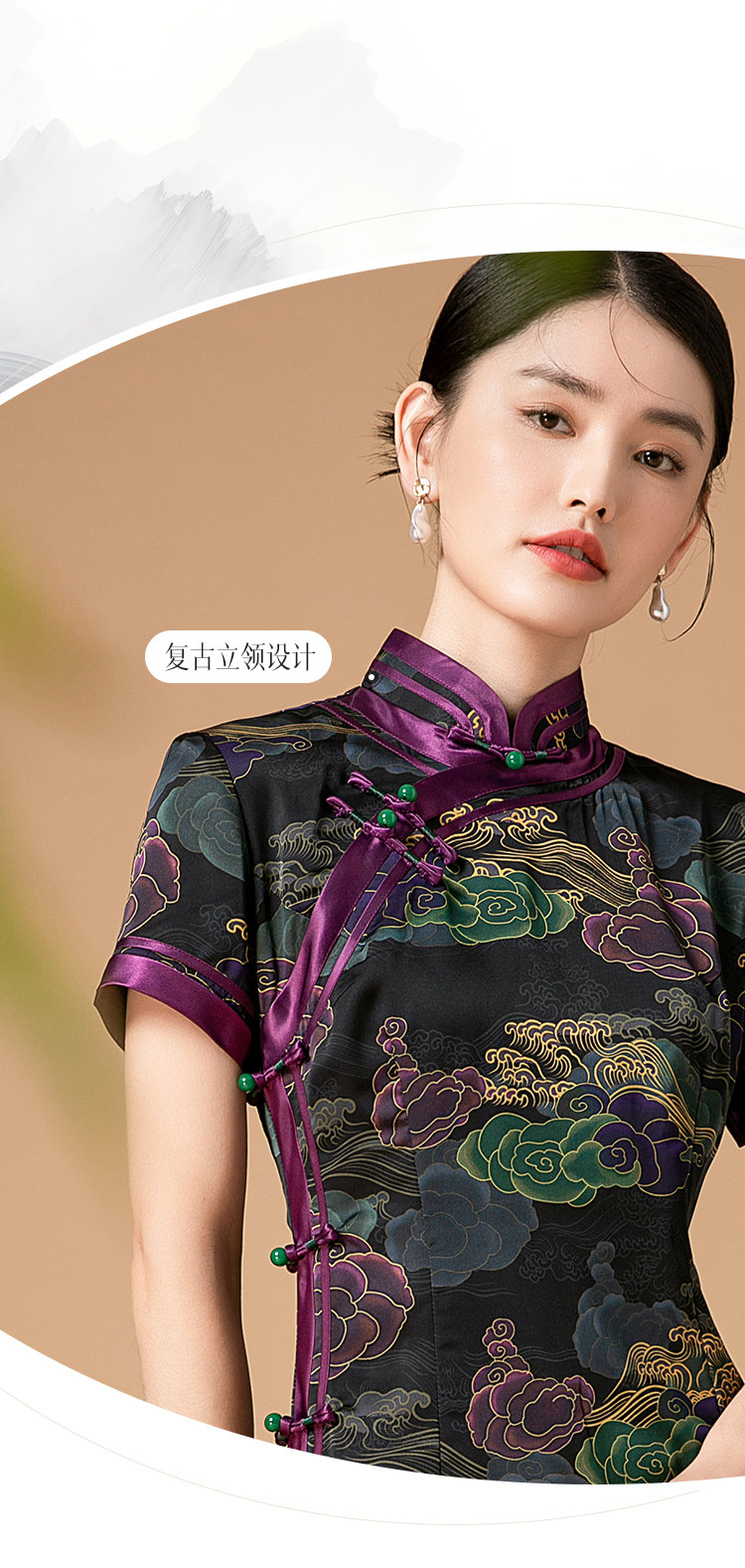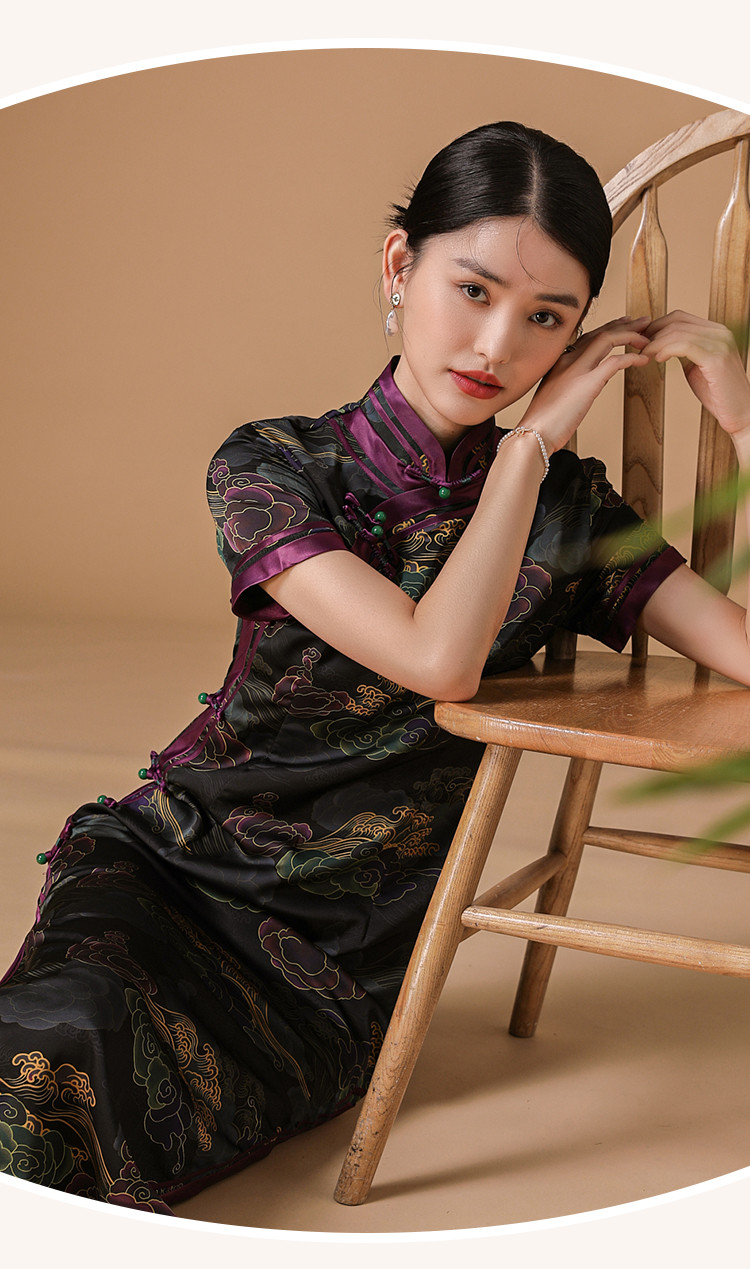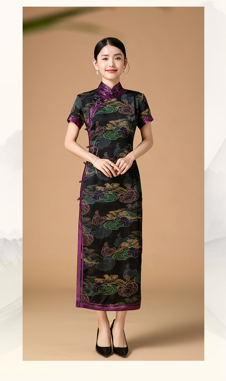 复古日常改良旗袍祥云气质优雅立领中长连衣裙女 186655