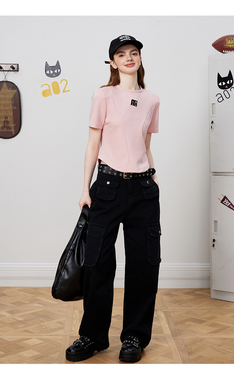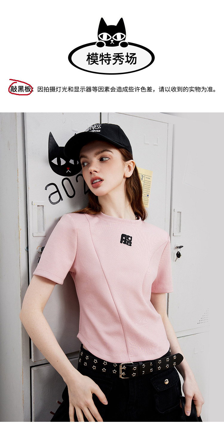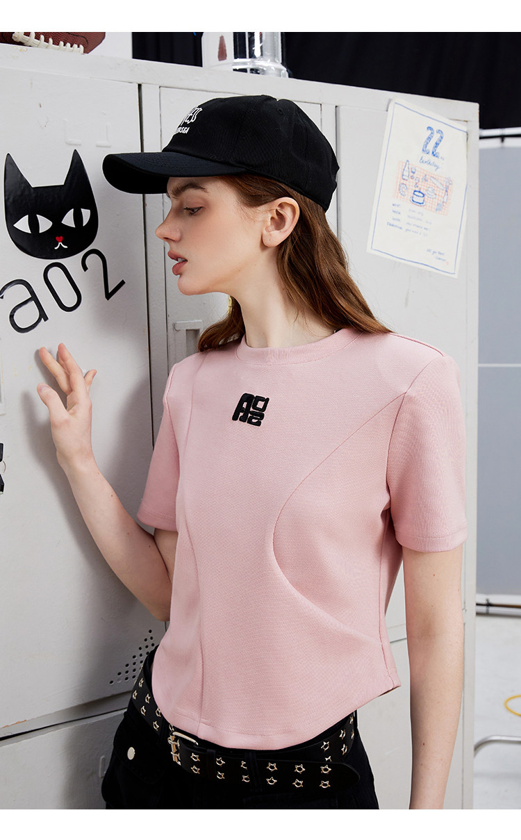 立体刺绣拼接个性时尚潮牌女式T恤夏季正肩圆领短袖上衣 829277