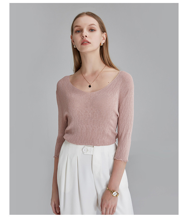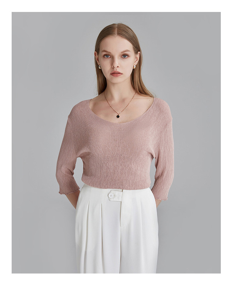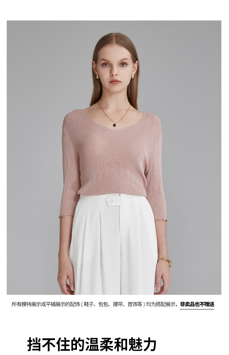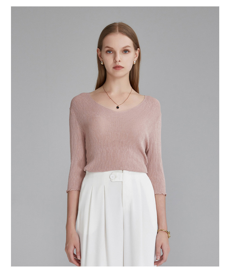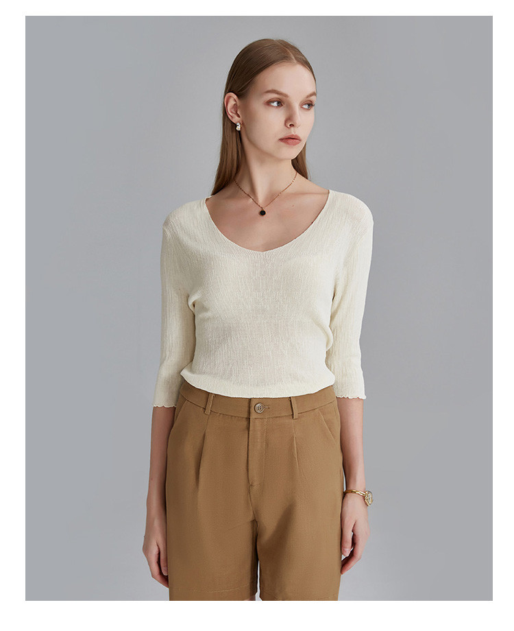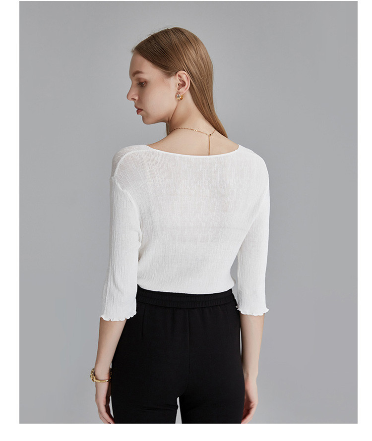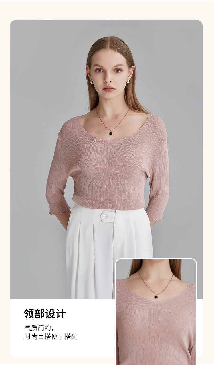 商品名称:春秋新款时尚木耳边内搭女式薄款简约纯色针织衫百搭七分袖上衣 365791