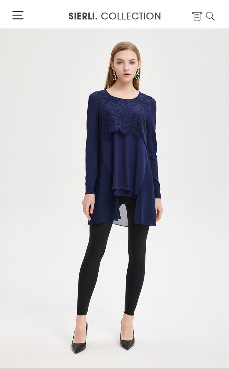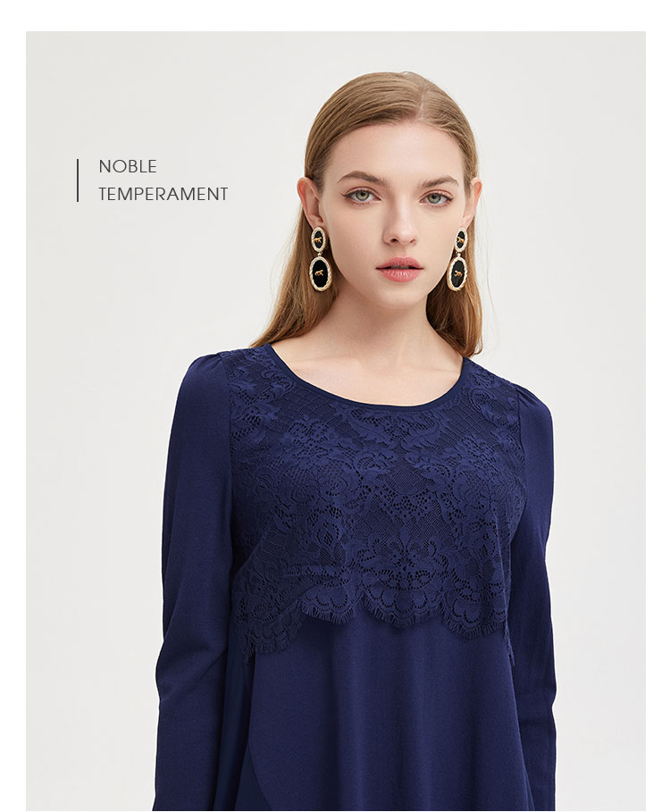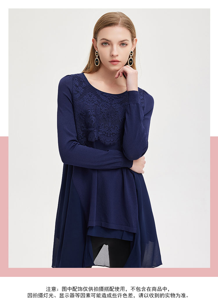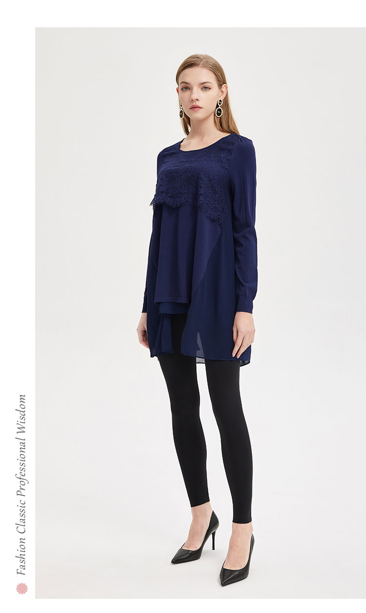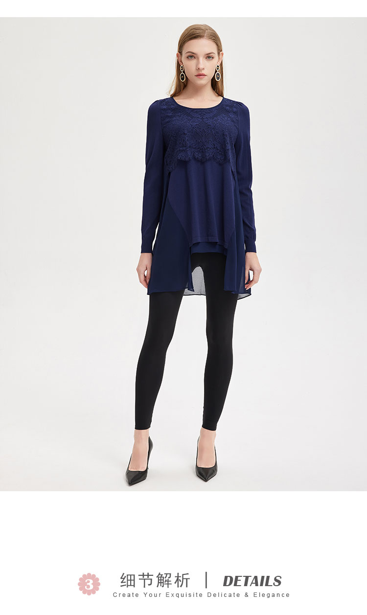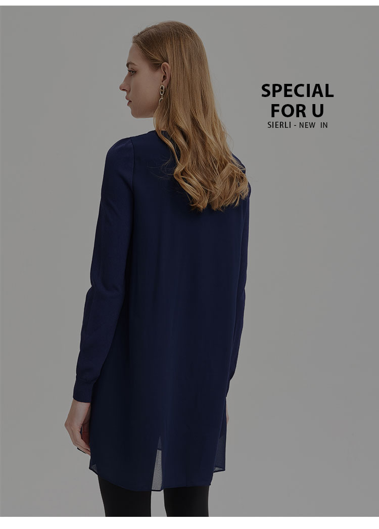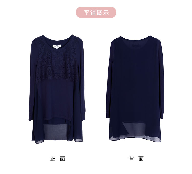 商品名称:春季圆领宽松设计感不规则拼雪纺长上衣前短后长通勤女式上衣 338591
