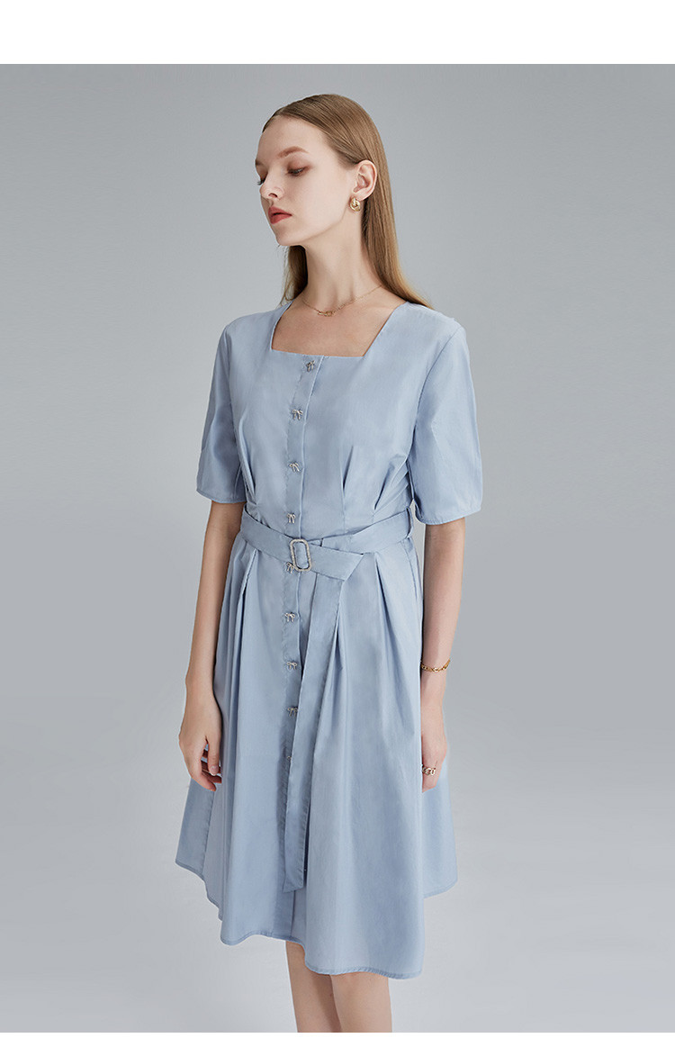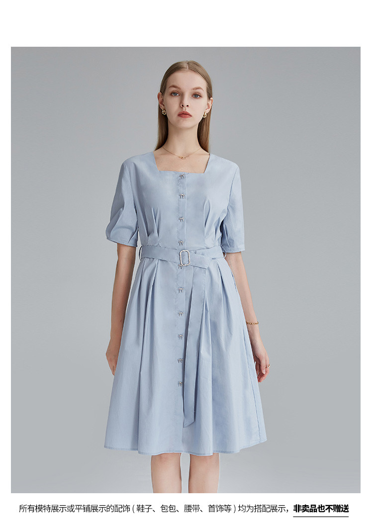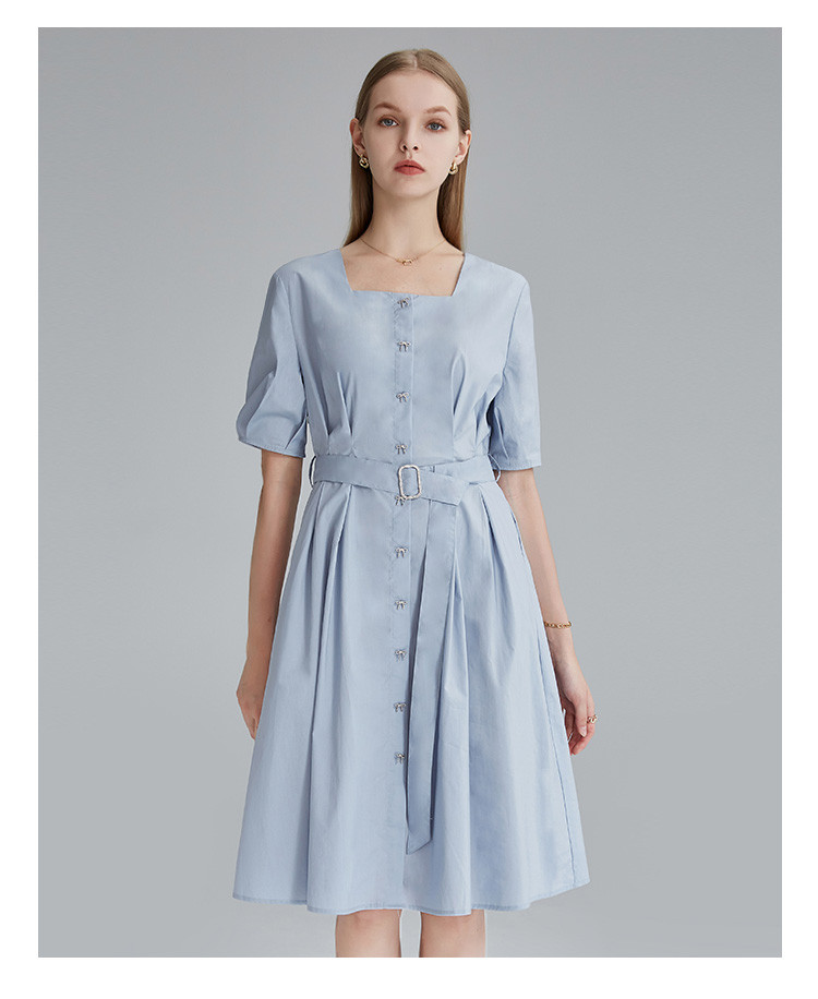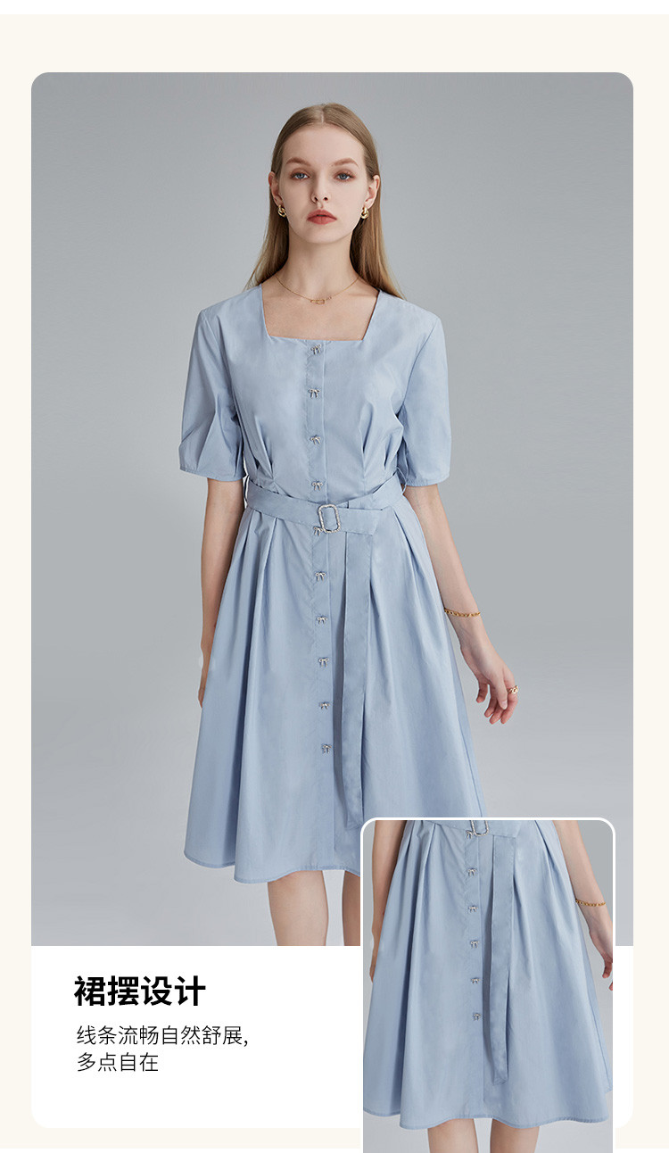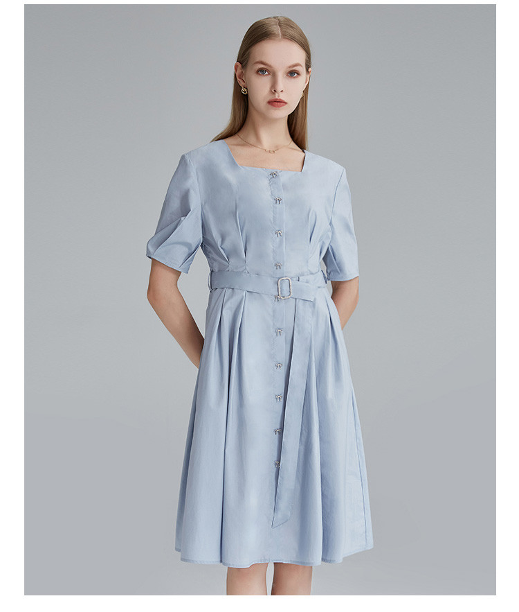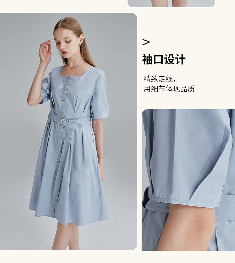 商品名称:【纯棉】夏季新款蝴蝶结纽扣女都市优雅方领系带中长款休闲连衣裙 943007