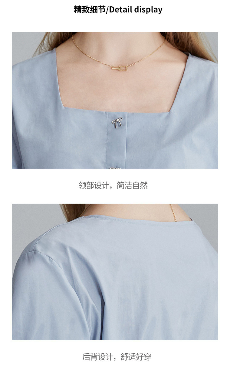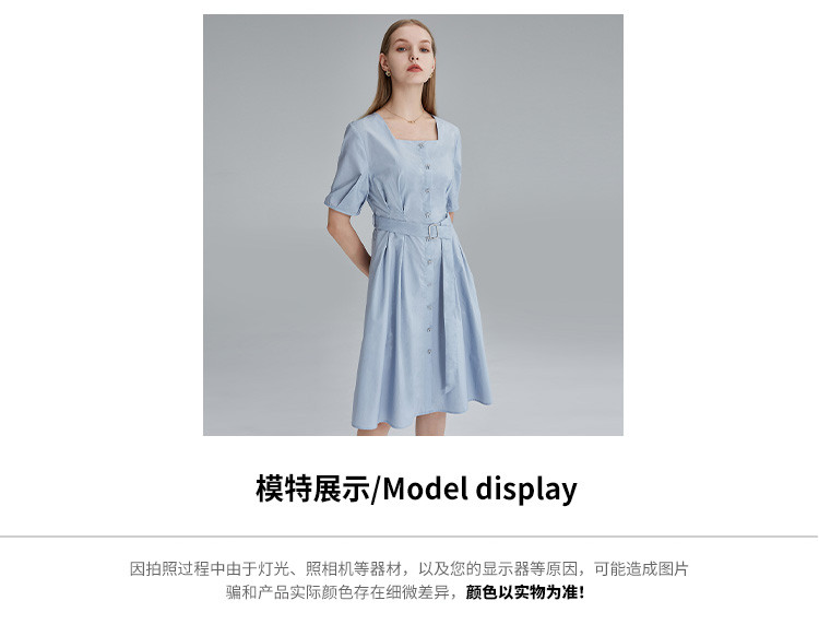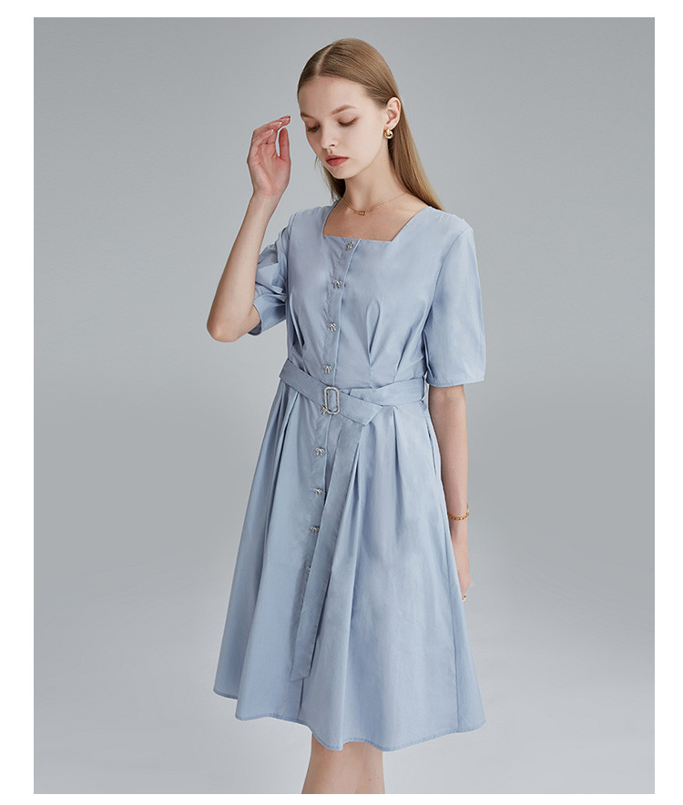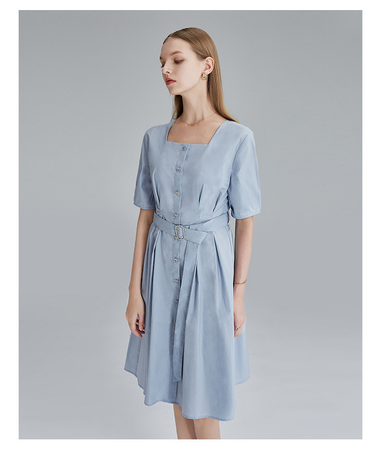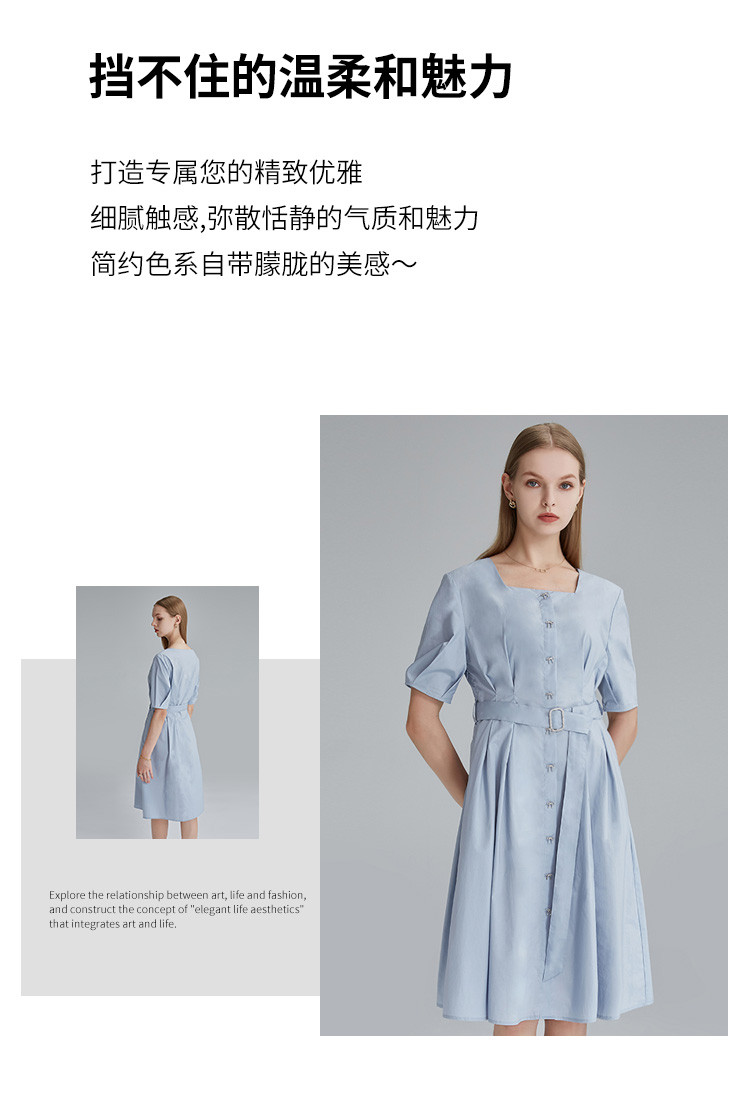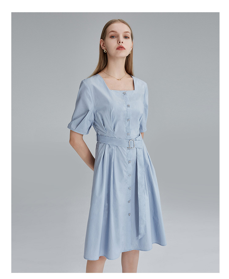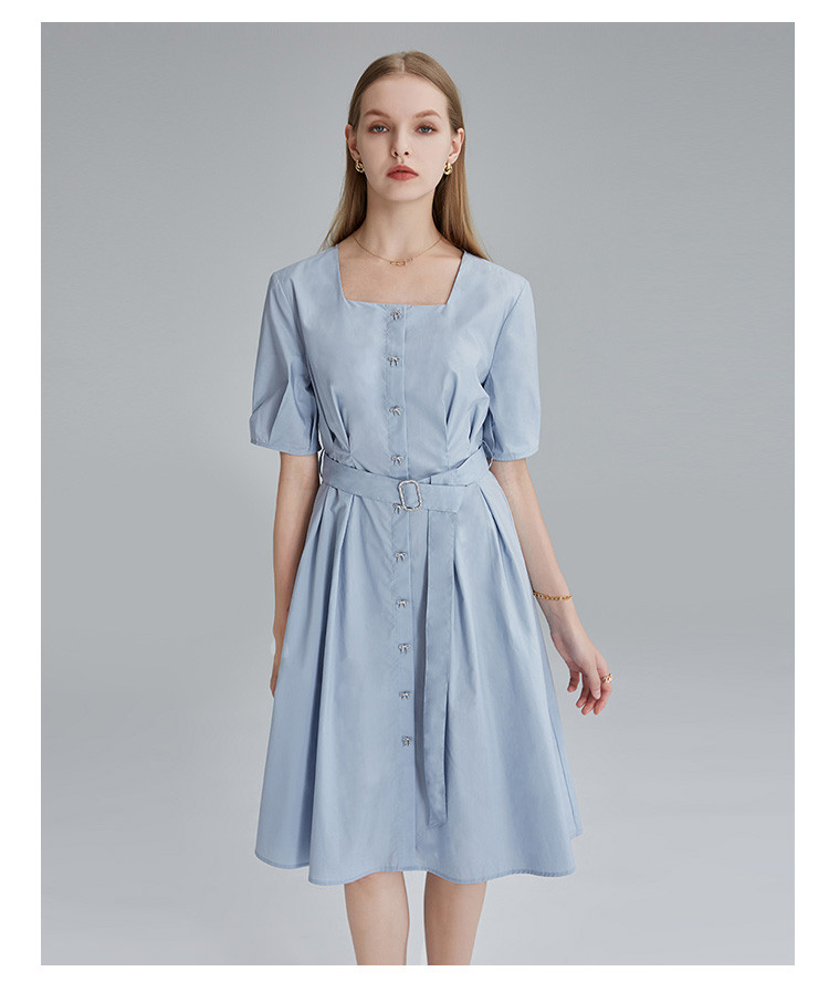 商品名称:【纯棉】夏季新款蝴蝶结纽扣女都市优雅方领系带中长款休闲连衣裙 943007