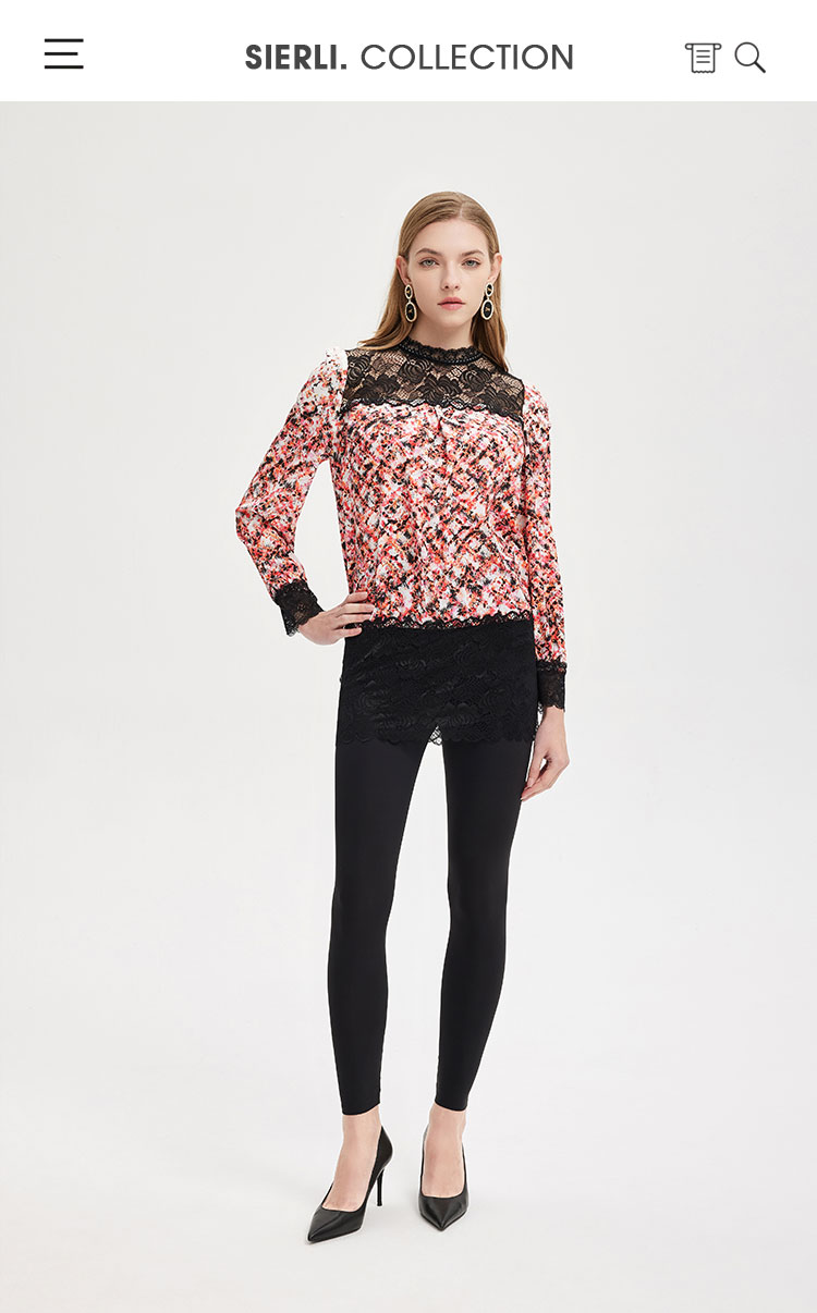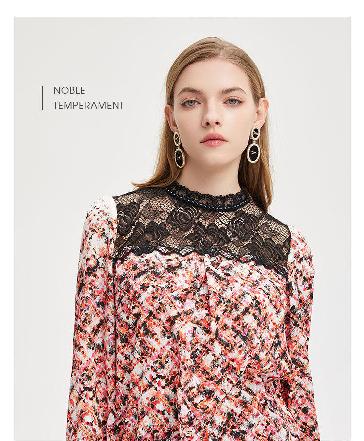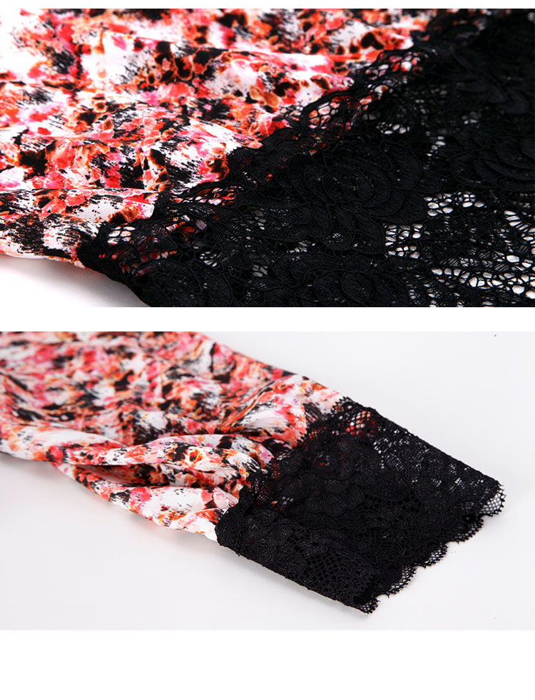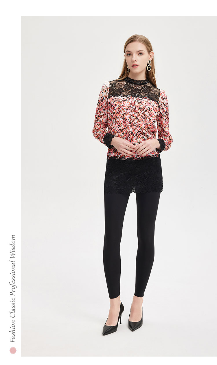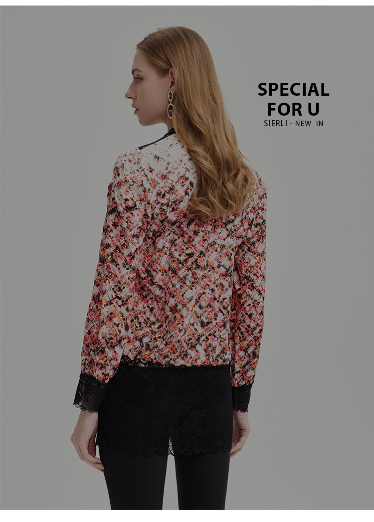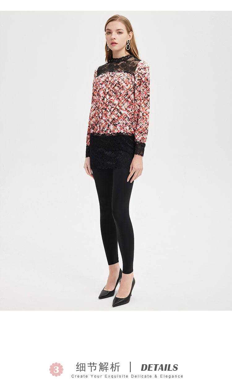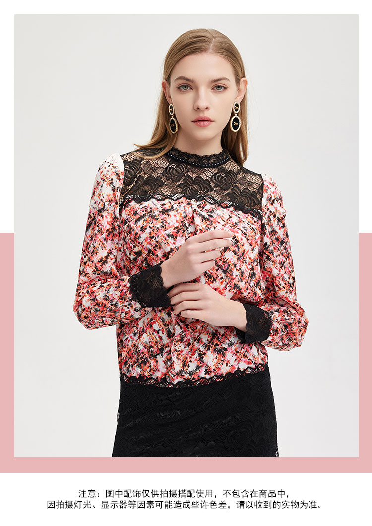 春季浪漫碎花印花袖口领口下摆蕾丝拼接温柔气质上衣 080543